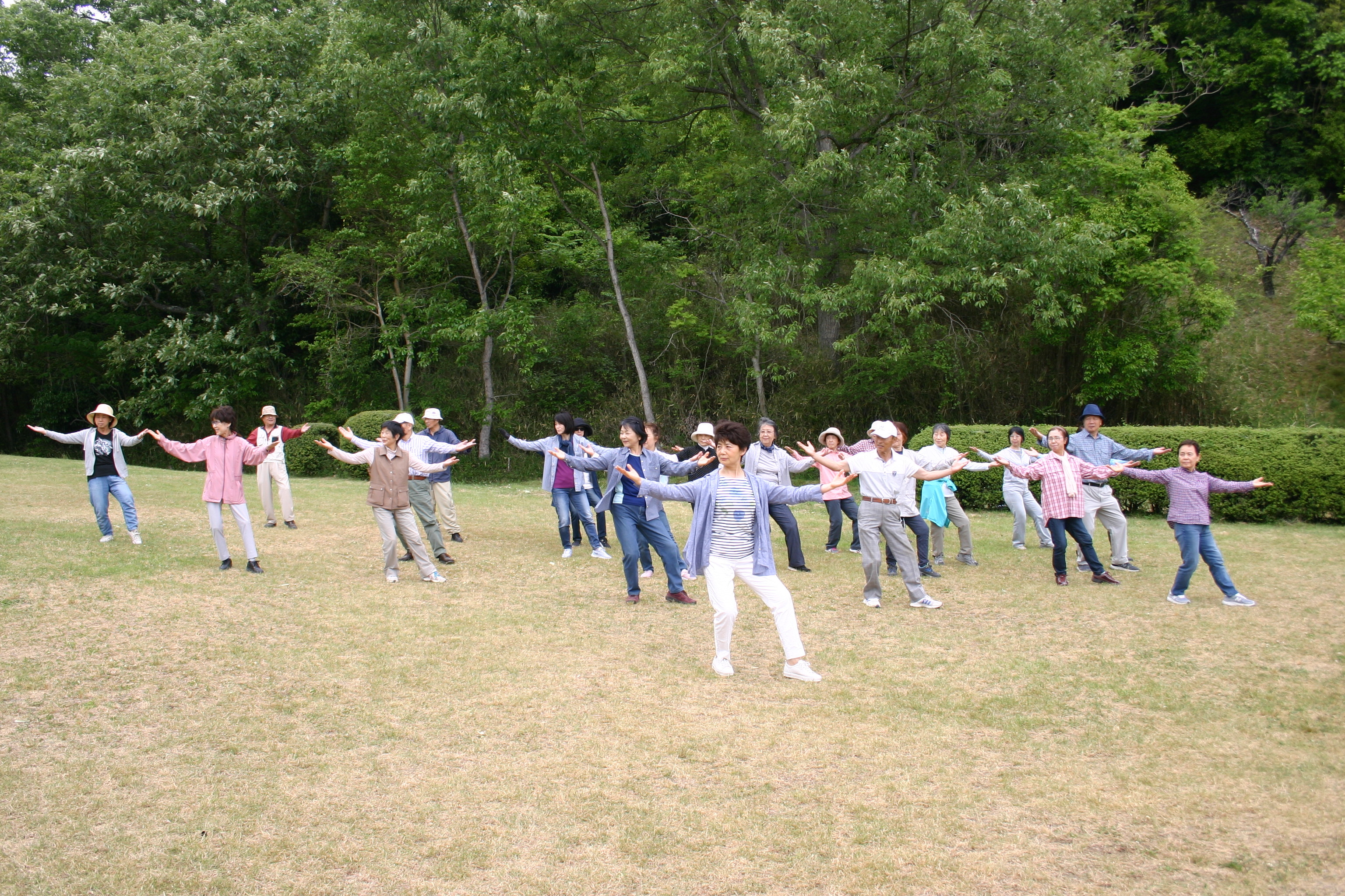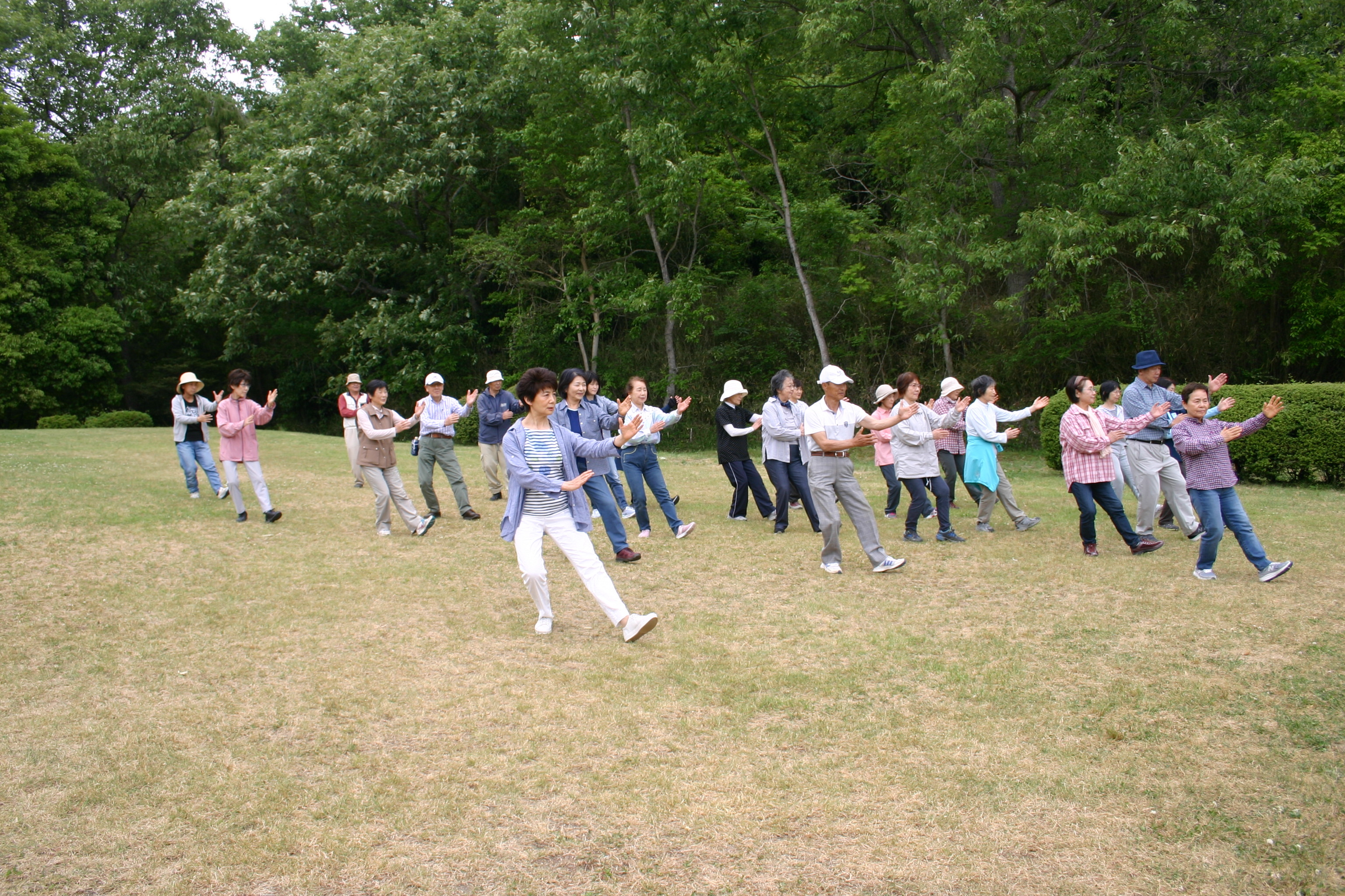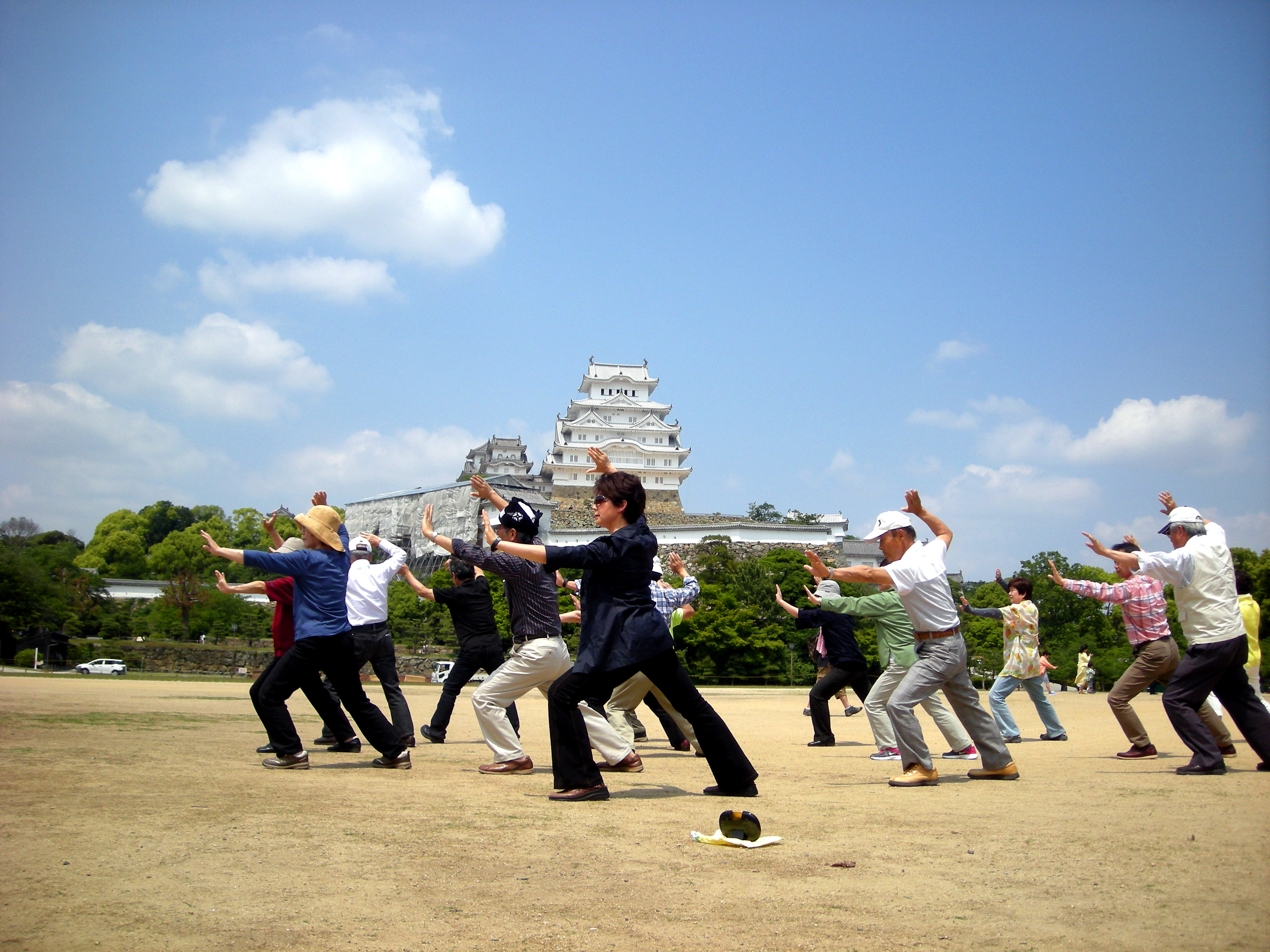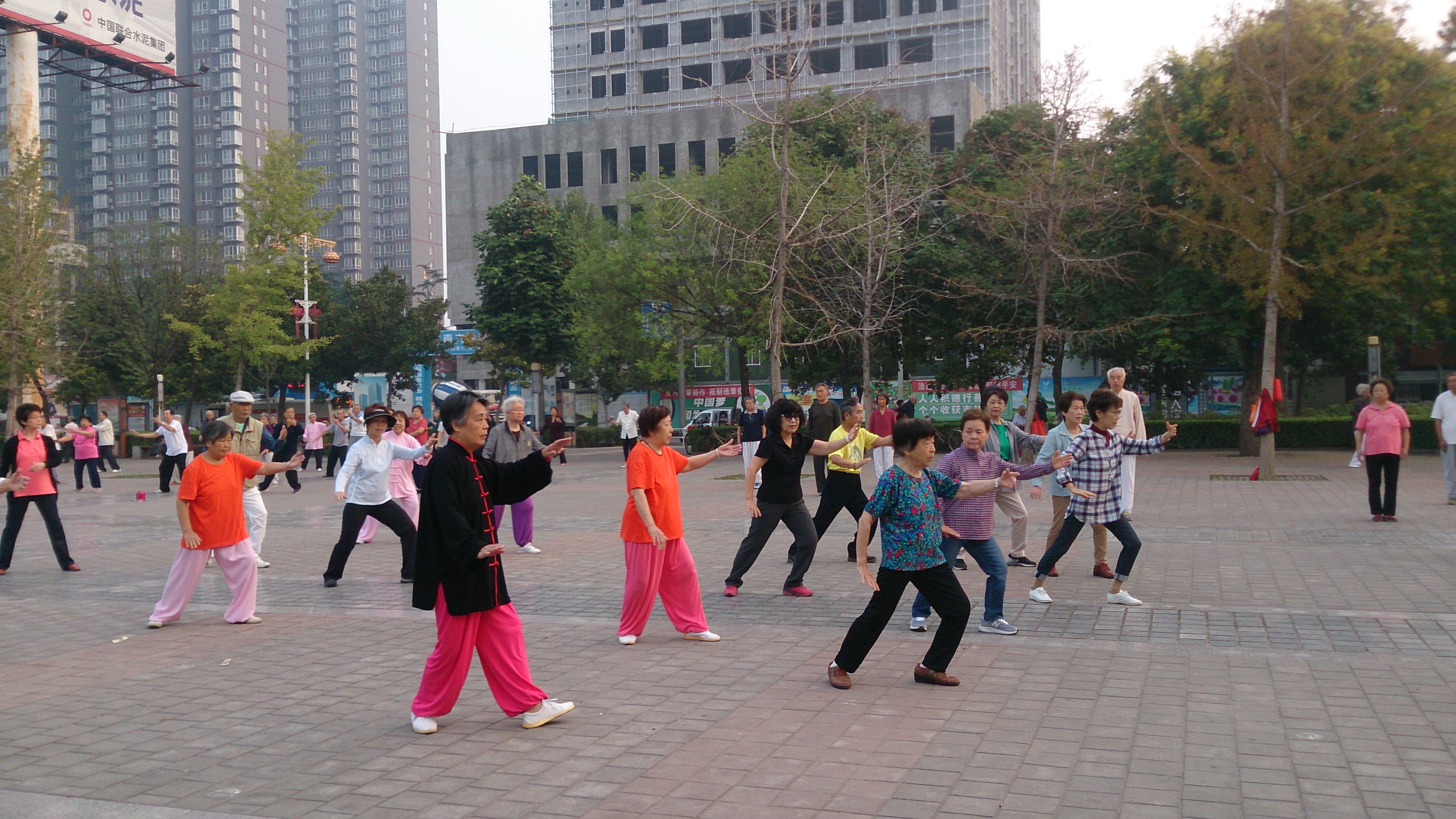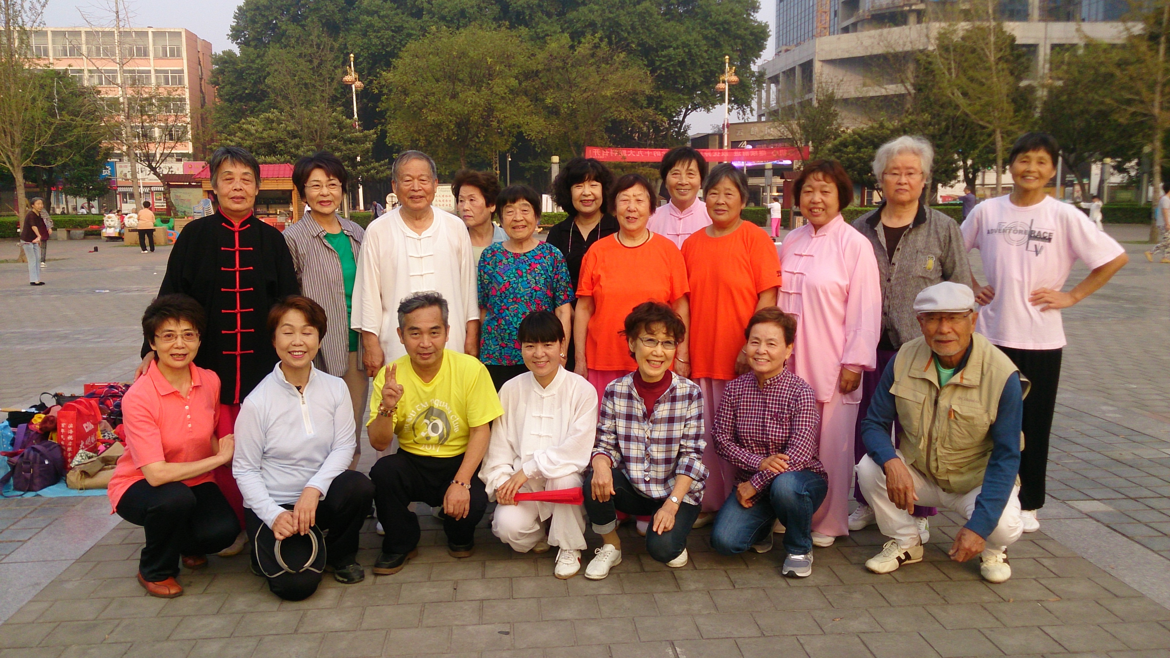洛陽は牡丹の花で有名で、毎年4月には牡丹祭りが開催され、世界各国から観光客が押し寄せます。宿泊ホテルの目の前には牡丹広場があり、翌朝は当地太極拳愛好者と交流を求めて繰り出しました。そこでは音楽に合わせてダンスを踊っていたり、スポーツをしたり、様々なグループが多彩な活動を展開していました。広場を更にずんずん進んで行くと、数組のグループが太極拳をやっていました。さっそくその1グループに声を掛けると快く受け入れてくれました。24式や太極扇などいくつかの種目を一緒に演武し、最後は和やかに記念撮影、団員一同大満足でした。