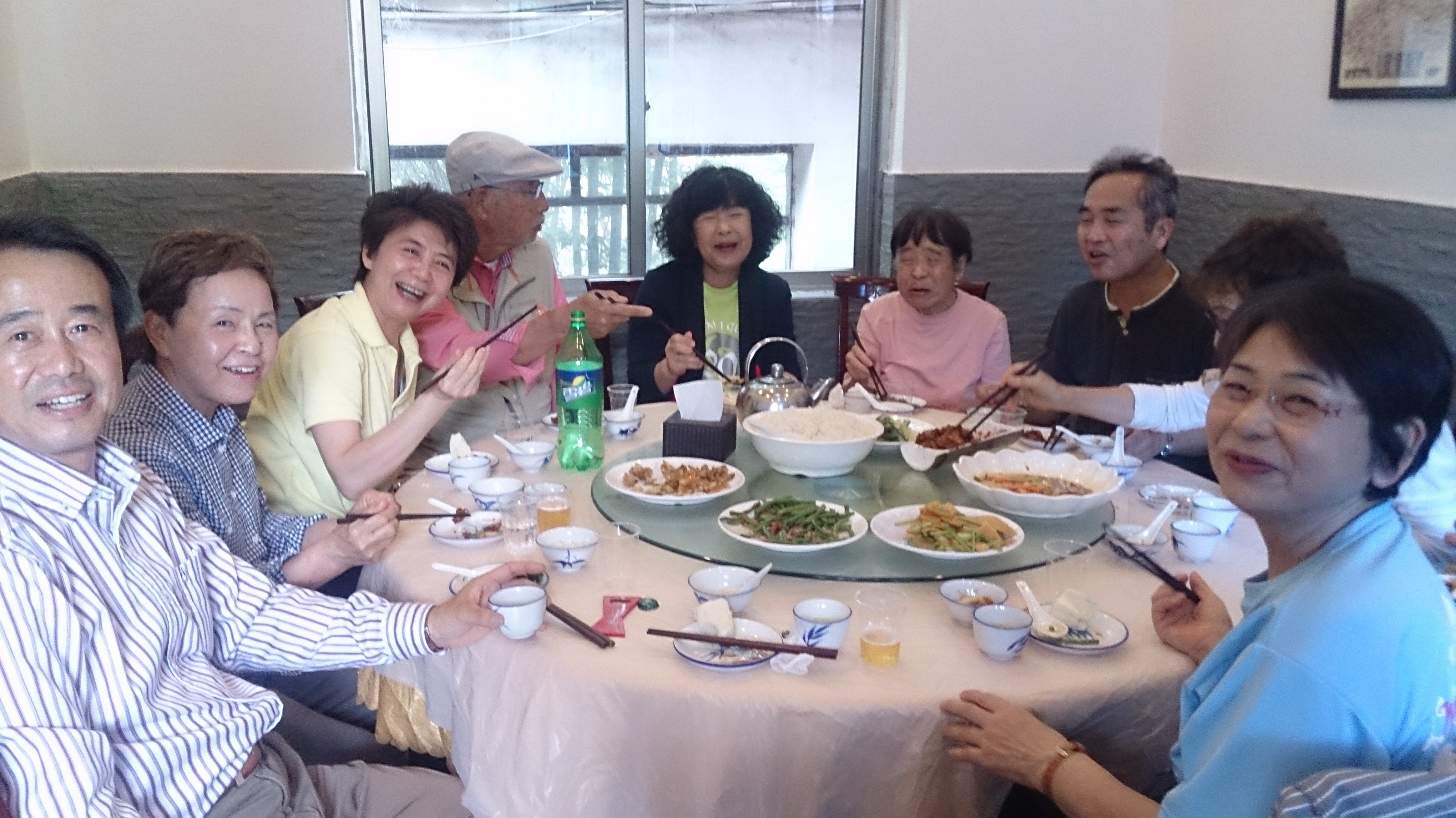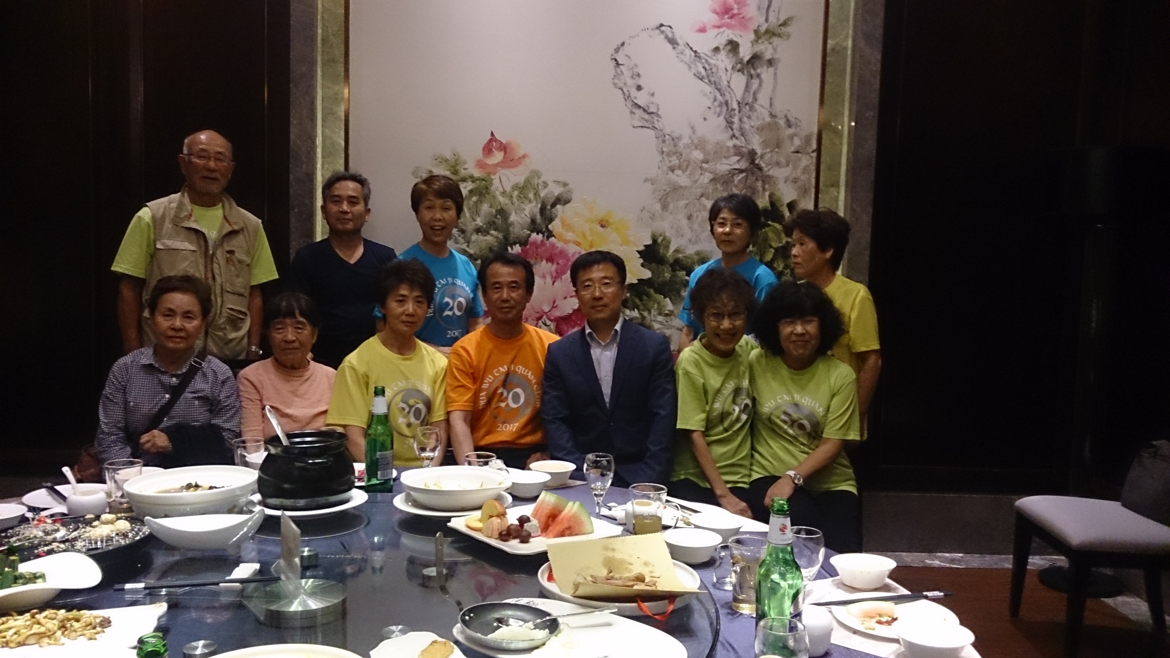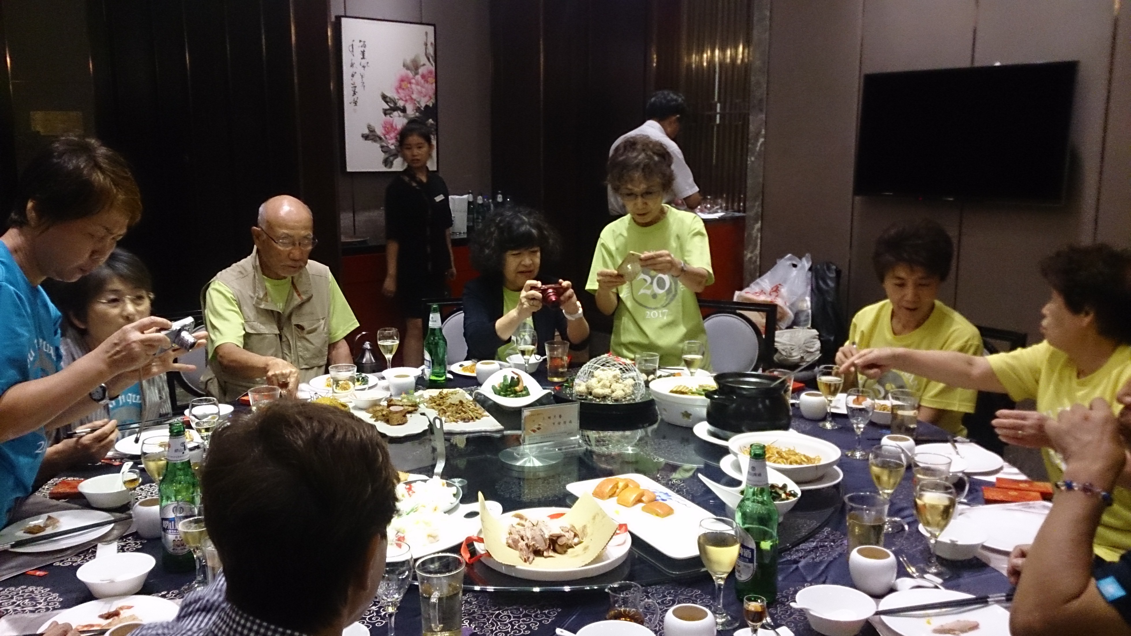 さて、今回の参加メンバーは基本的に華武太極拳クラブに所属しているとはいえ、教室が違えば初対面の方もいらっしゃいます。それでも一日行動を共にしていれば少しずつ各々の人となりなどが分かってきます。そして、実は恐るべきパワーを秘めた集団であることが、最初の夕食時点で早くもその片鱗を現しました。テーブルに料理が運ばれて来ると、歓声とともに「何これ?」と言いながら一斉に写真撮影が始まり、次の瞬間には猛然と箸を伸ばし、「美味しい!」「これもいける!」と回転テーブルがグルグルと回るのでした。これも太極拳で鍛えた発勁のなせる技でしょう。