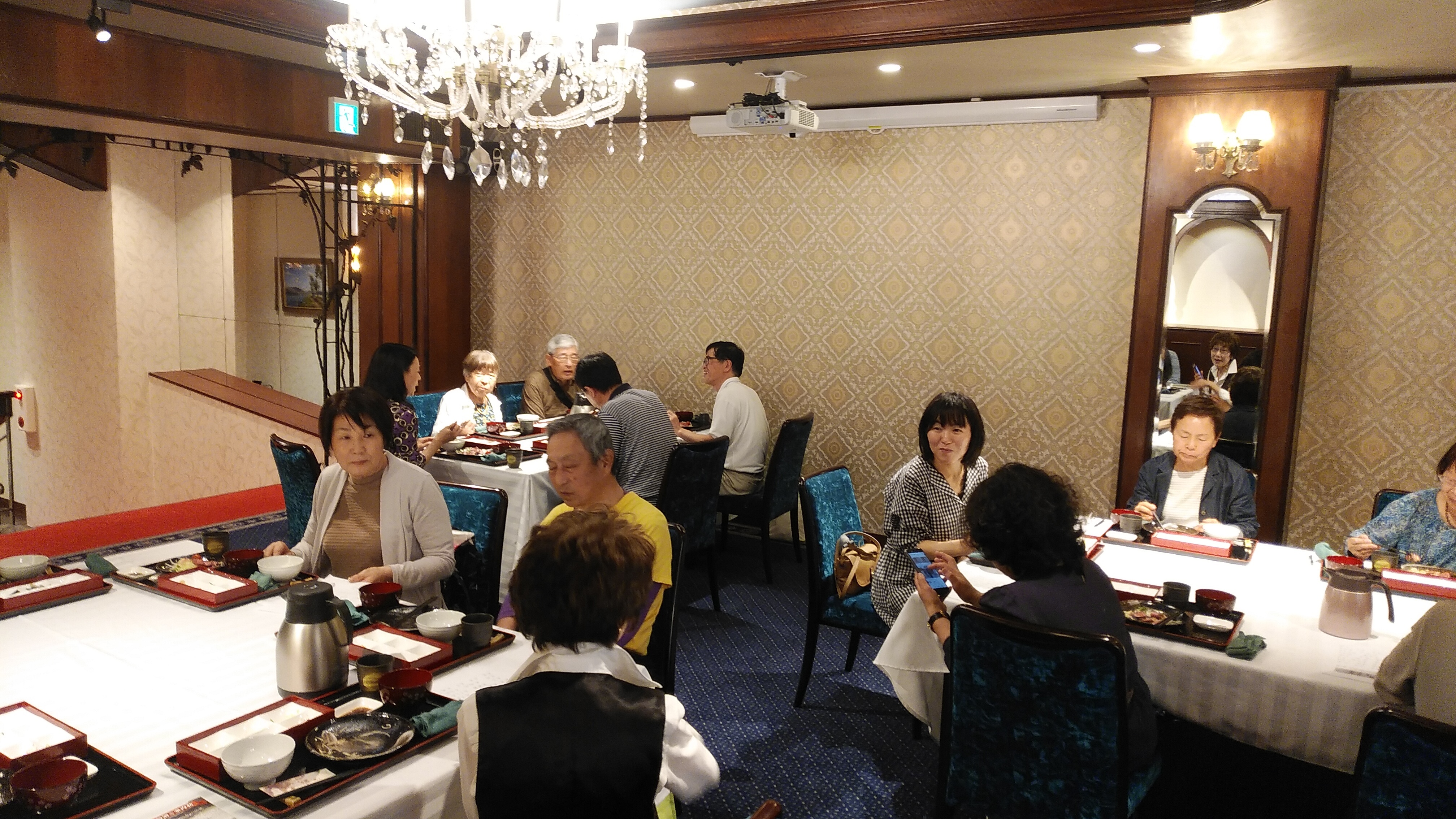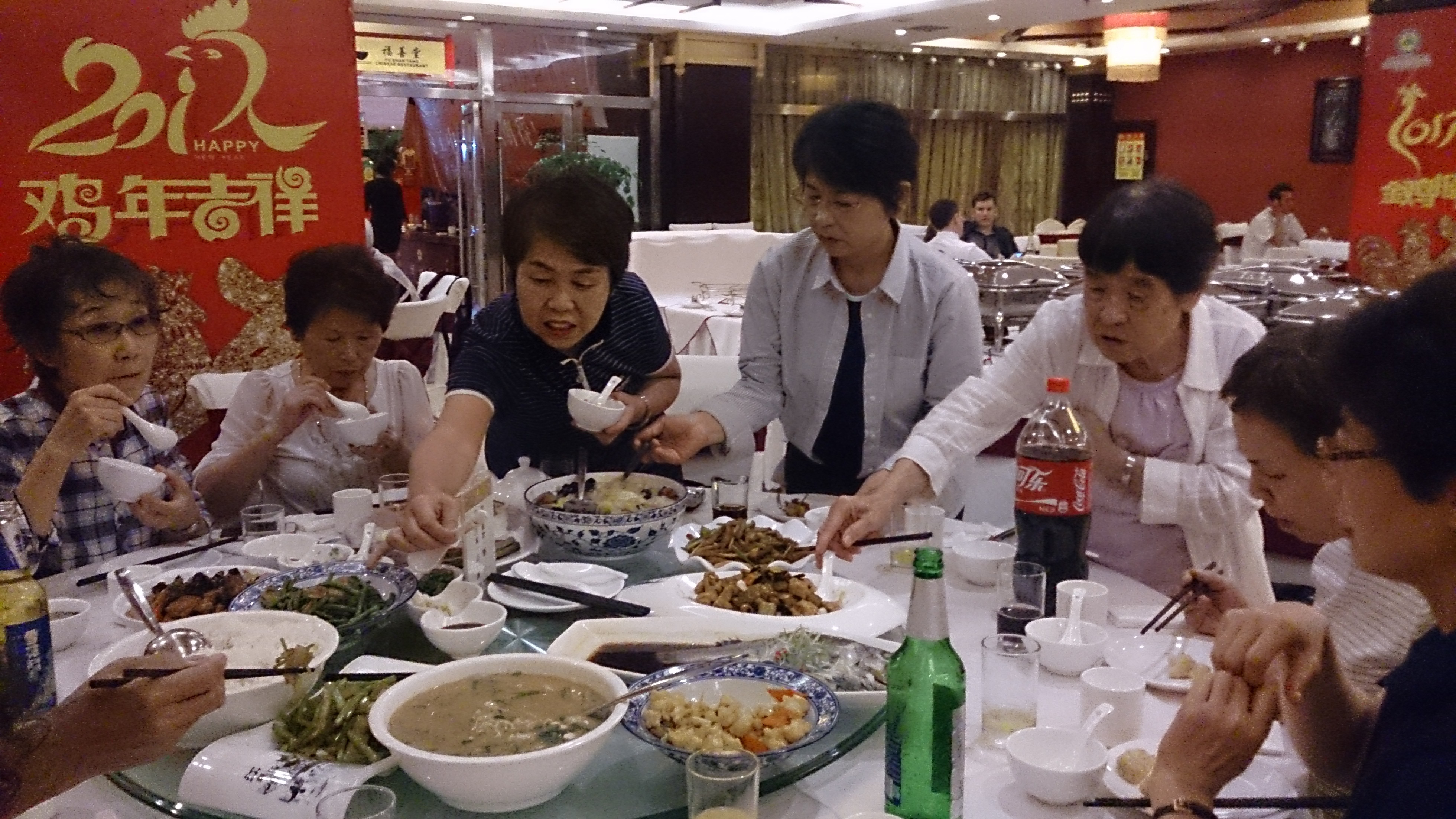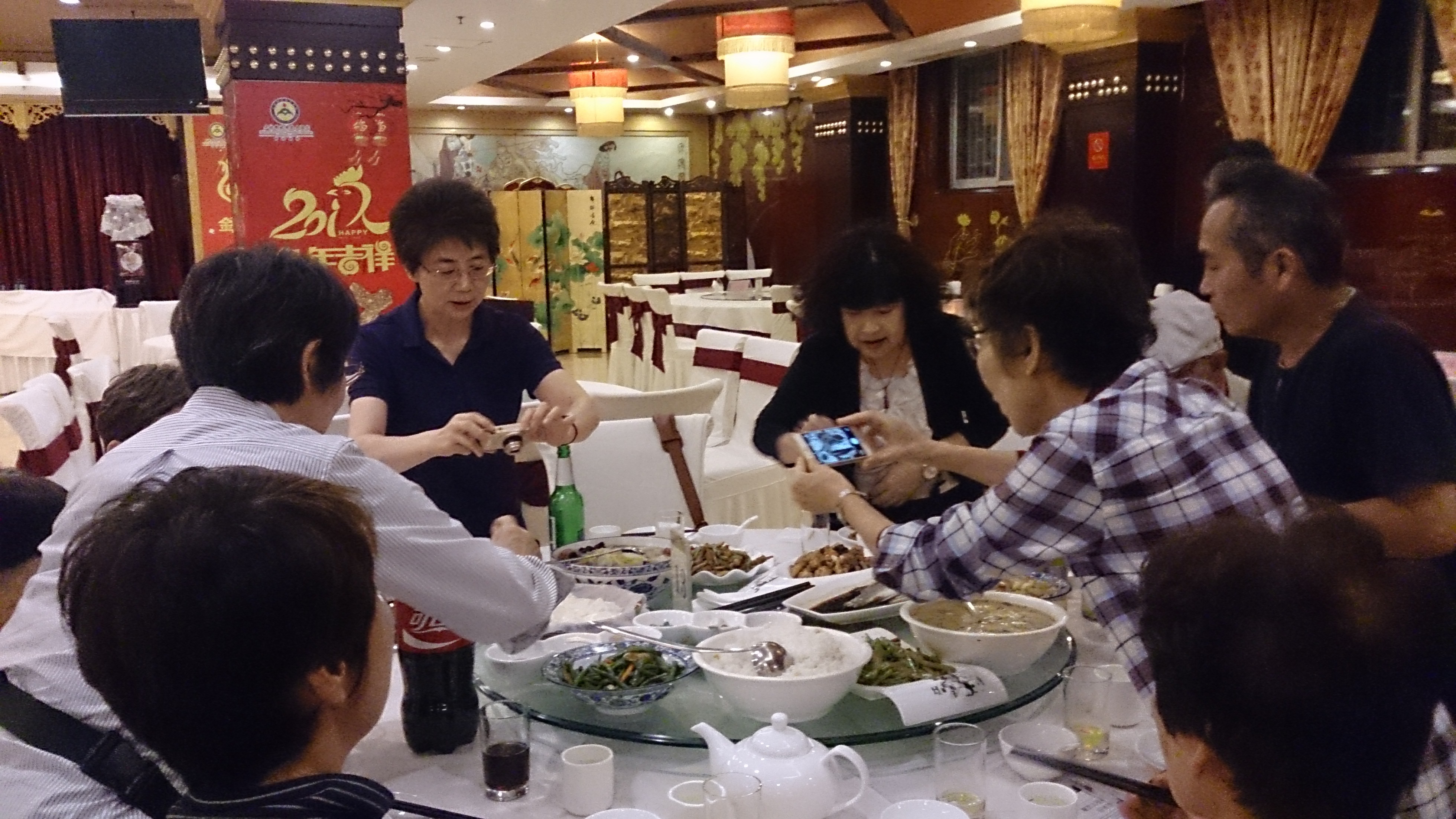 さて、今回の参加メンバーは基本的に華武太極拳クラブに所属しているとはいえ、教室が違えば初対面の方もいらっしゃいます。それでも一日行動を共にしていれば少しずつ各々の人となりなどが分かってきます。そして、実は恐るべきパワーを秘めた集団であることが、最初の夕食時点で早くもその片鱗を現しました。テーブルに料理が運ばれて来ると、歓声とともに「何これ?」と言いながら一斉に写真撮影が始まり、次の瞬間には猛然と箸を伸ばし、「美味しい!」「これもいける!」と回転テーブルがグルグルと回るのでした。これも太極拳で鍛えた発勁のなせる技でしょう。