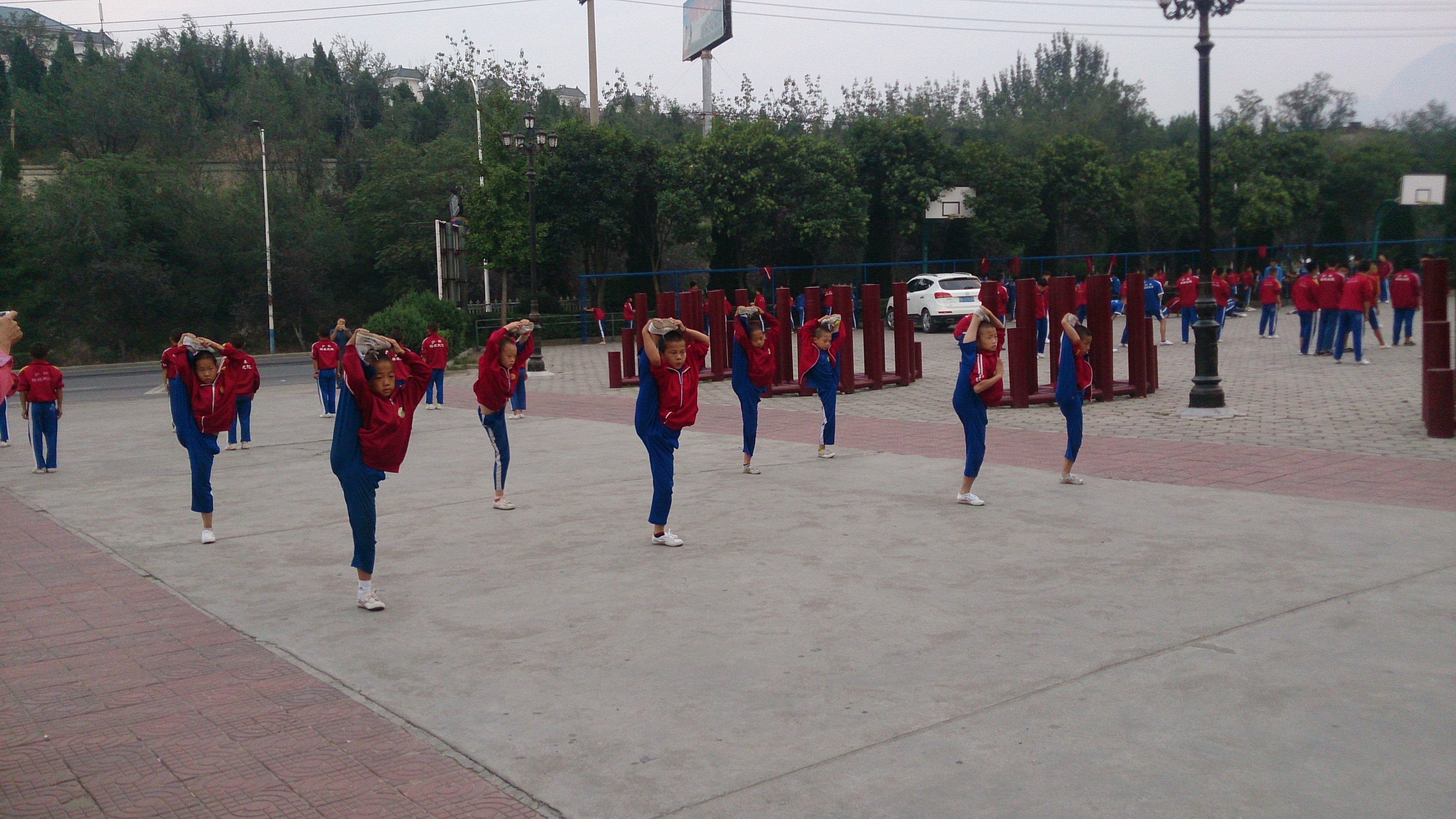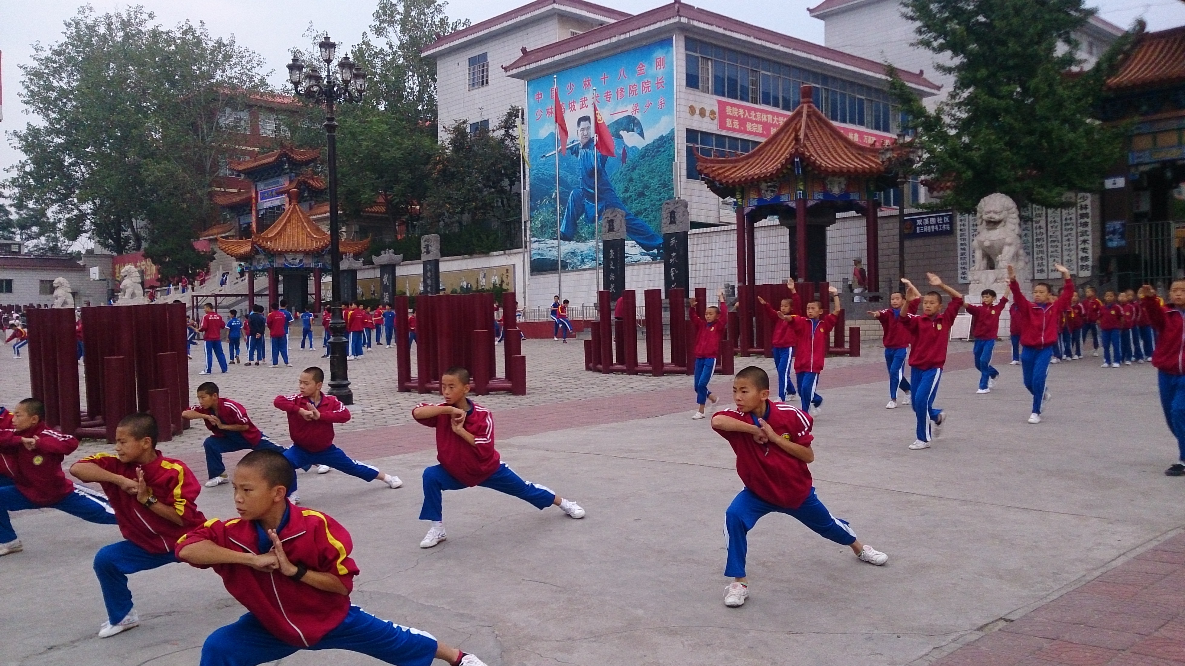 80年代に少林寺がカンフー映画の舞台となり大ブームを巻き起こしました。少林寺のある登封には、その後多くの武術学校が設立され、中国全土から少林拳に憧れる子供たちが集まり、今では10万人もの学生が少林拳を学んでいるということです。私たちが初日泊まった禅武大酒店は、その中でも有力な武術学校が経営するホテルで、隣接する学校前の広場で早朝練習があると聞き、さっそく翌朝朝食前に集合し、見学に行くことにしました。