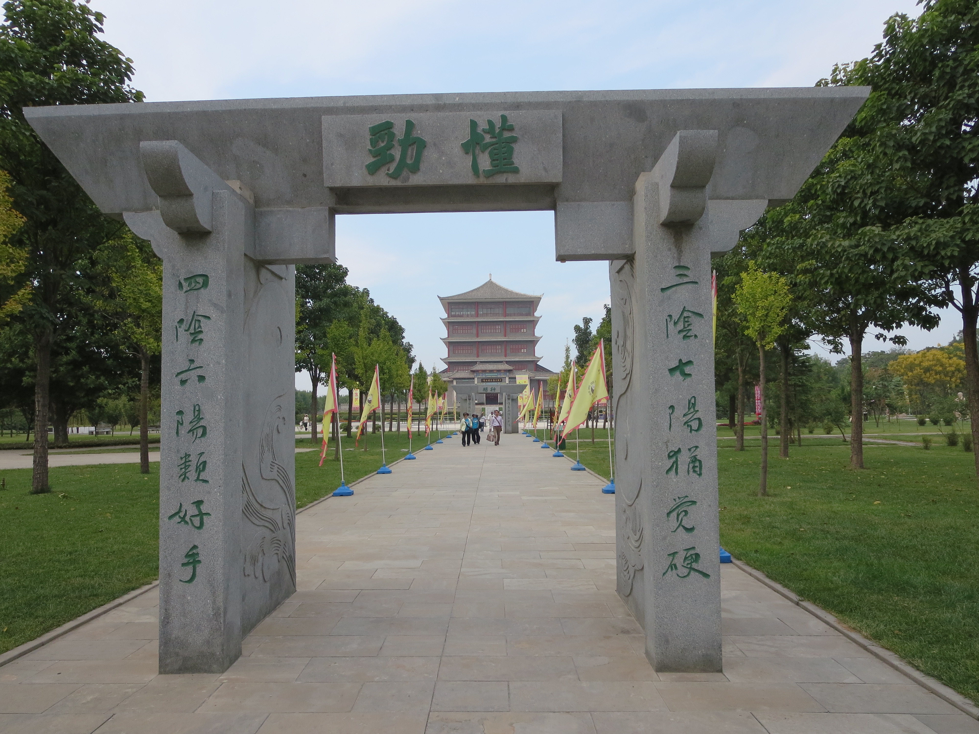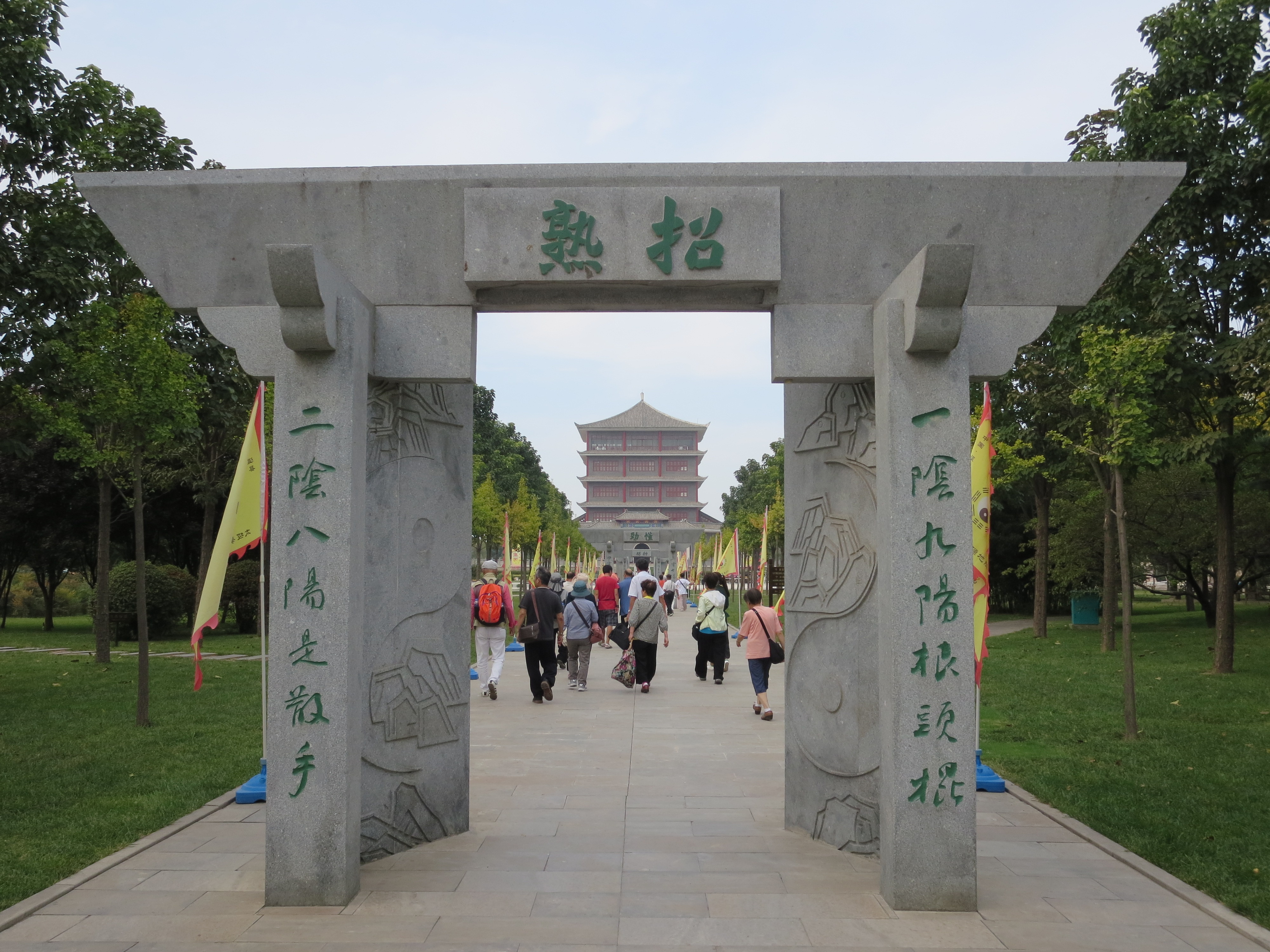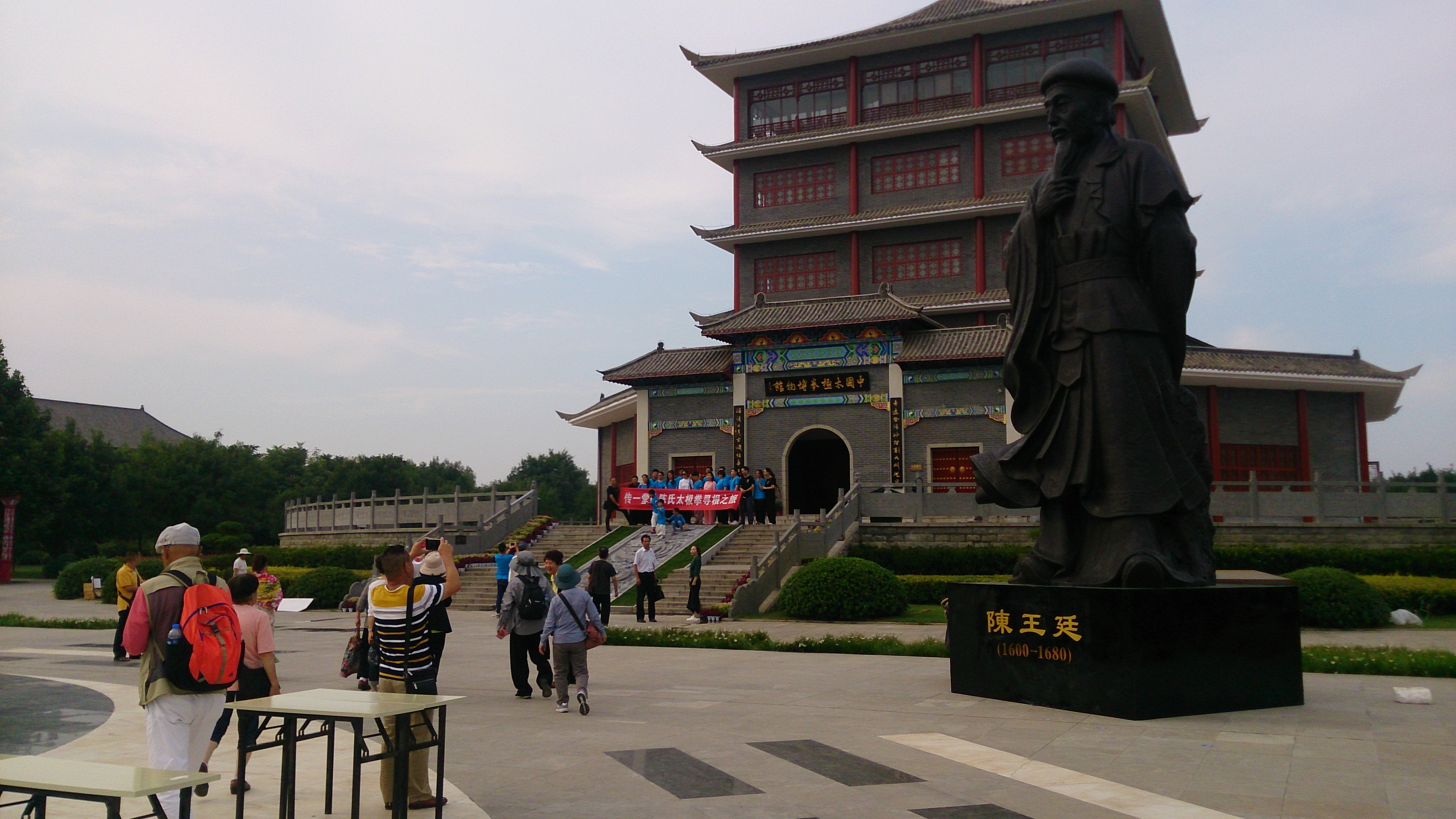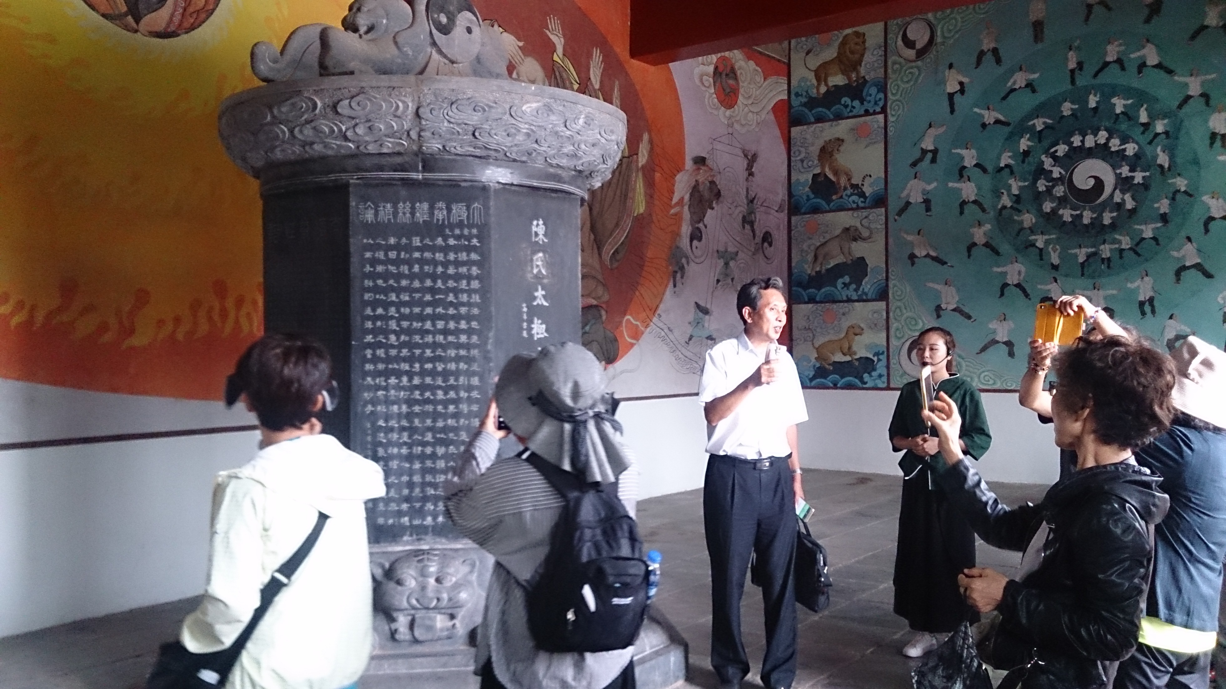 最初に見学したのは「太極拳祖祠」で陳氏の一族を祀った場所でした。太極拳の起源や理論を記した石碑の説明を受けた後、奥に高く聳える「中国太極拳博物館」目指して歩いて行くと3つの門を通りました。この門こそ太極拳を極めるために通る3つの段階「招熟」「懂勁」「神明」を示したものでした。開きかけた最初の扉から、半開、全開となった扉を順に抜けると、そこには太極拳の基礎を確立した始祖陳王廷の銅像が屹立していました。 案内してくれた女性ガイドによると、なんと私たちが訪れた日の午前中に、その銅像の除幕式があったそうです。しかも式典には陳式太極拳伝承者の四天王(陳小旺、陳正雷、王西安、朱天才)やその他流派代表者も出席されていたと言うことでした。愕然としながらも、太極拳の歴史の1ページに間接的にでも触れることのできた感慨に浸るのでした。
