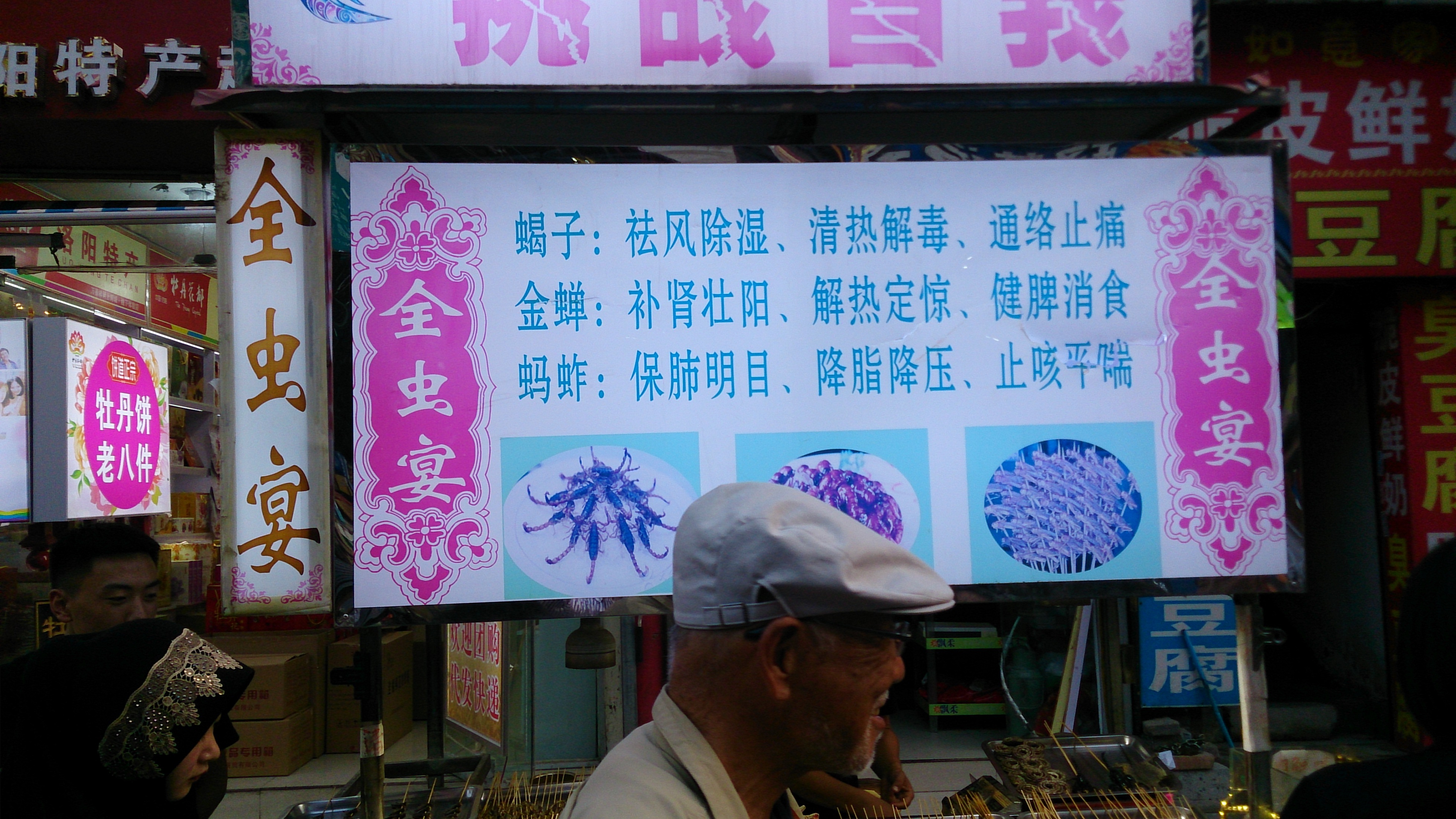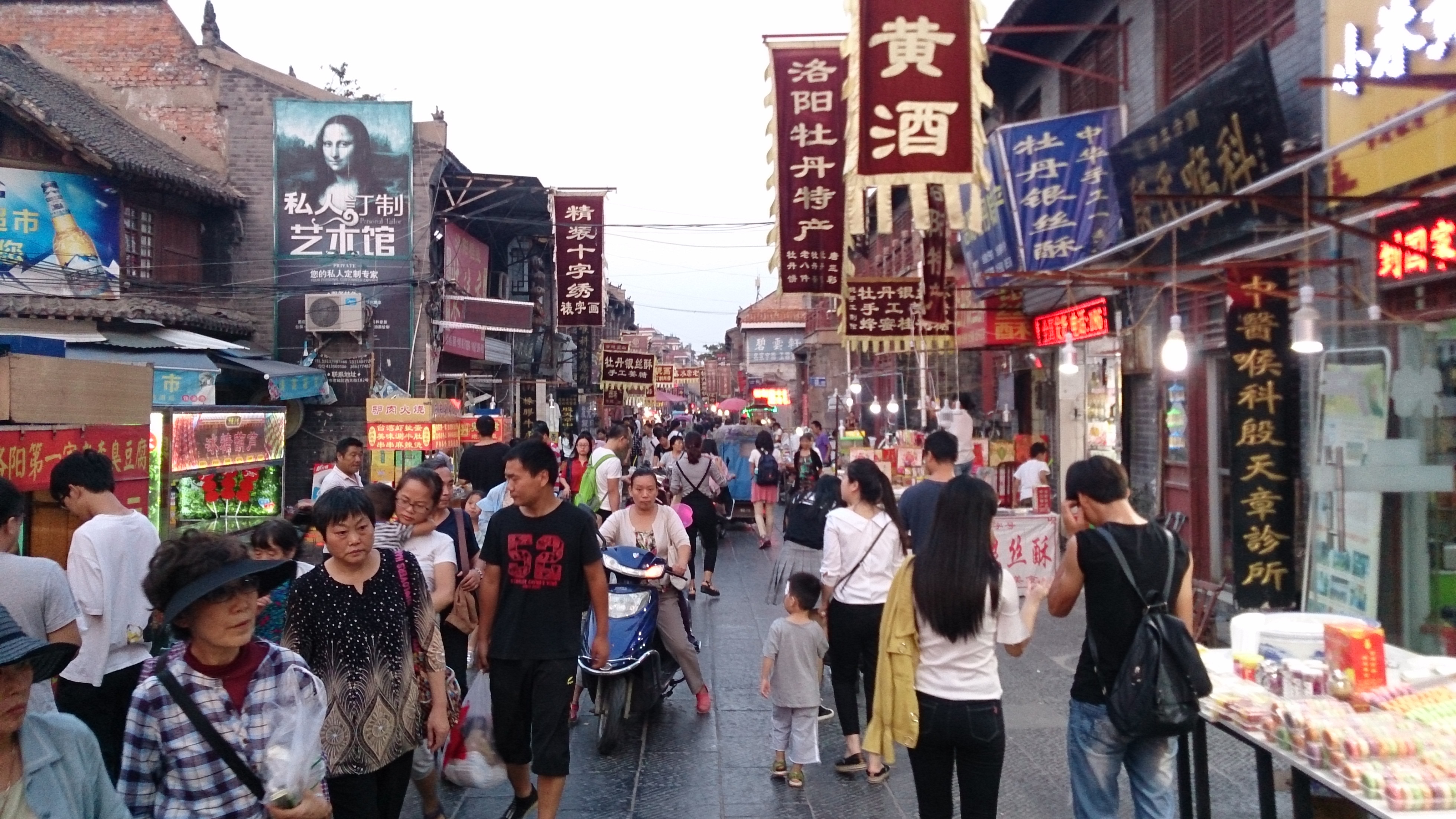 夕方、少し時間の余裕があったこともあり、夕食前に洛陽の古い街「老城区」の中心街を散策することになりました。ところが好奇心旺盛な団員の血が騒ぎ大興奮!昔ながらの喧騒や怪しげな路地裏、雑多な商品、サソリや得体のしれない虫の串刺しを売る屋台など、見ているだけで飽きず、大幅に時間超過することになってしまいました。