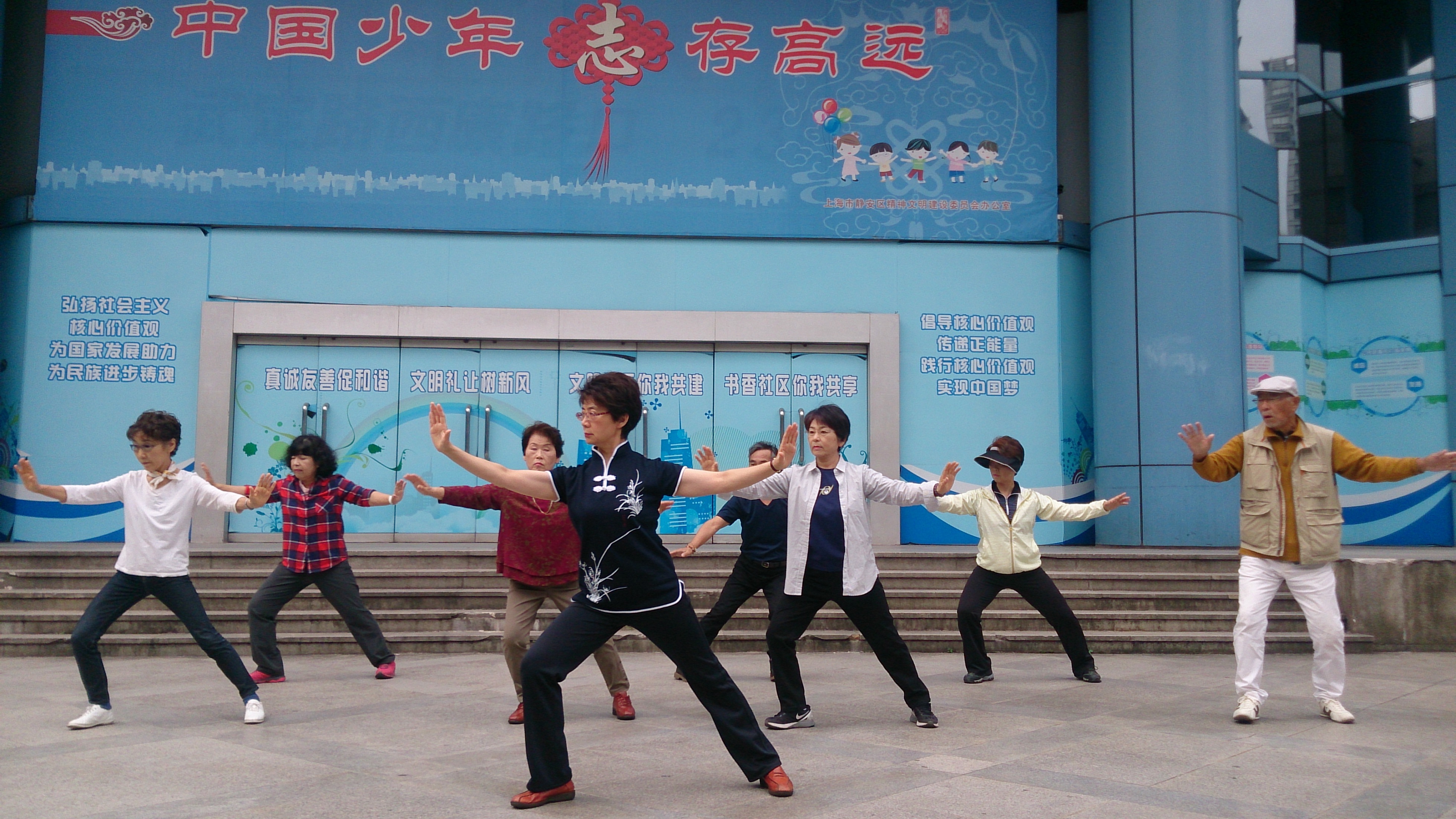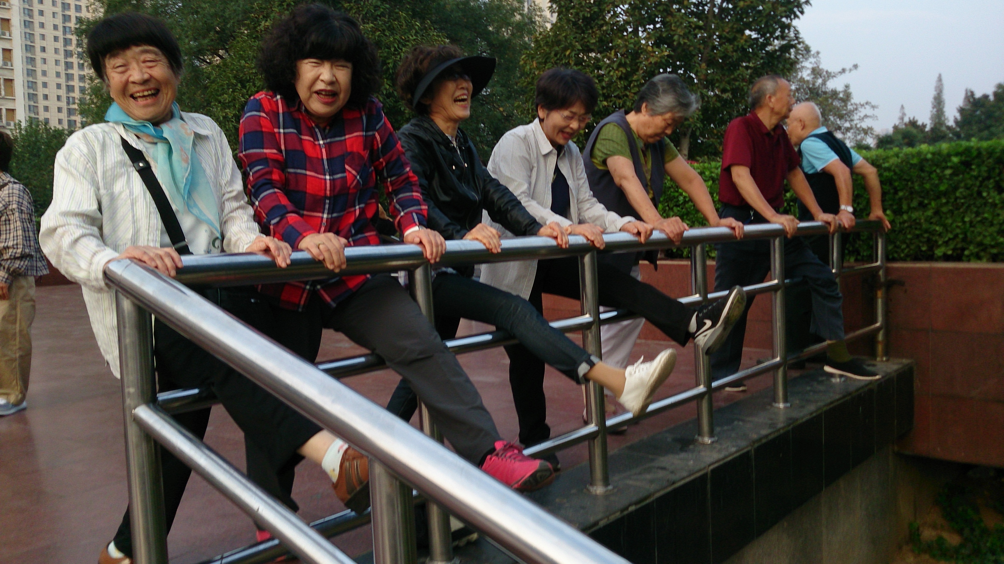 4日目の早朝も牡丹広場に行きました。今度は太極拳以外のグループと交流しようということで、手や脚をパンパンと叩くリズムの心地よい老人体操をやってみたり、広場の欄干を使って「圧腿」をしたりしましたが、その隣でやっていた民族舞踊風のダンスに妙に吸い寄せられ、気が付くと王老師はじめ皆そのグループに入って踊っていました。