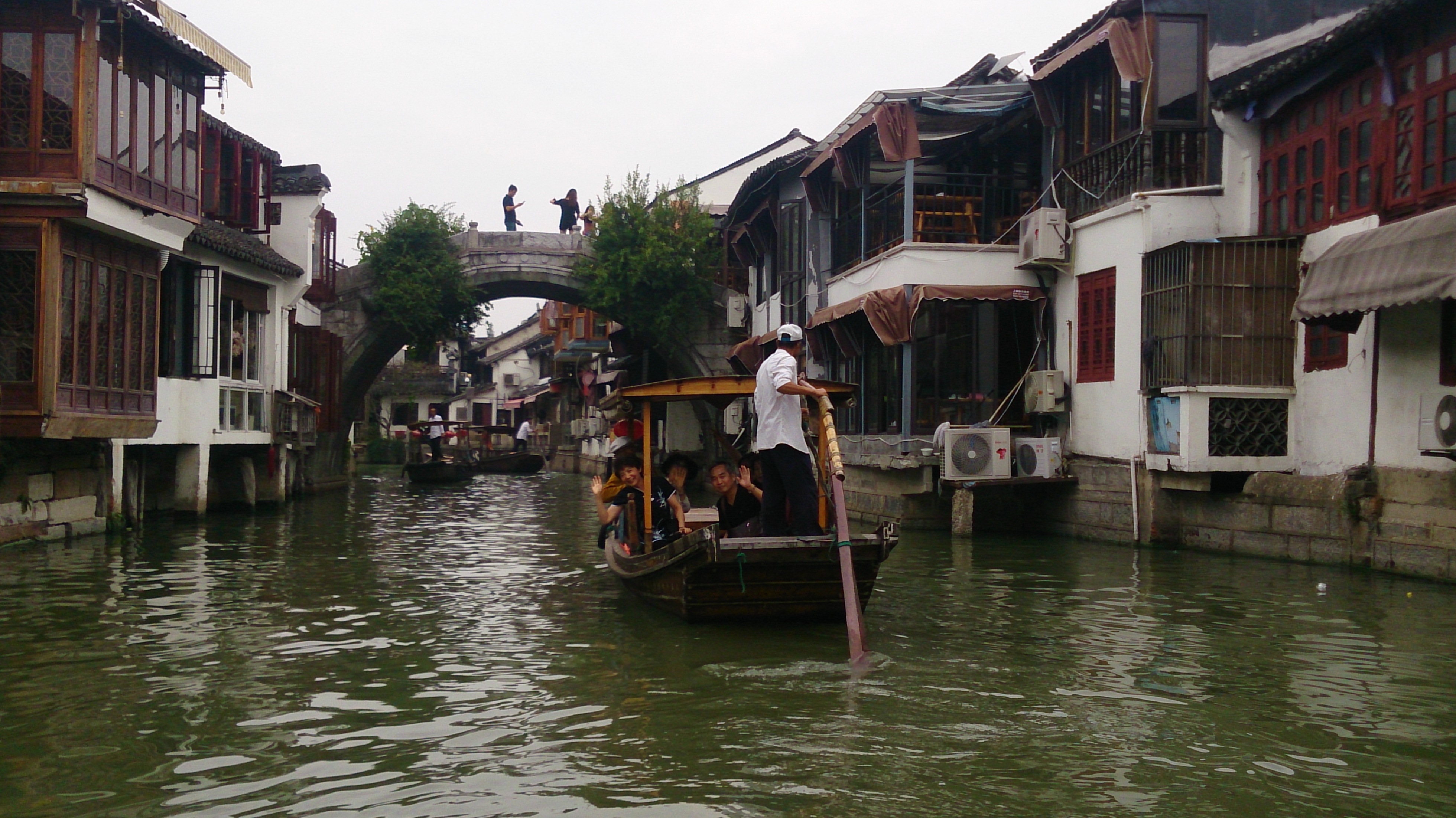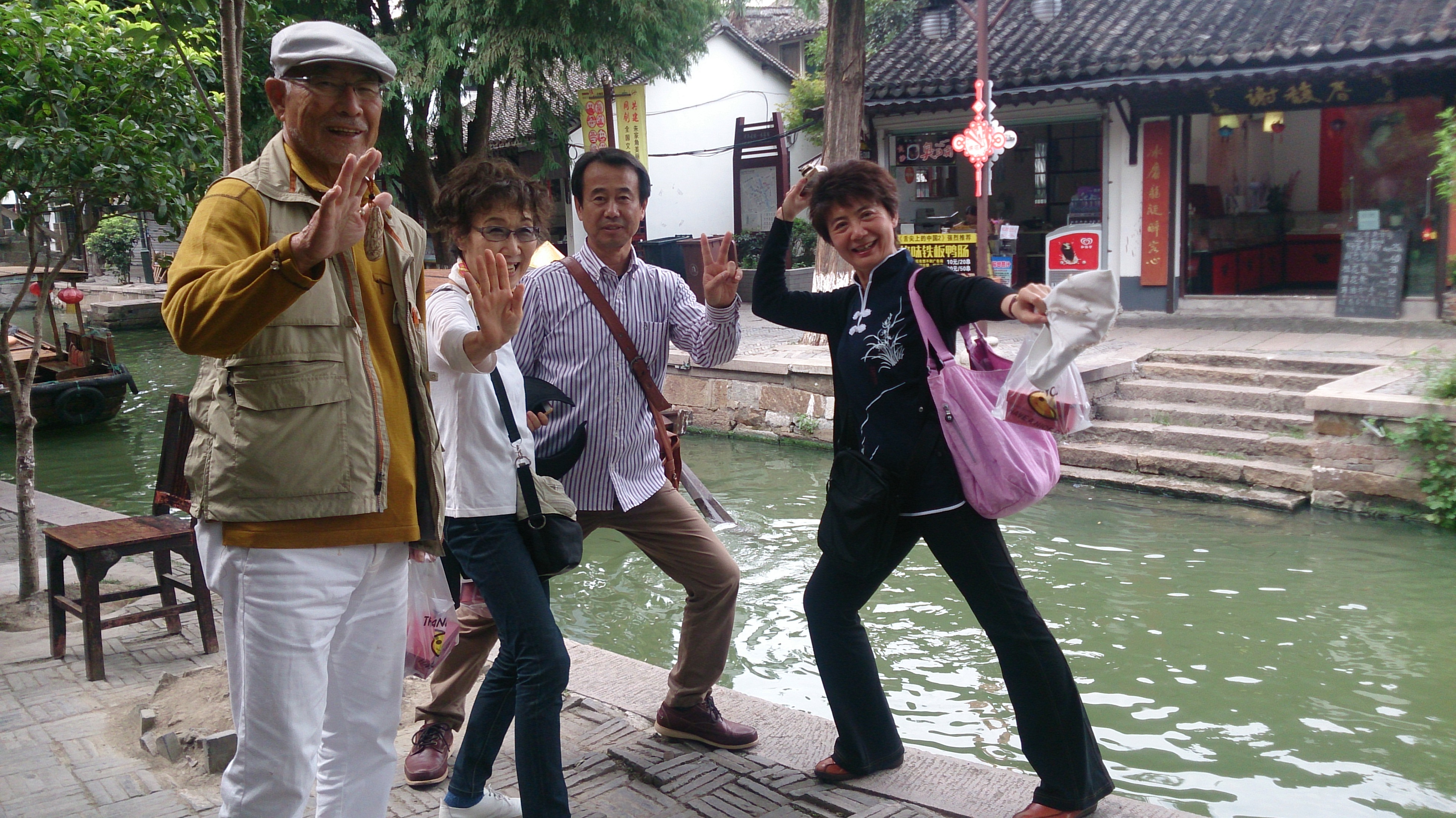 翌日はツアー最終日。早朝、まだ出勤する人もまばらな時間帯でしたが、ホテル近くのイベント用と思われる舞台の上で上海人民に太極拳を華々しく披露、その後朝食を済ませチェックアウト。慌ただしく朱家角へ出発しました。その約1時間後には昨日の摩天楼とは一転、時間の止まったような静かな水郷の街を散策していたのでした。