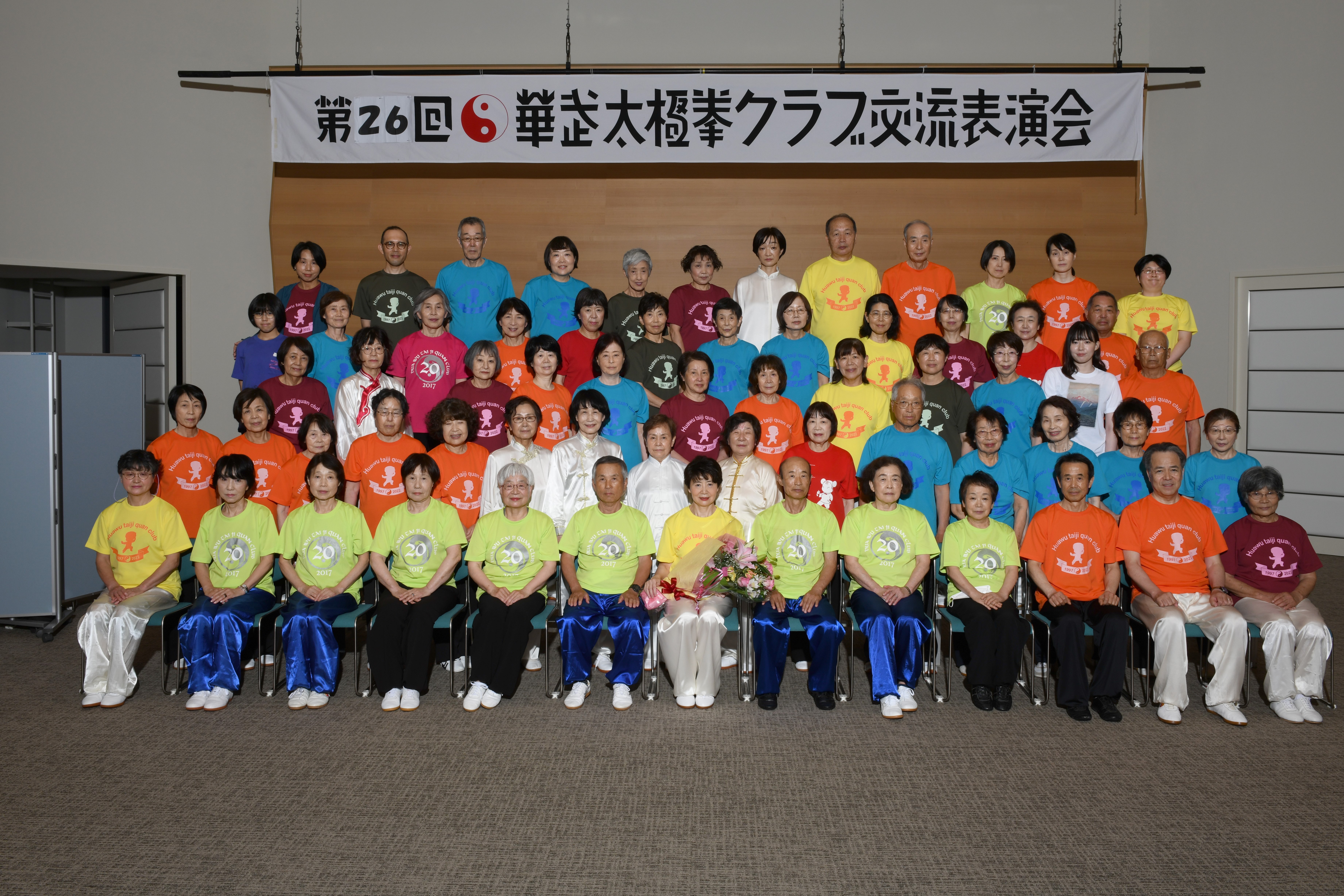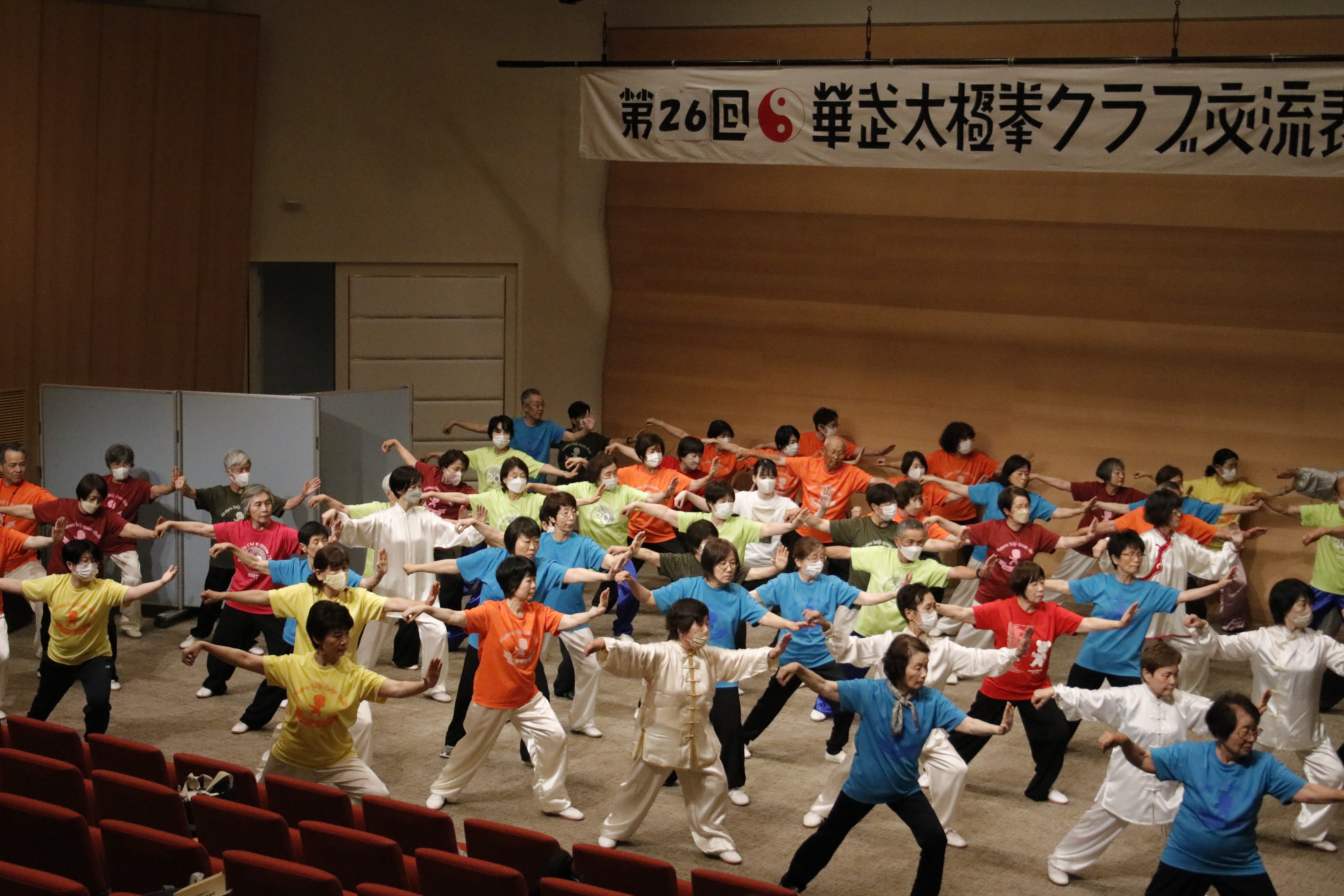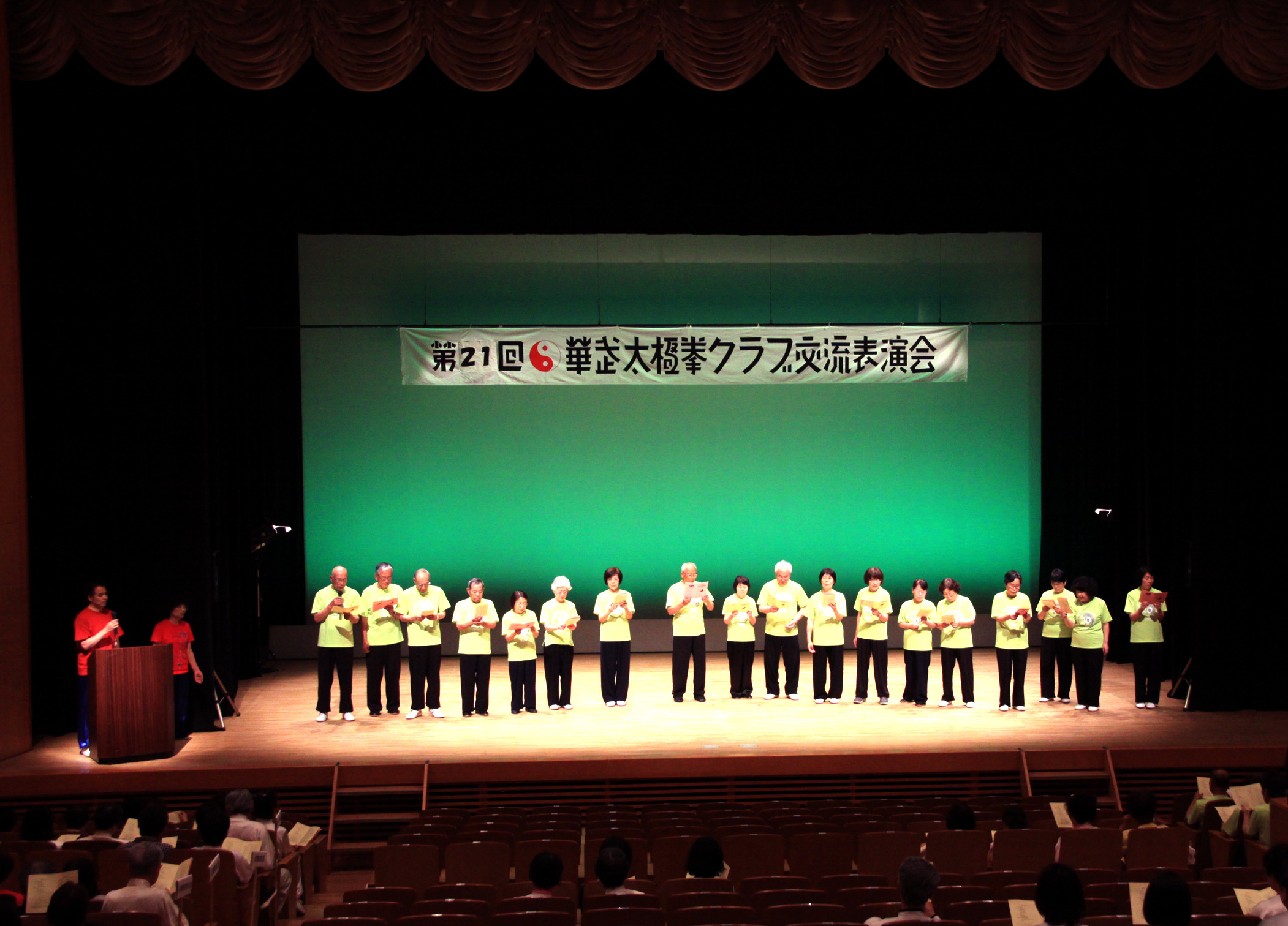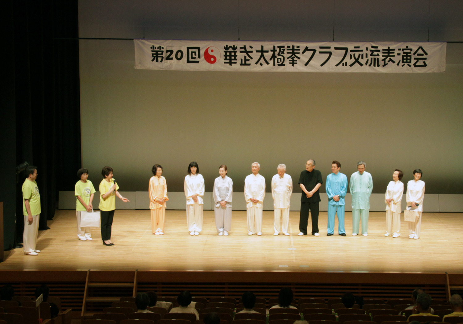今年の会場となった天神山文化プラザホールは、岡山市の中心地にあり、高齢会員のアクセス面や利便性を考えて初めて選ばれた場所でした。結果として、例年以上に家族や友人、一般の太極拳愛好家の皆さまが多く来場くださり、観客席はほぼ満席。終始にぎやかで、笑顔あふれる交流表演会となりました。