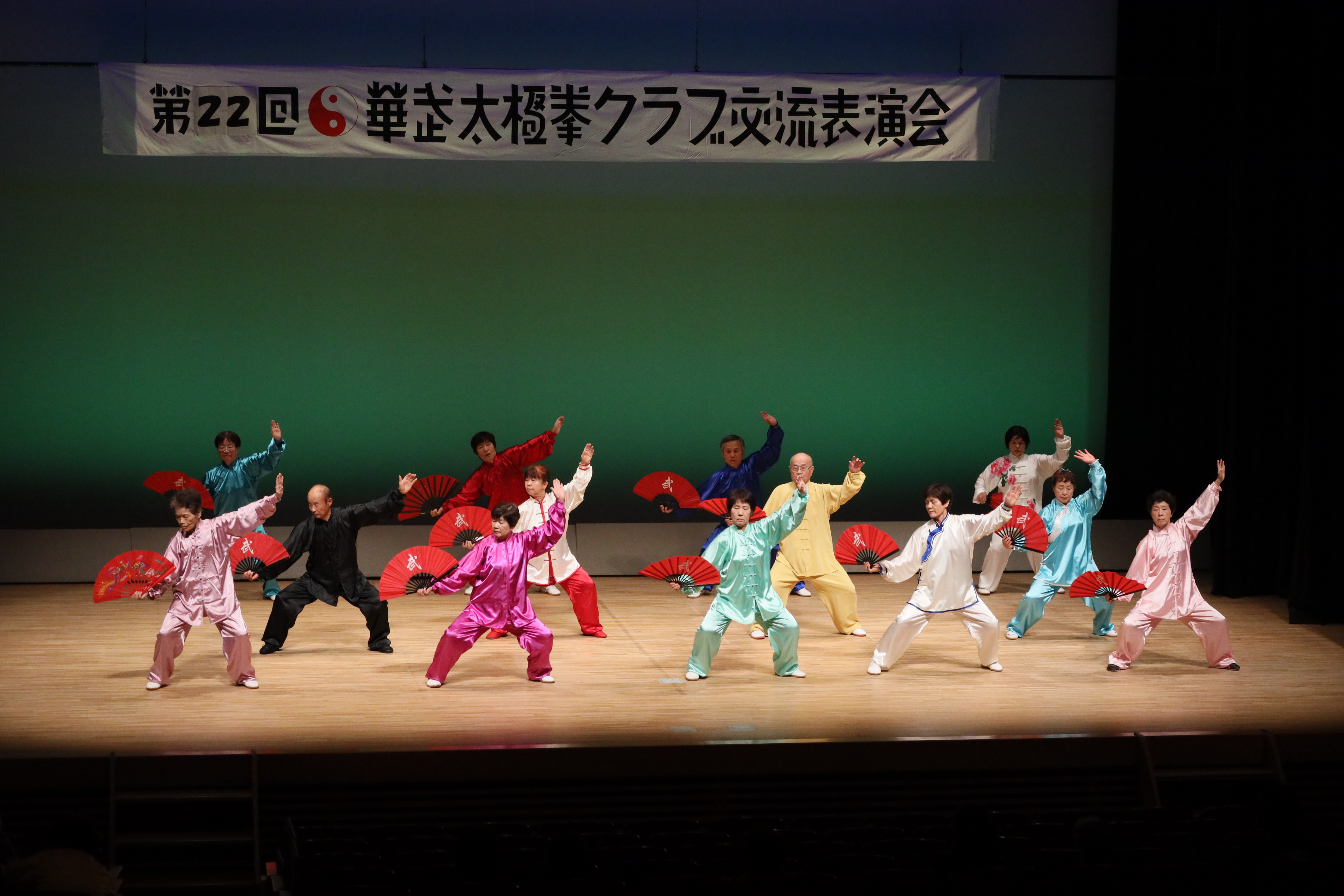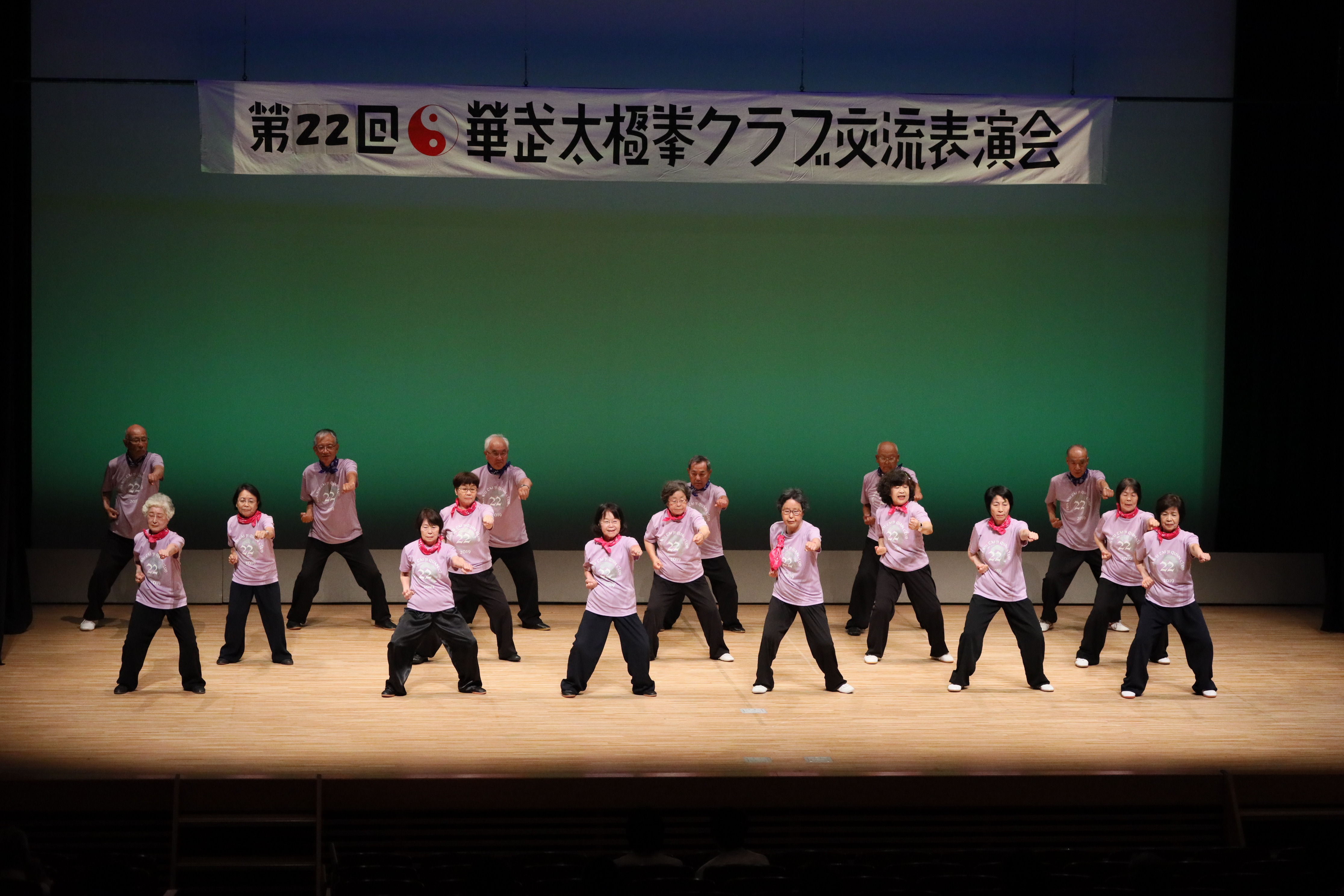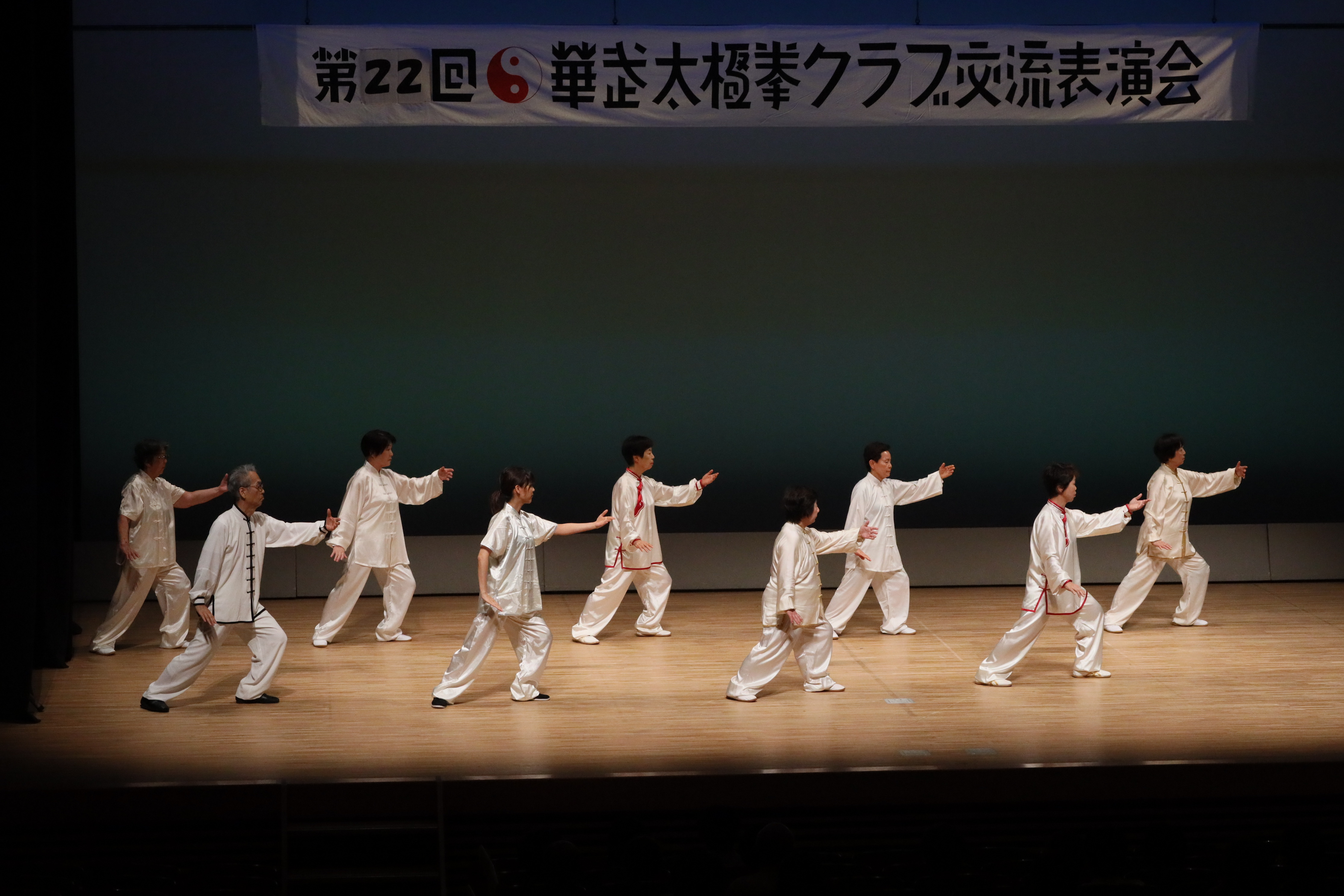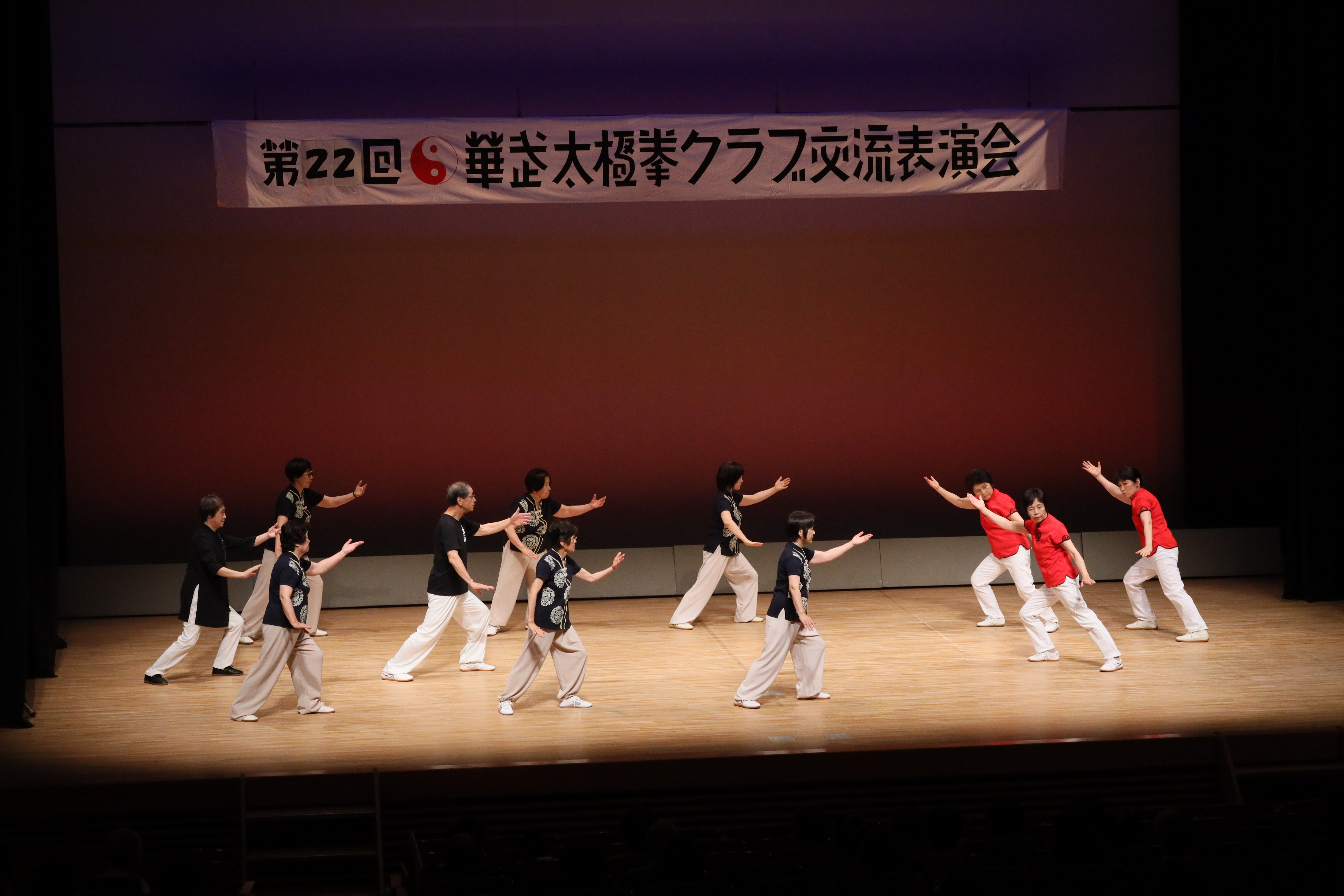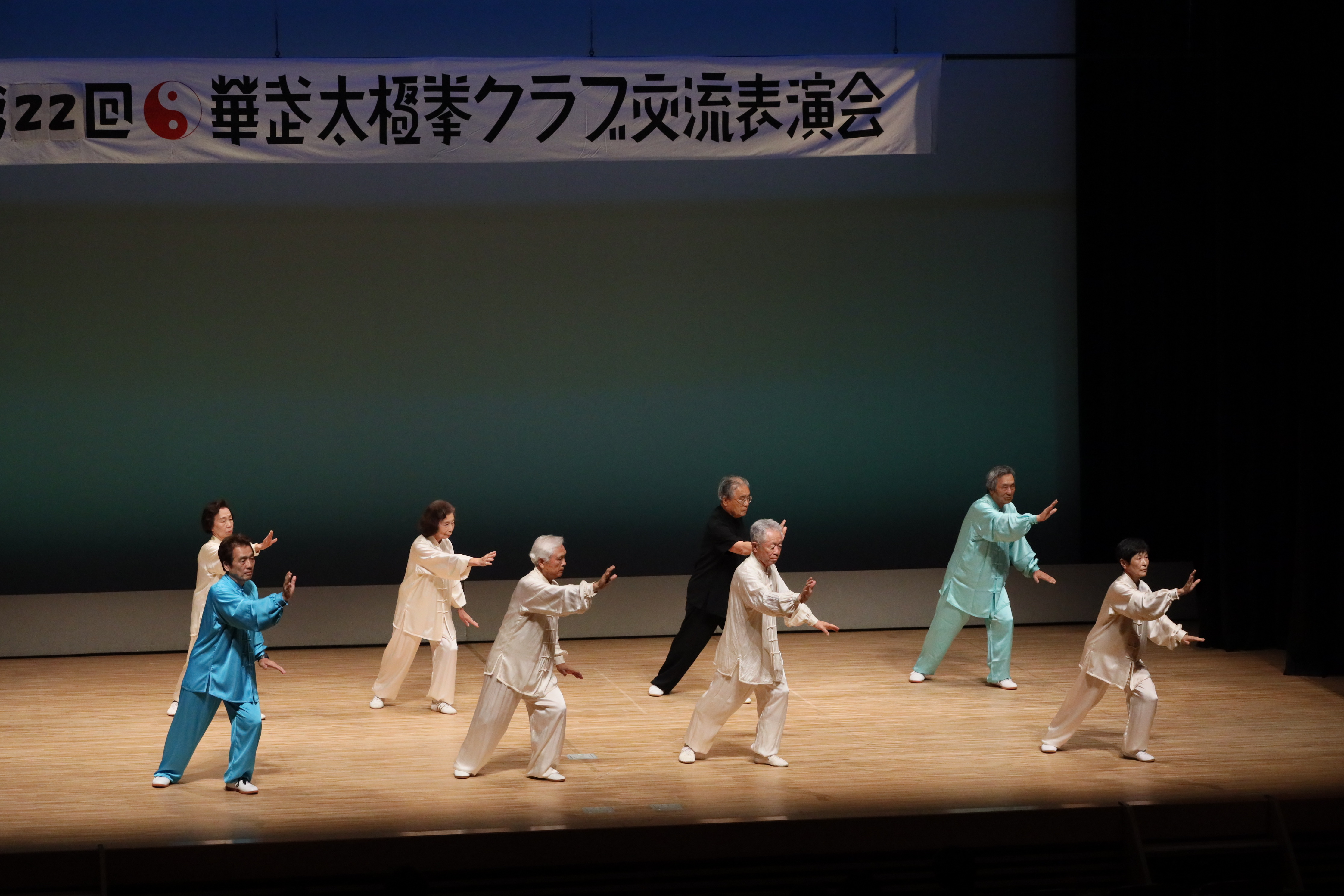 参加者の皆さまは、ステージに立つとより一層集中し、普段より真剣な表情で素晴らしい演武を披露されました。今回の表演会では、舞台の広さに合わせて、8名以上の教室はA・B2つのグループに分かれて少人数で演武するよう工夫し、一人ひとりの動きが丁寧に見える演出にしました。