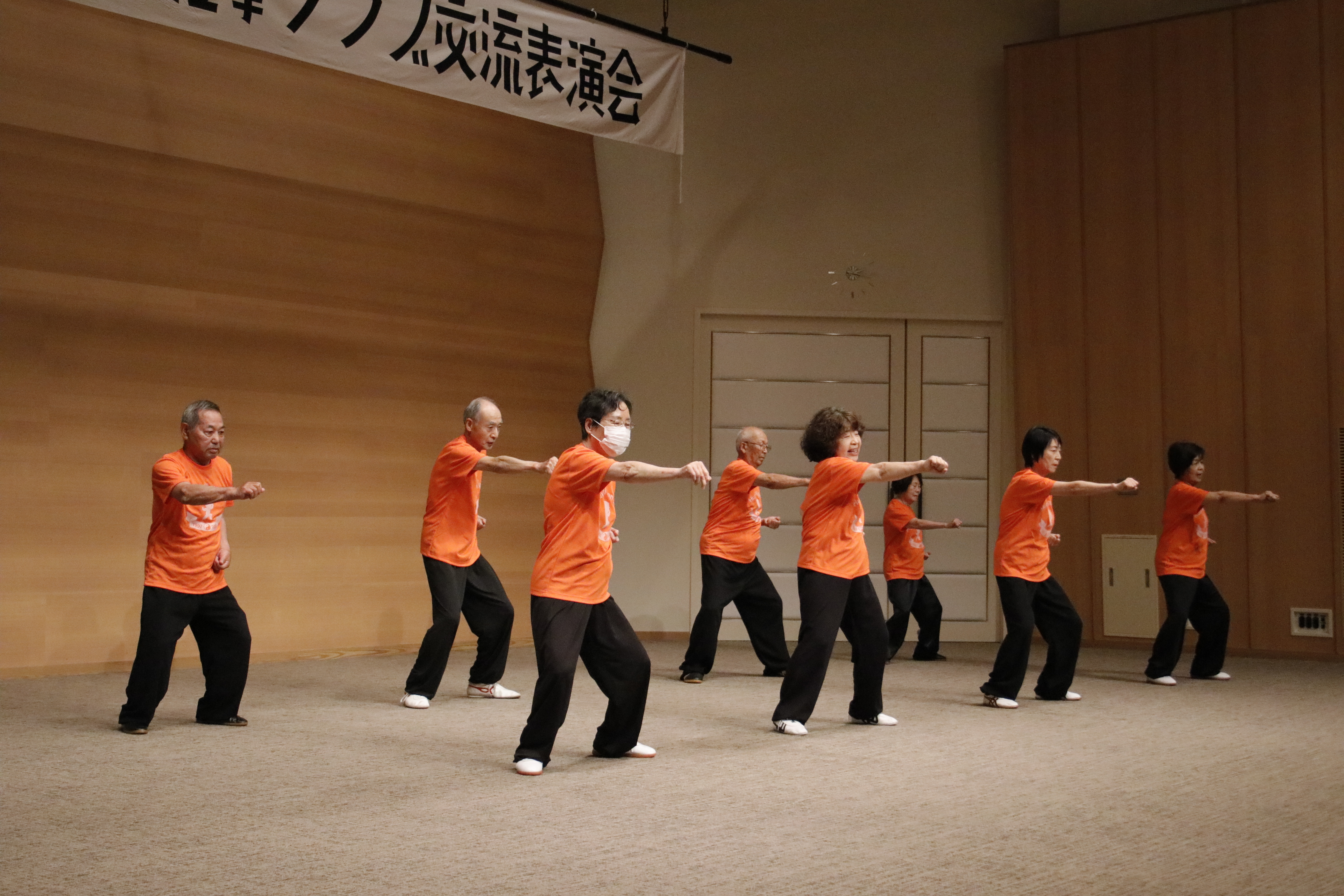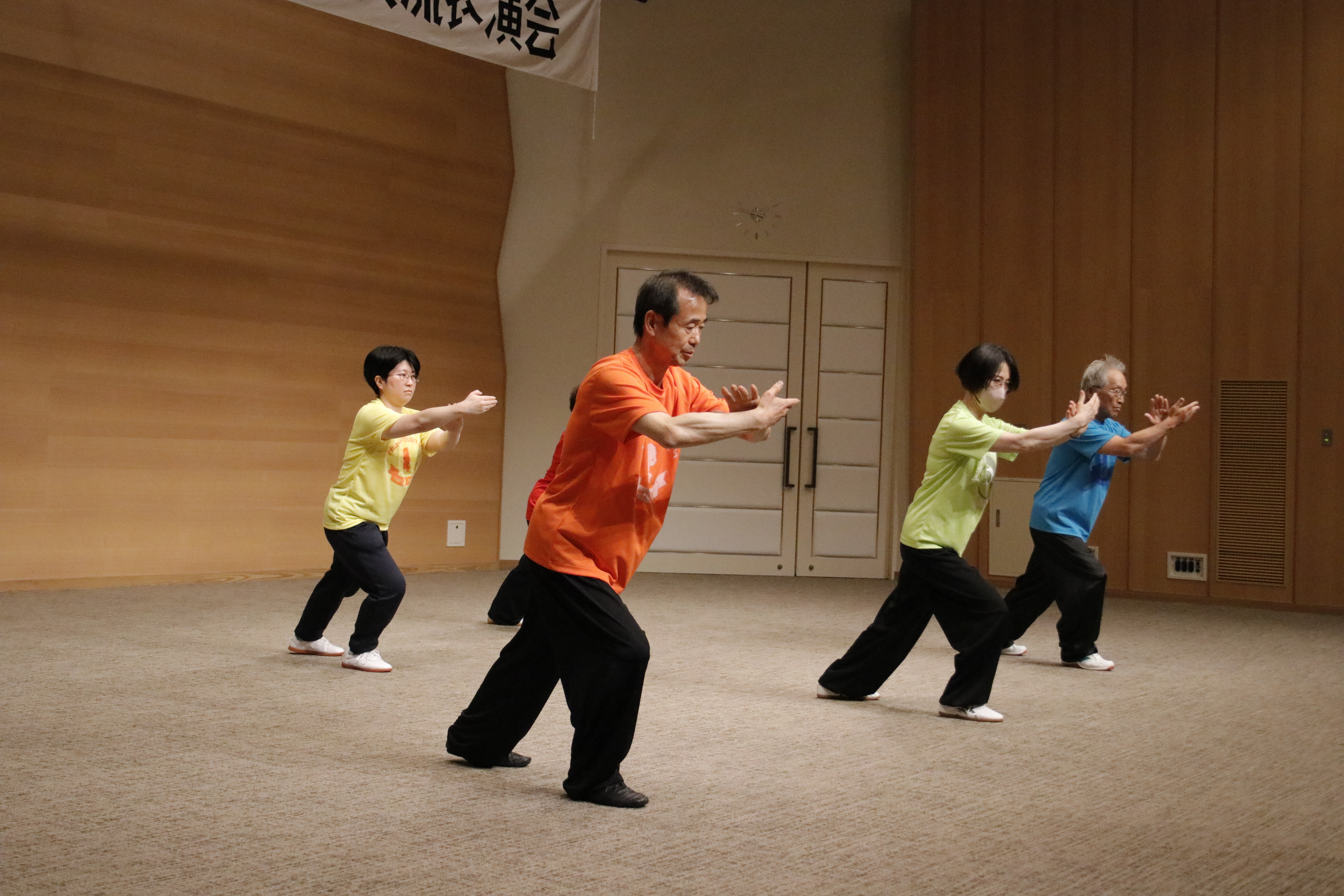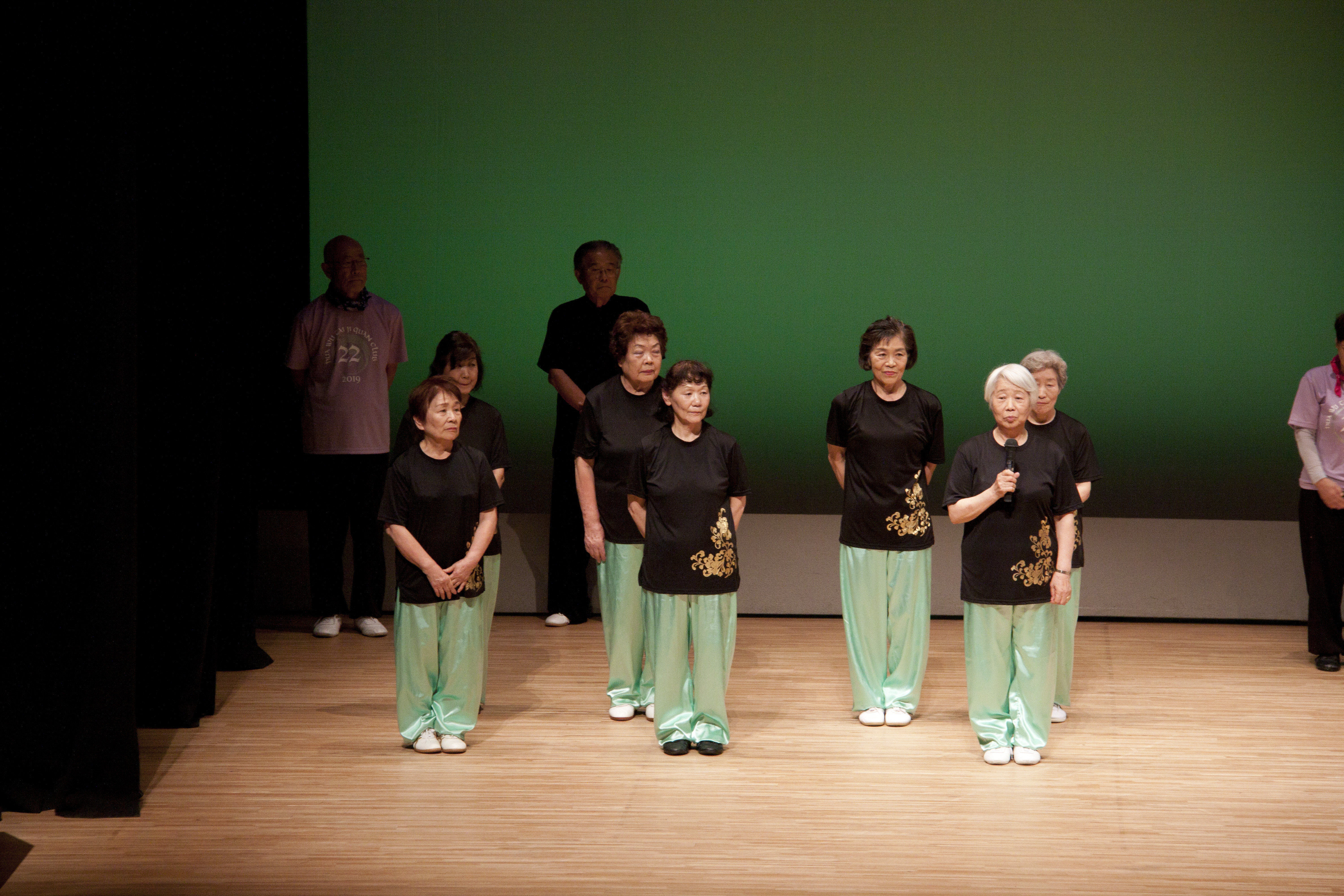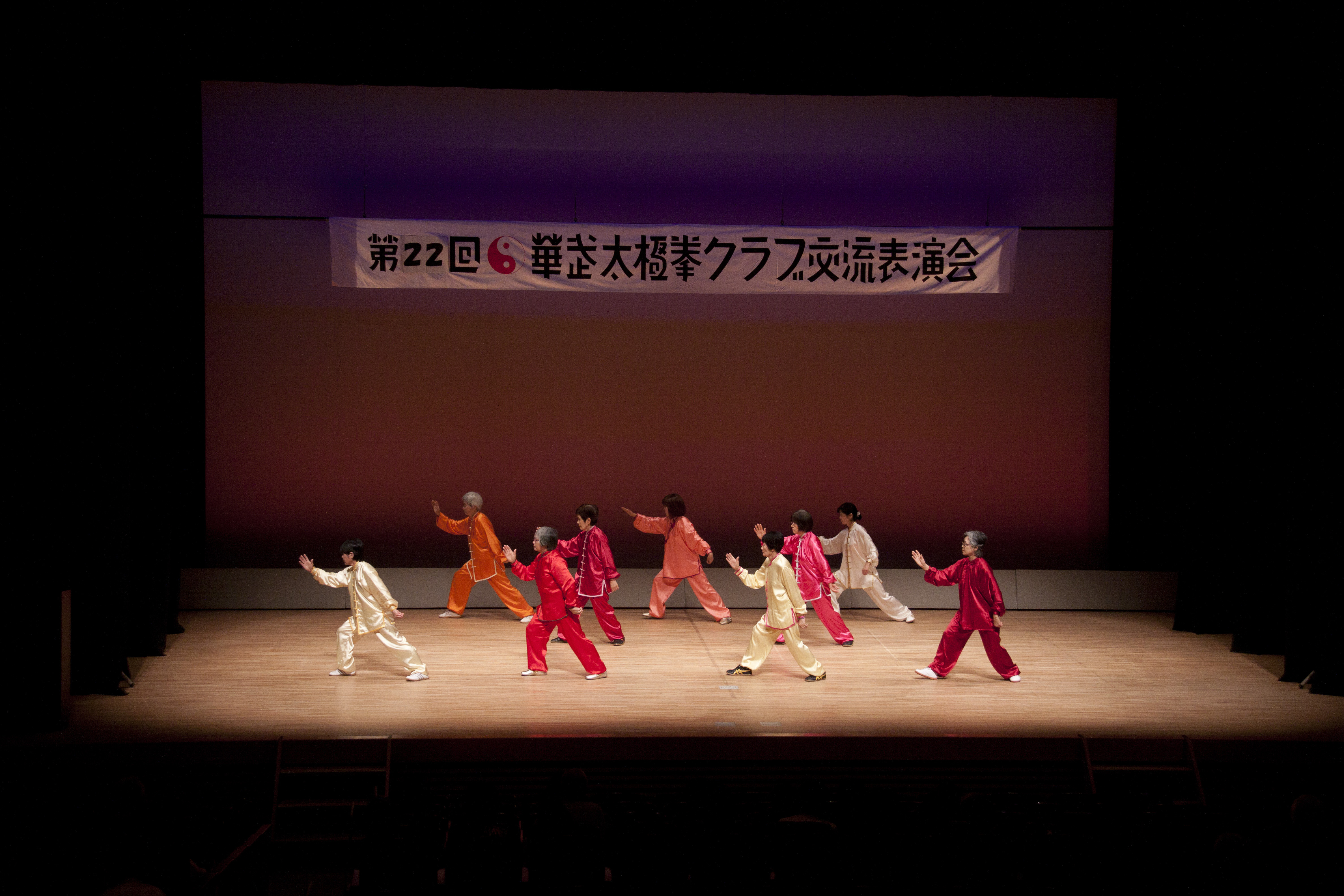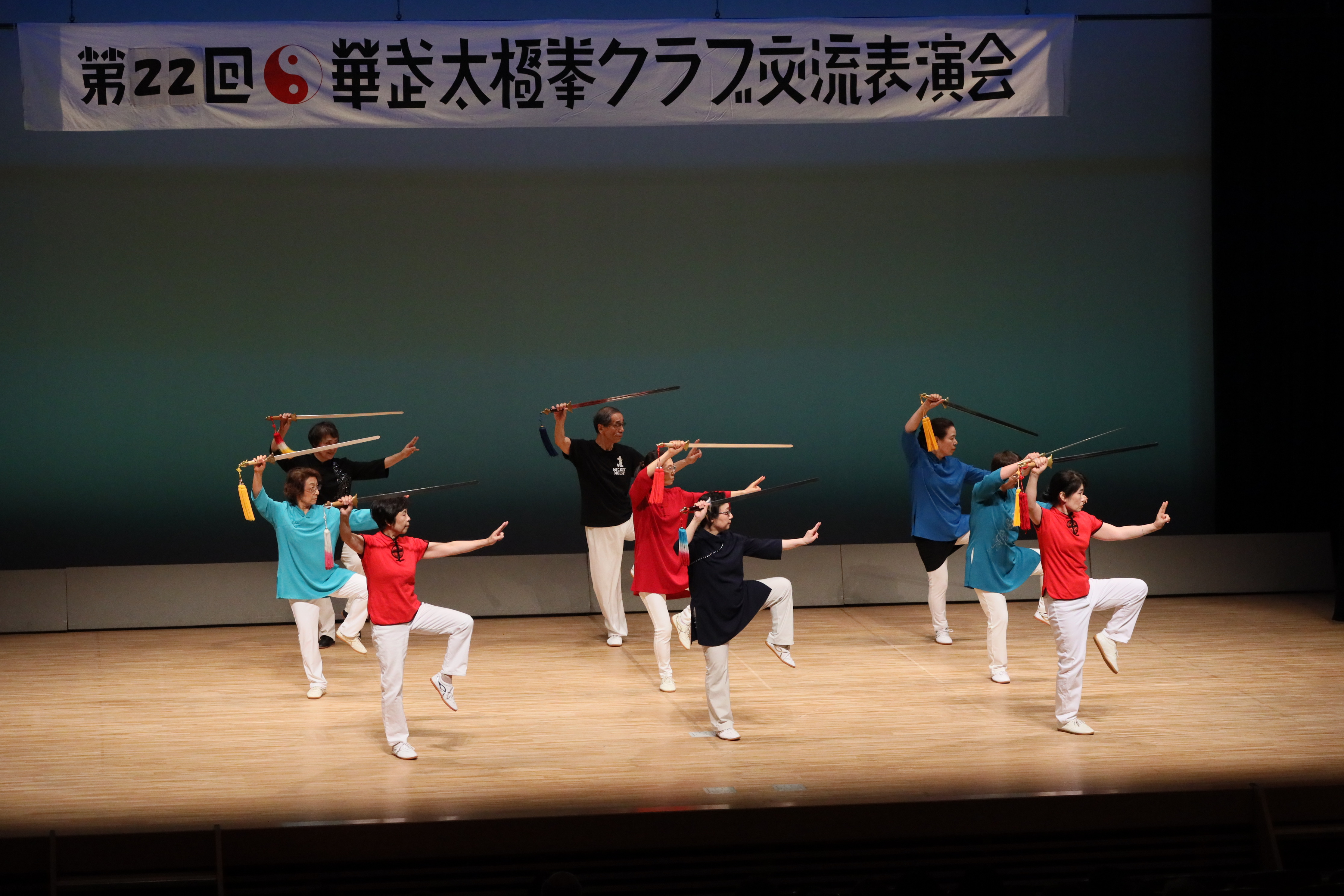 参加者の皆さまは、ステージに立つとより一層集中し、普段より真剣な表情で素晴らしい演武を披露されました。今回の表演会では、舞台の広さに合わせて、8名以上の教室はA・B2つのグループに分かれて少人数で演武するよう工夫し、一人ひとりの動きが丁寧に見える演出にしました。