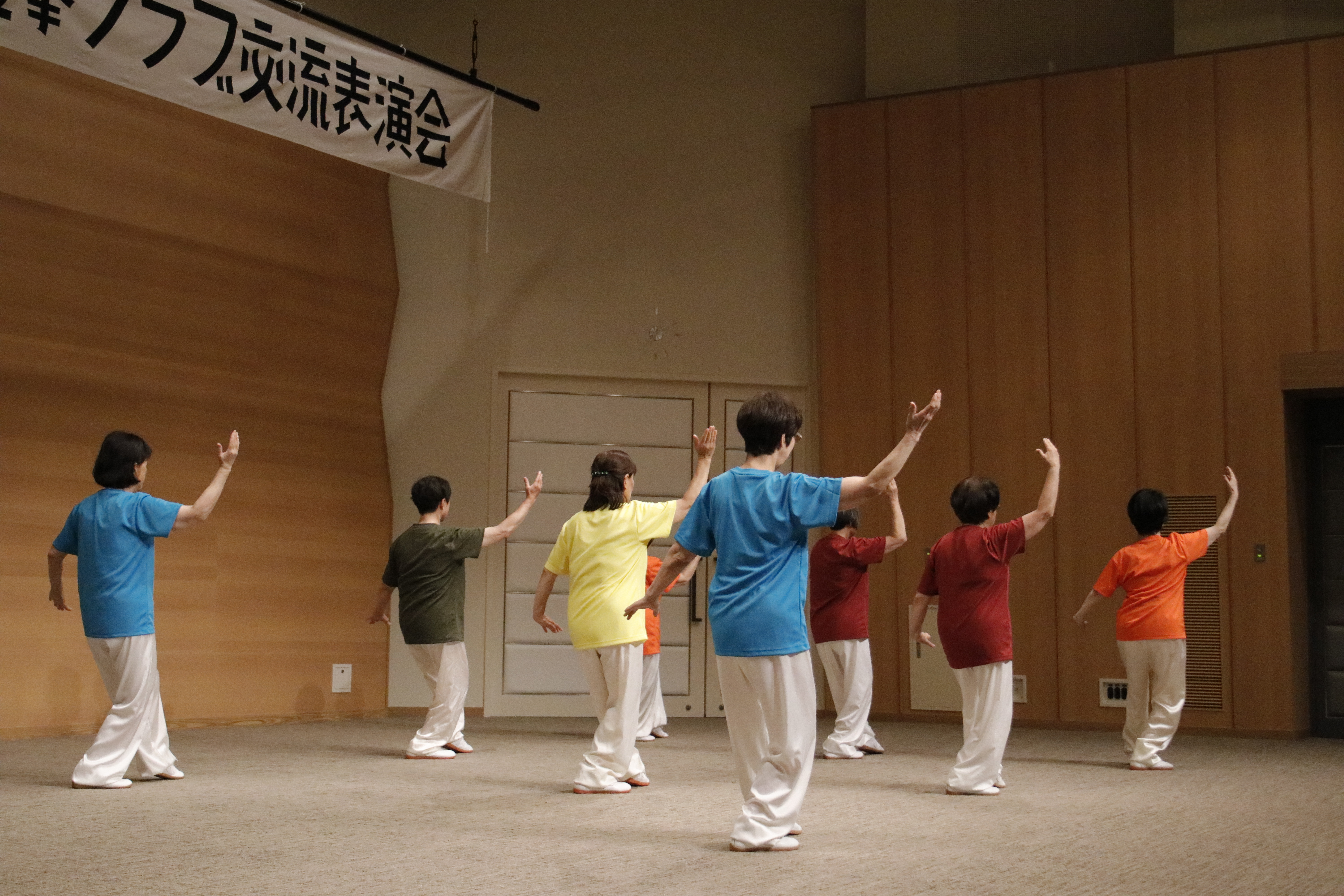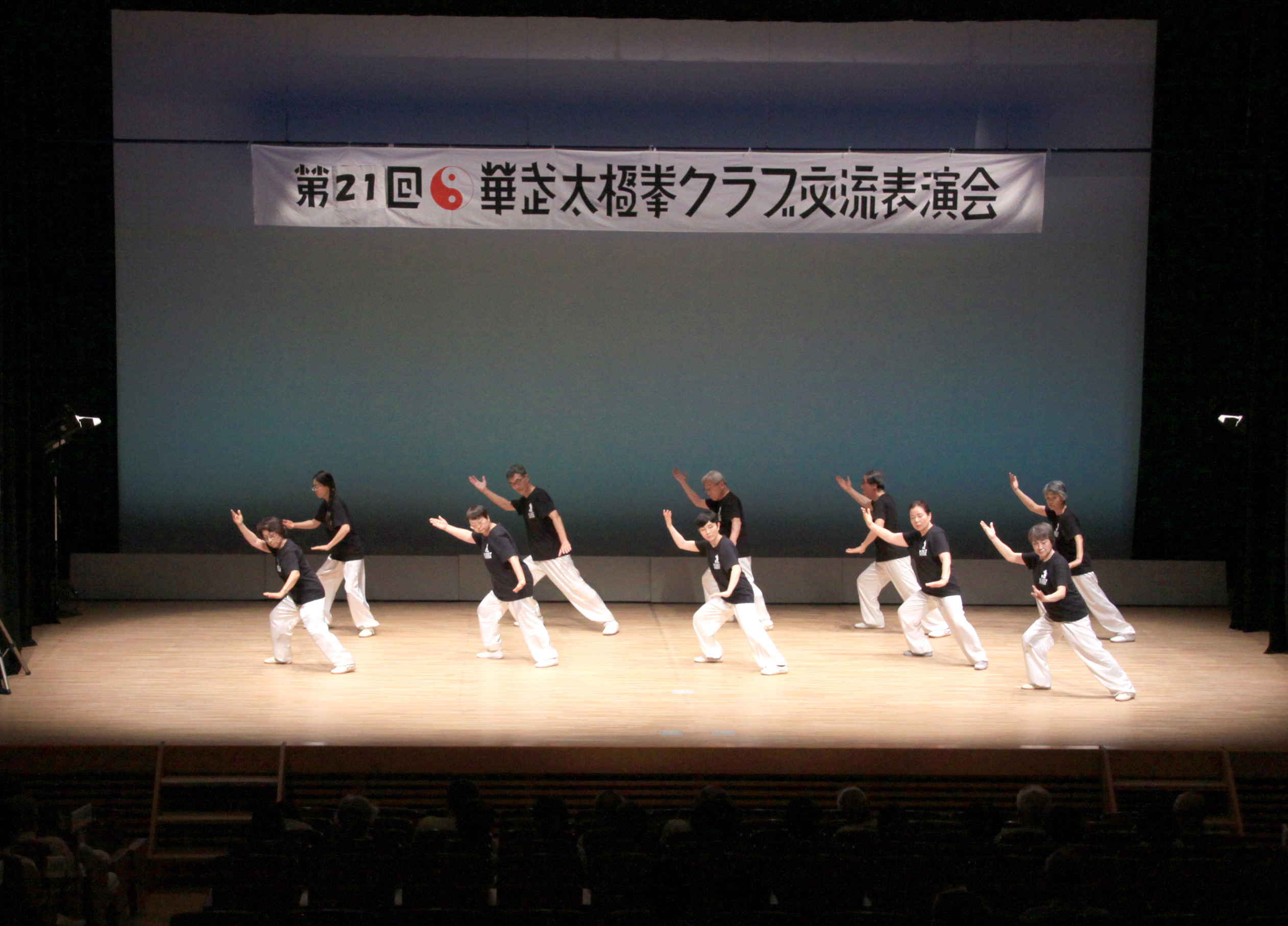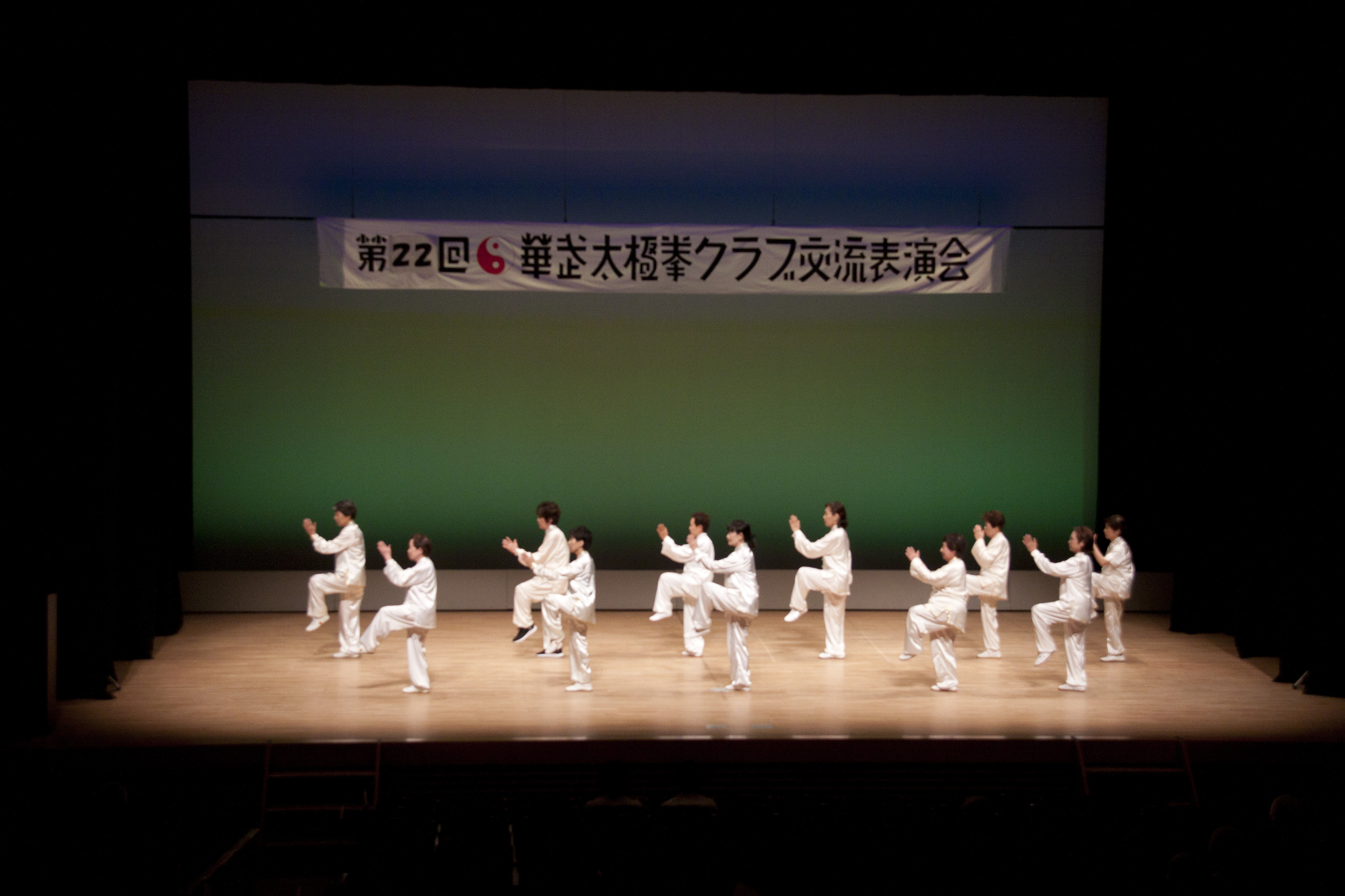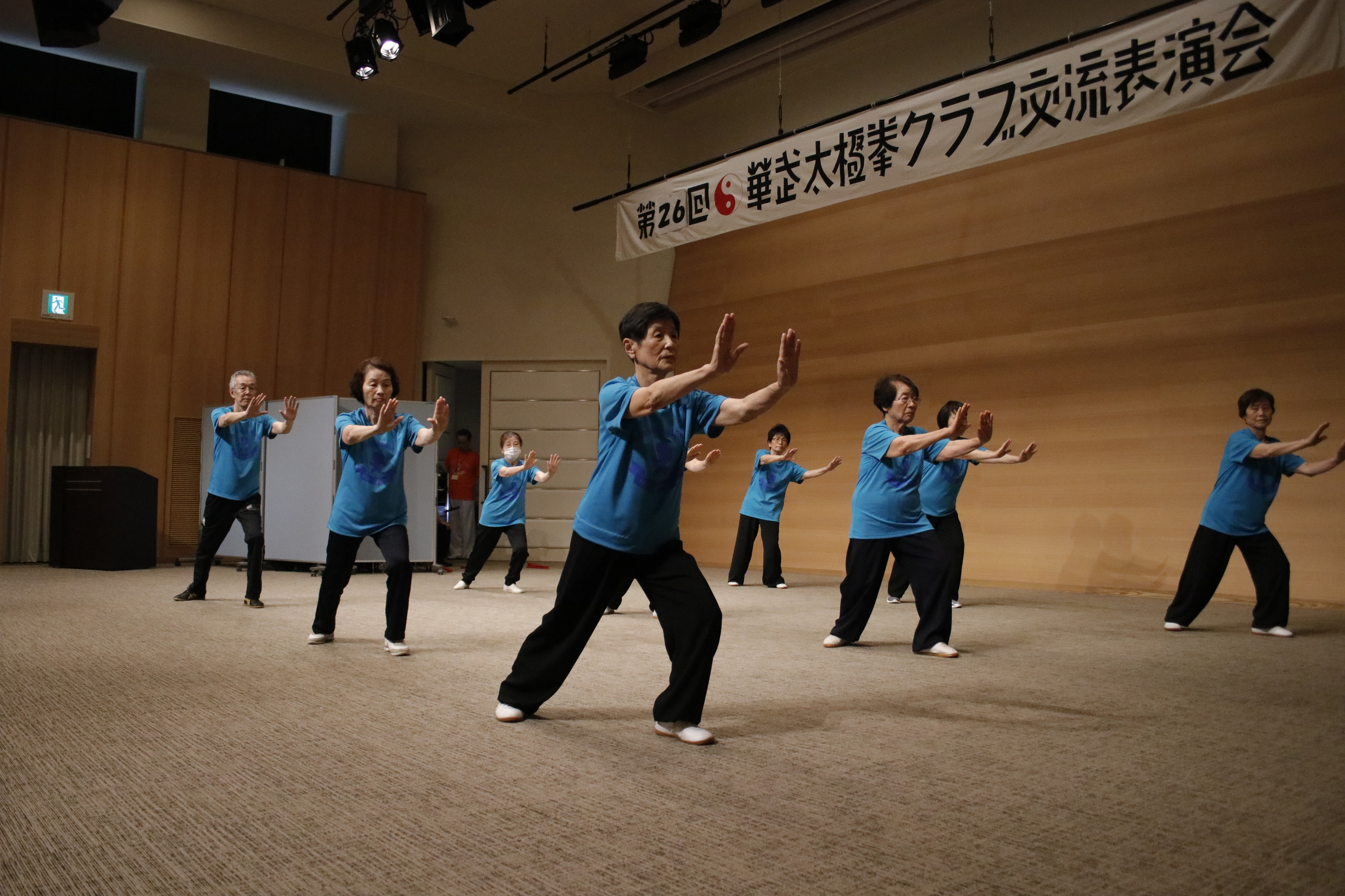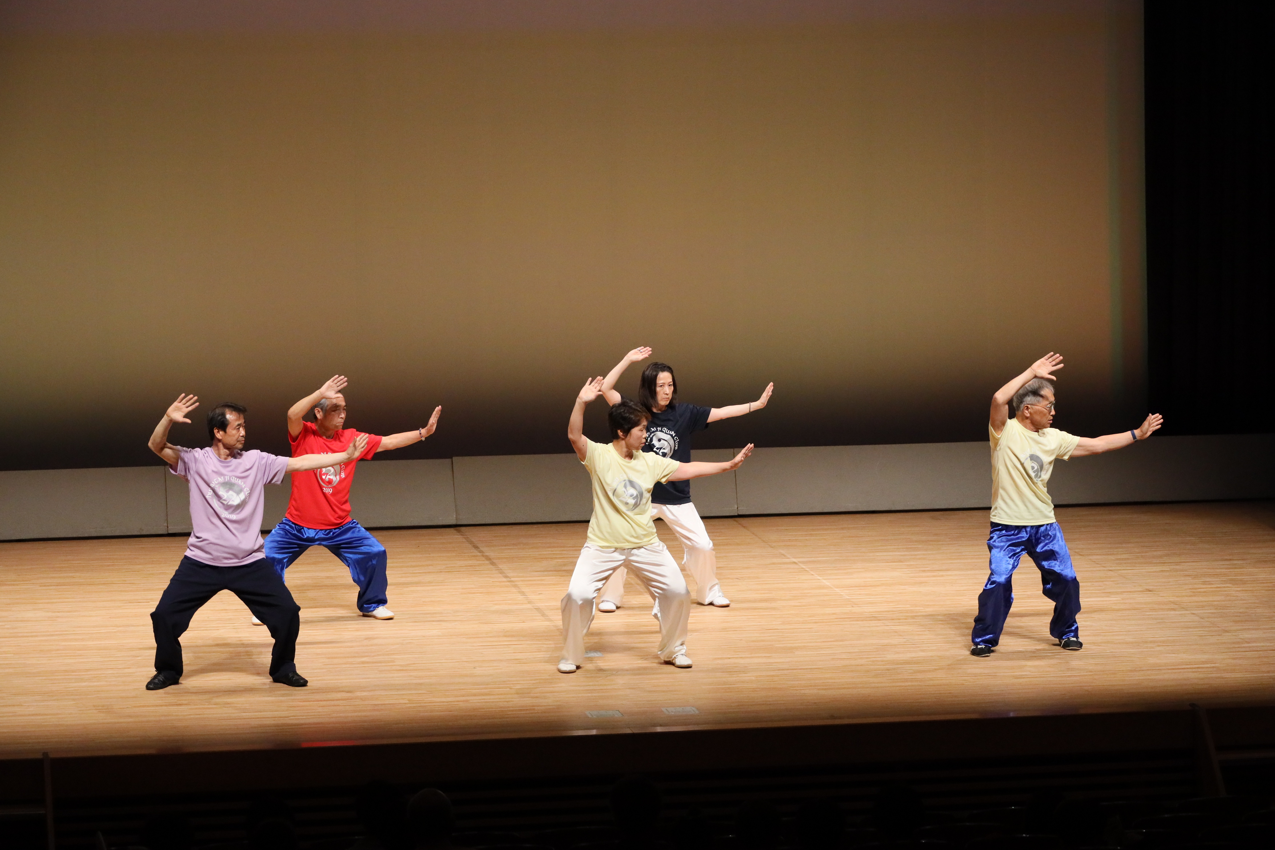 参加者の皆さまは、ステージに立つとより一層集中し、普段より真剣な表情で素晴らしい演武を披露されました。今回の表演会では、舞台の広さに合わせて、8名以上の教室はA・B2つのグループに分かれて少人数で演武するよう工夫し、一人ひとりの動きが丁寧に見える演出にしました。