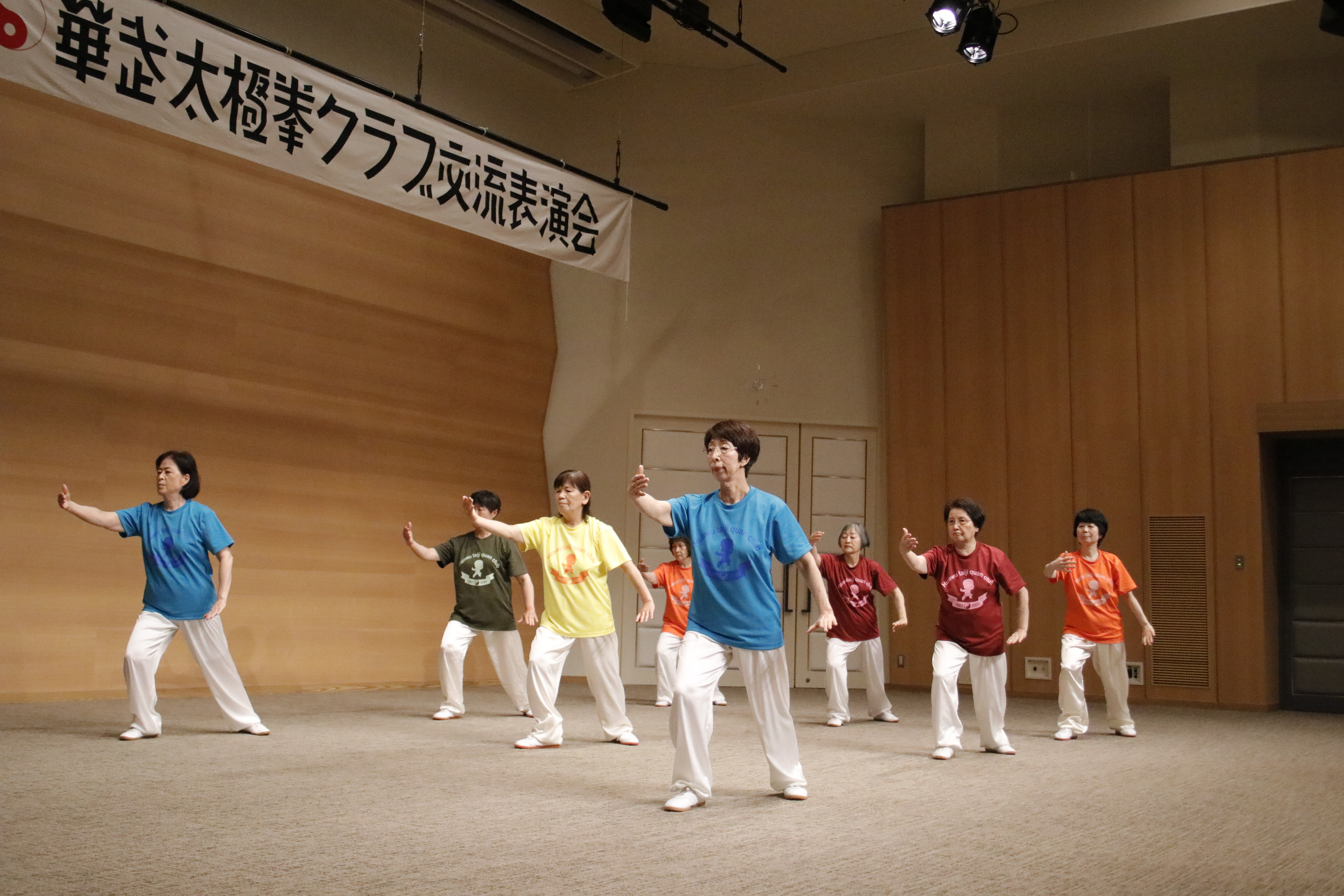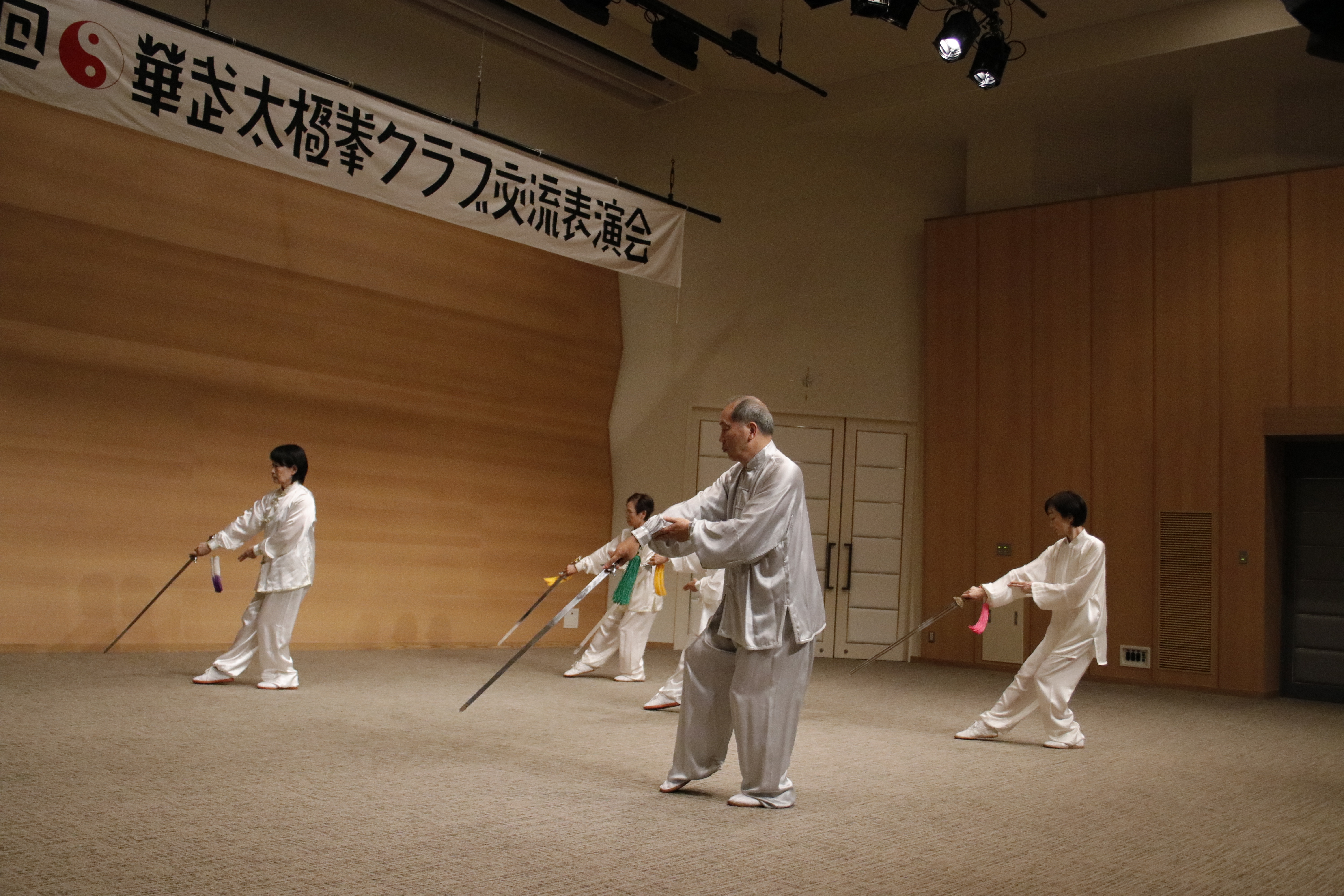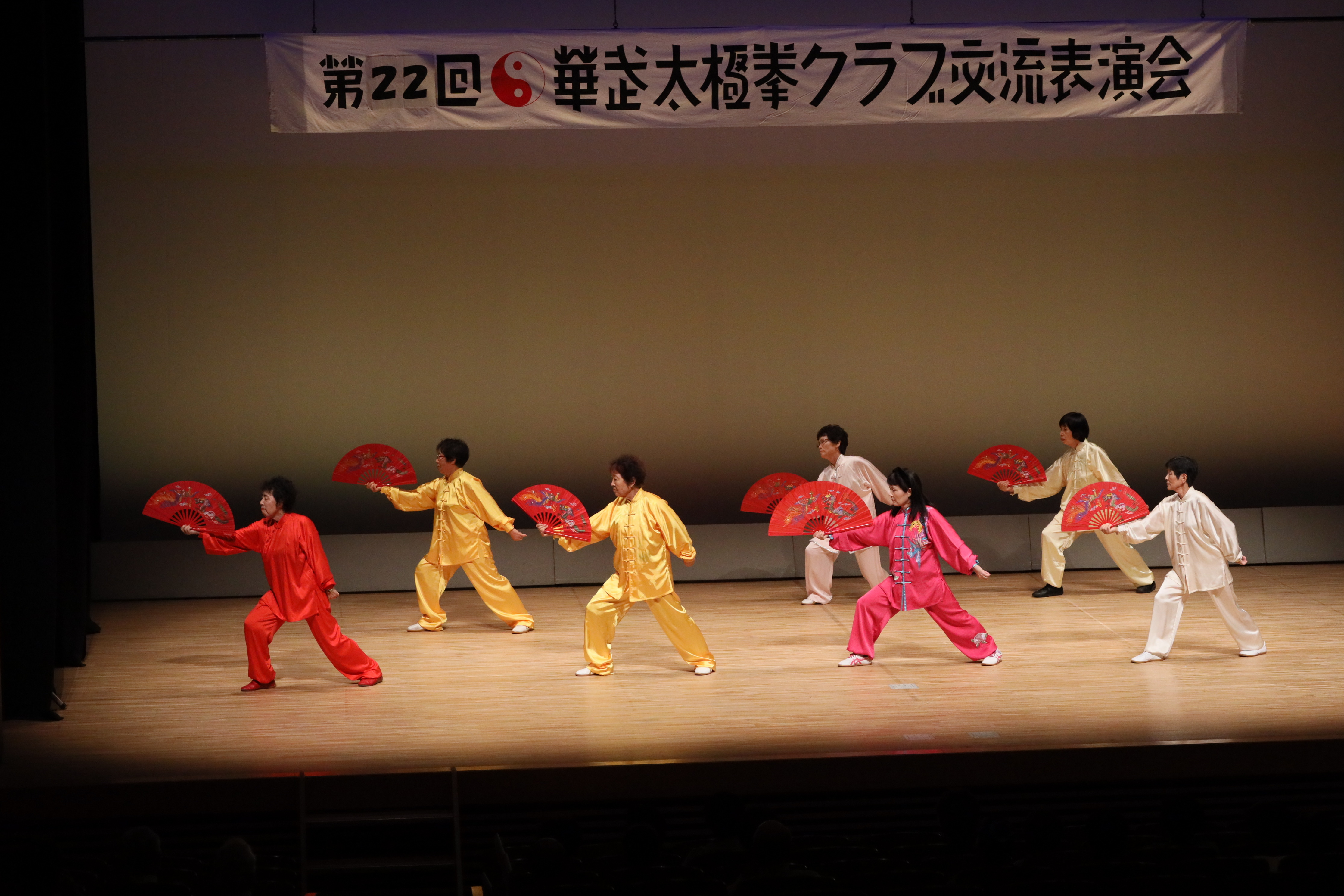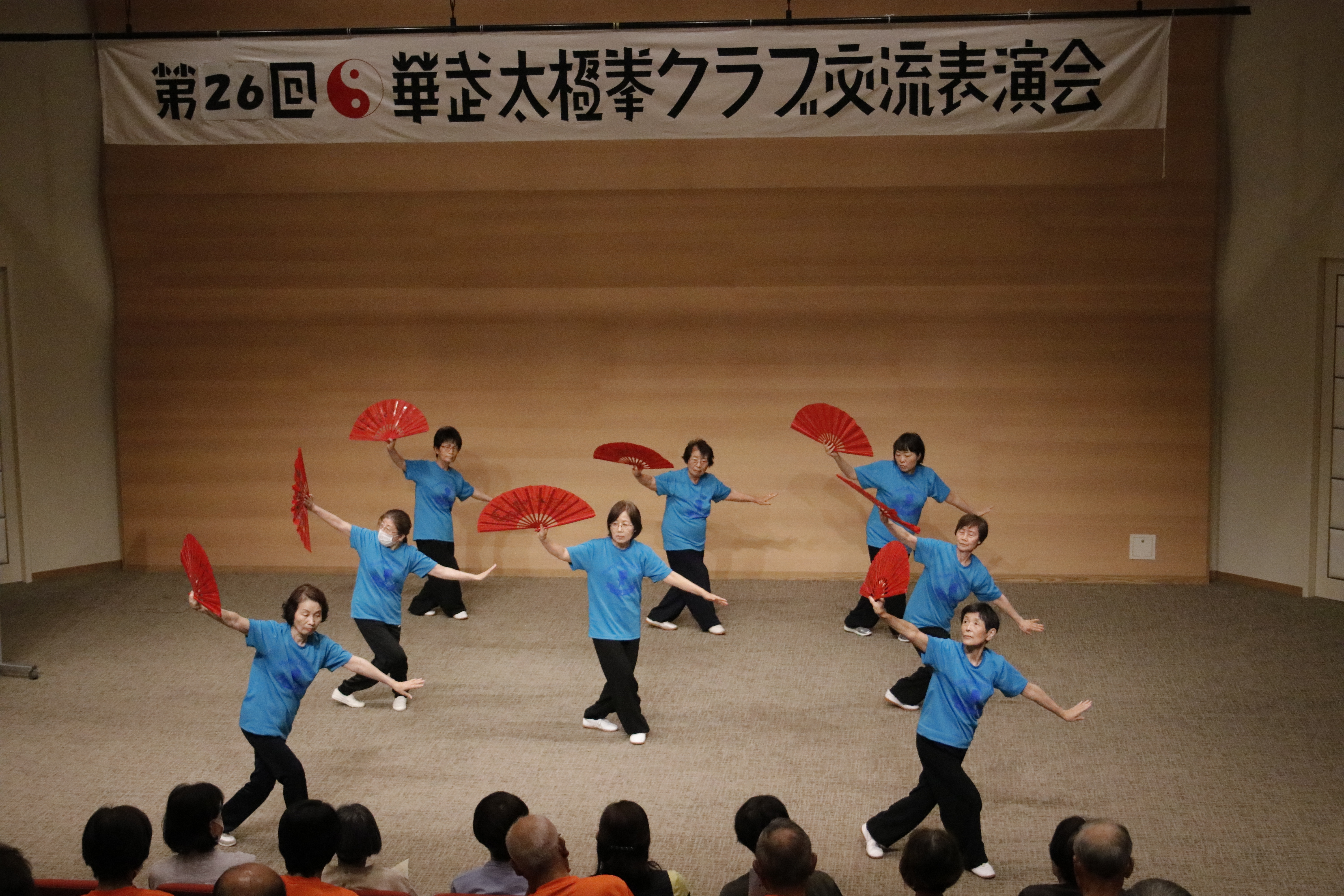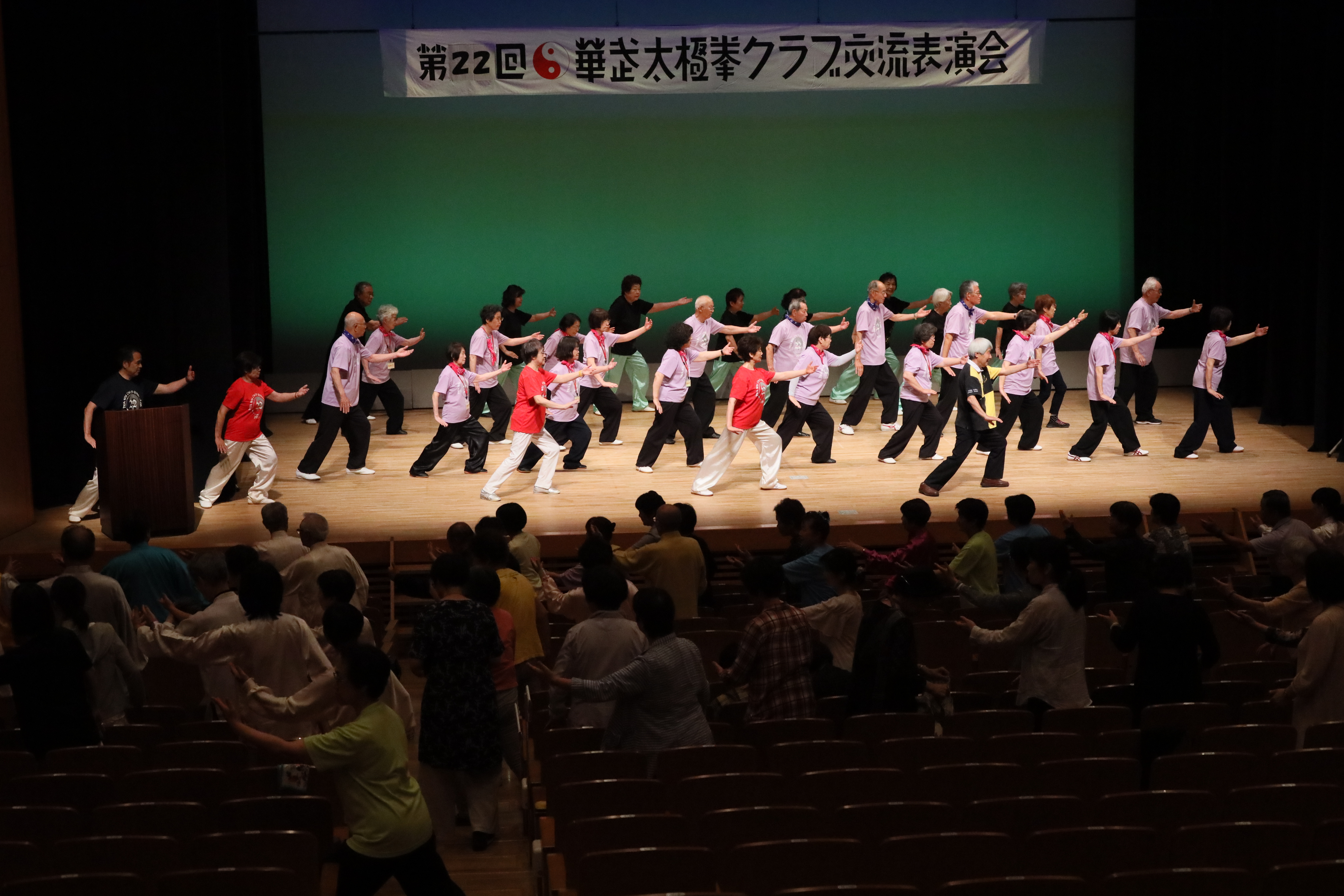 参加者の皆さまは、ステージに立つとより一層集中し、普段より真剣な表情で素晴らしい演武を披露されました。今回の表演会では、舞台の広さに合わせて、8名以上の教室はA・B2つのグループに分かれて少人数で演武するよう工夫し、一人ひとりの動きが丁寧に見える演出にしました。