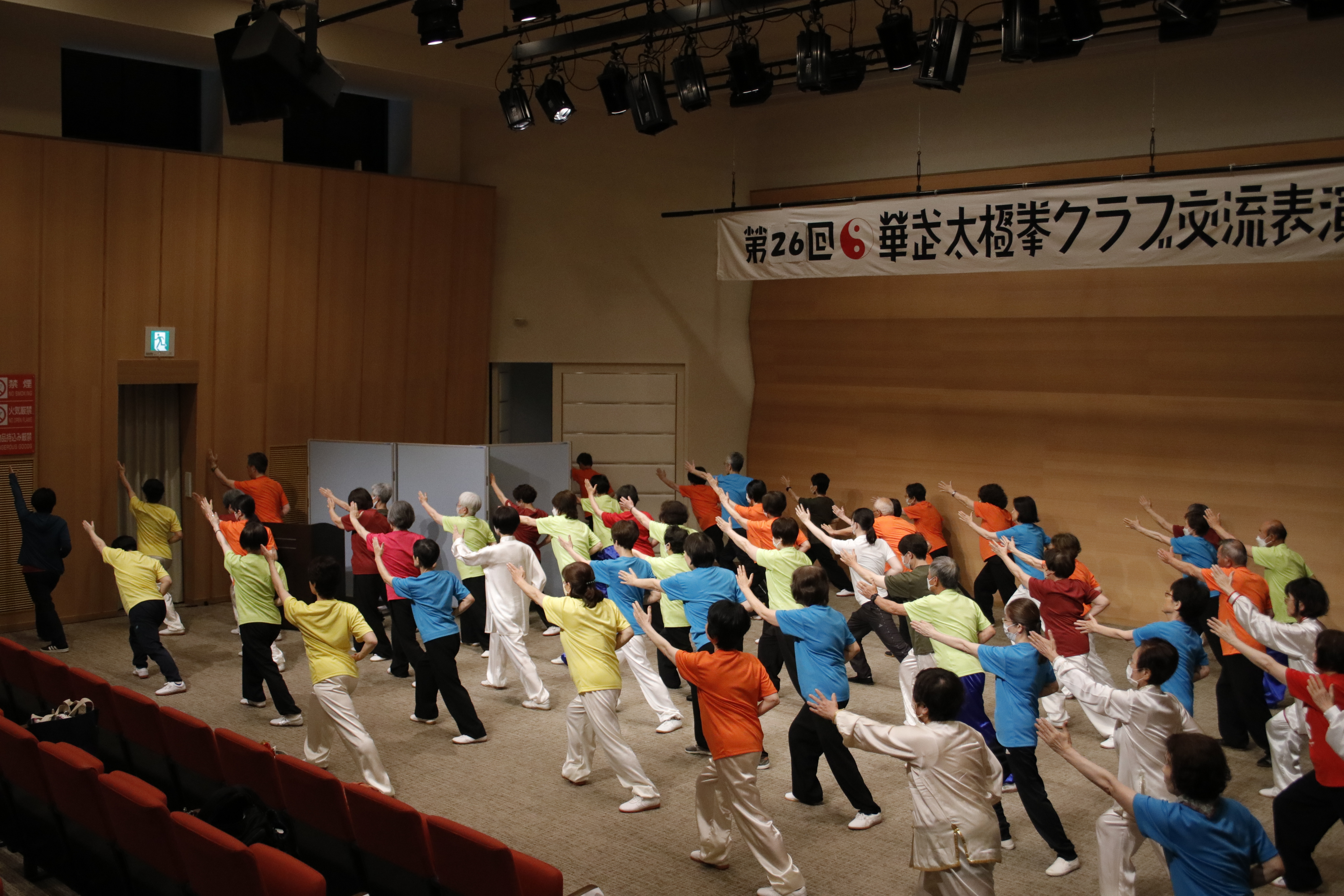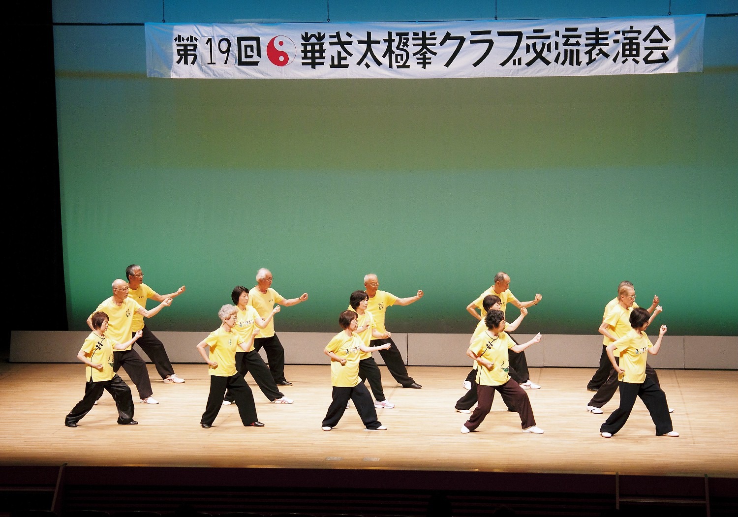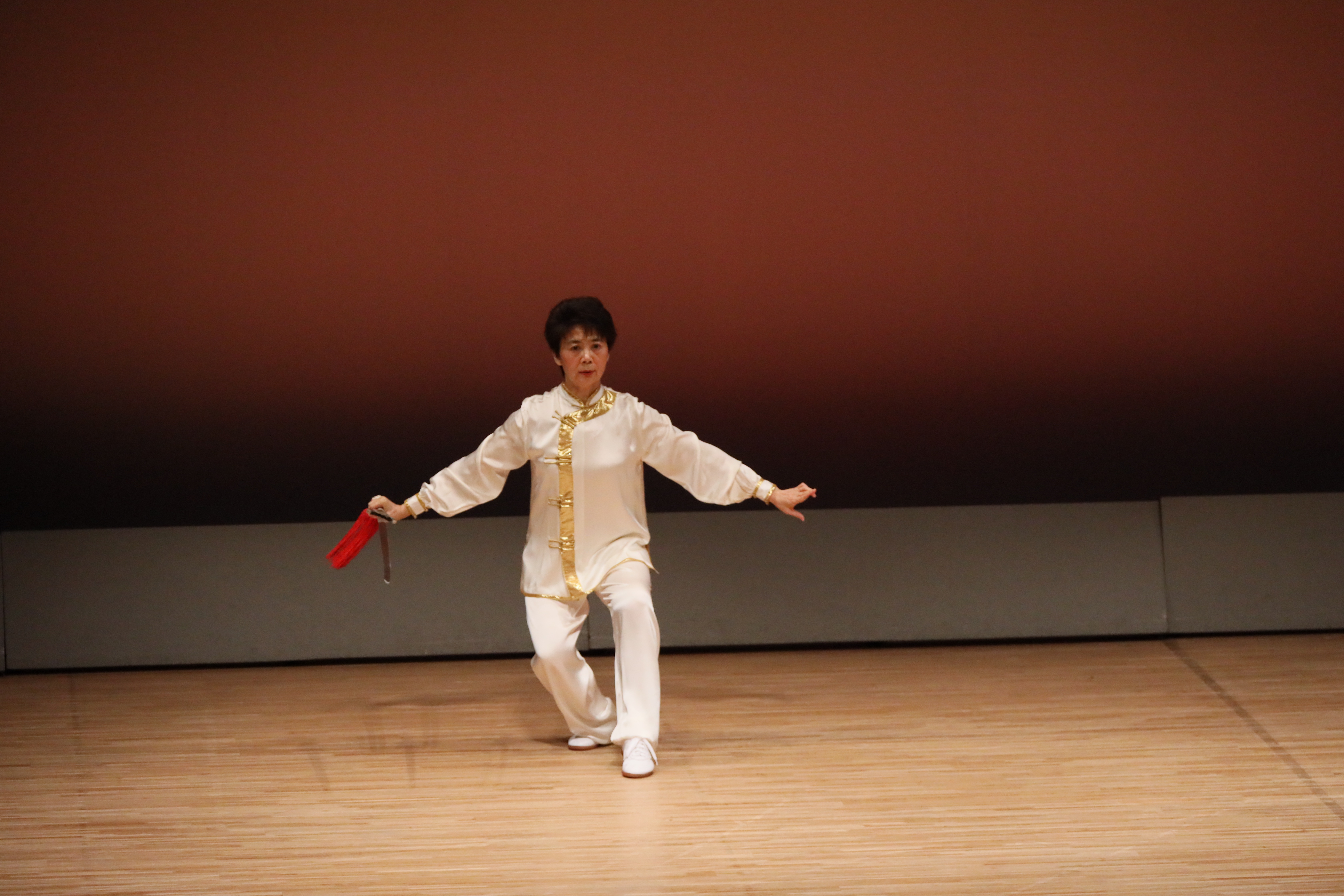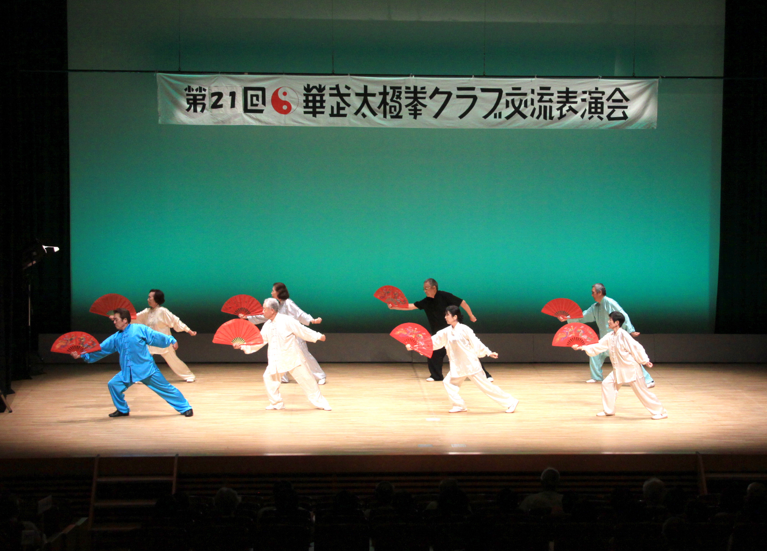 参加者の皆さまは、ステージに立つとより一層集中し、普段より真剣な表情で素晴らしい演武を披露されました。今回の表演会では、舞台の広さに合わせて、8名以上の教室はA・B2つのグループに分かれて少人数で演武するよう工夫し、一人ひとりの動きが丁寧に見える演出にしました。