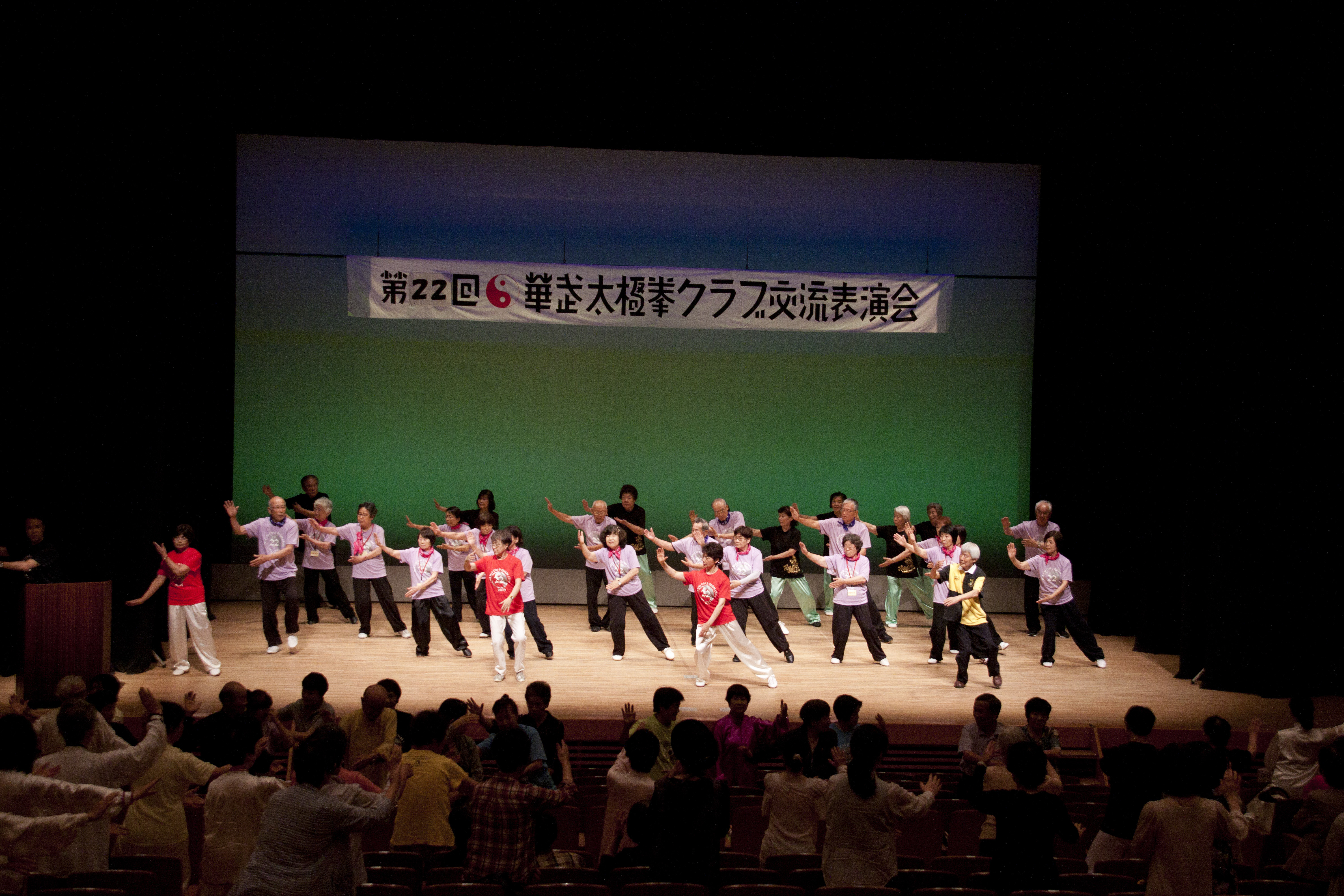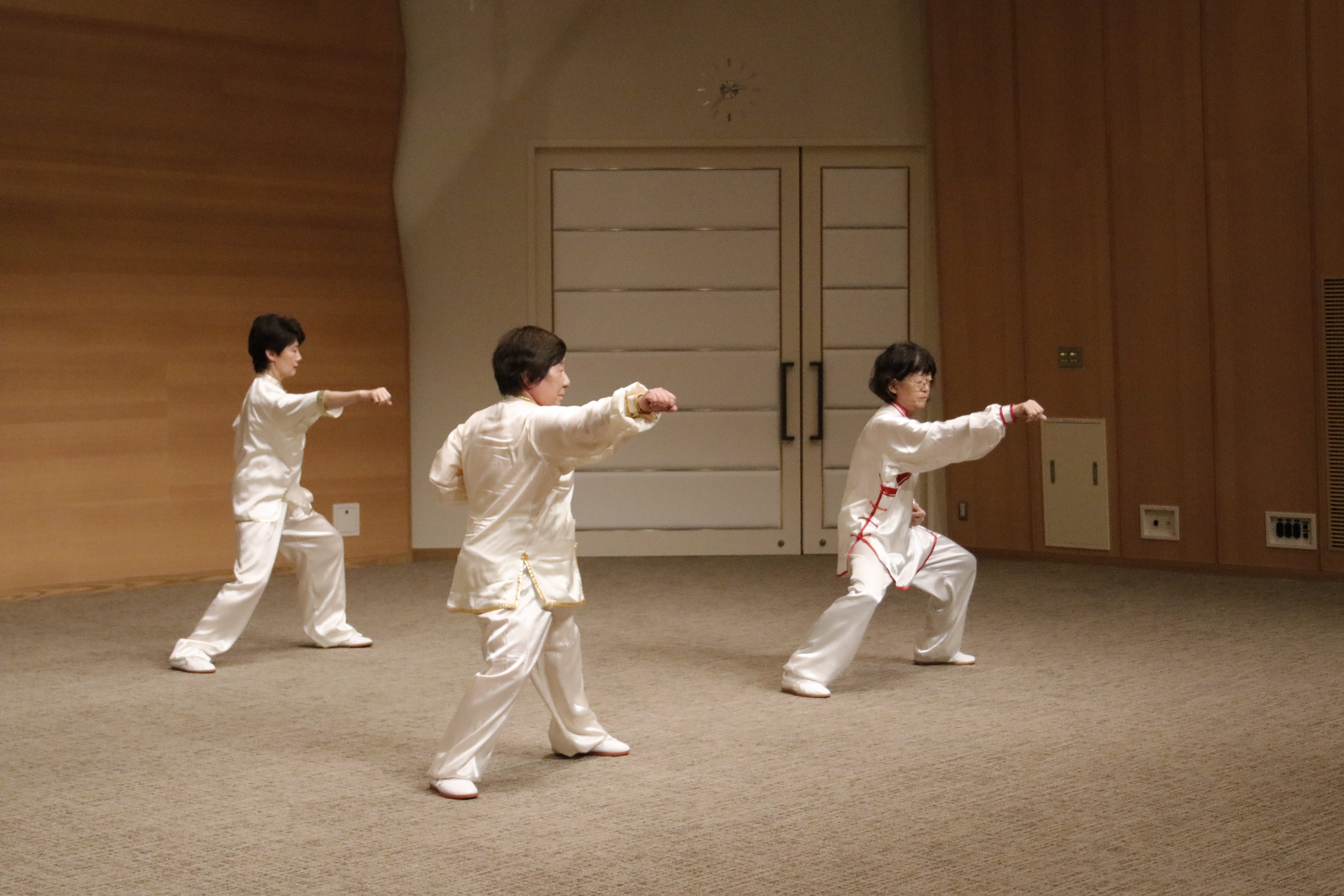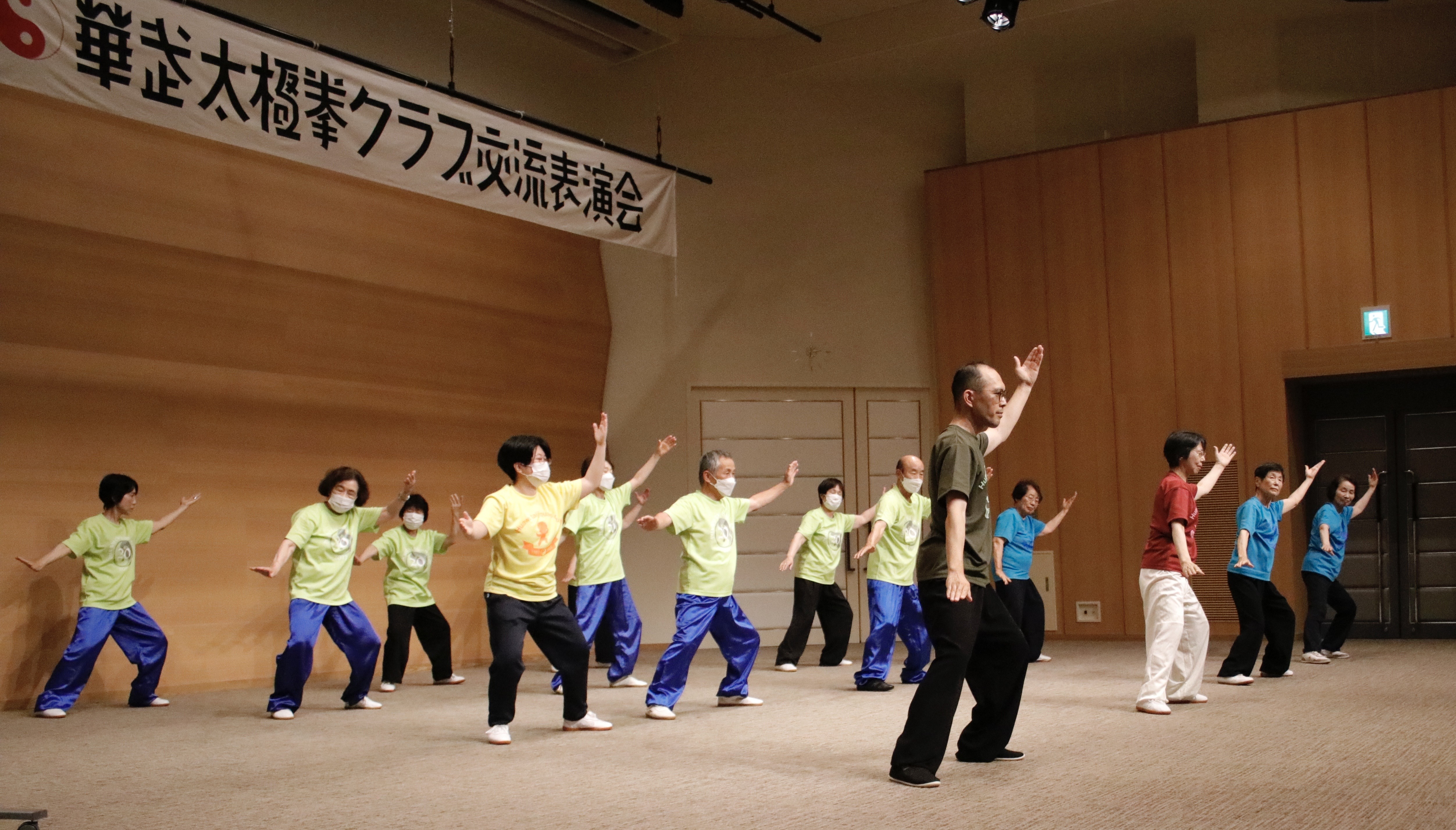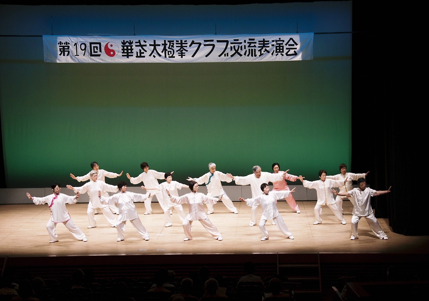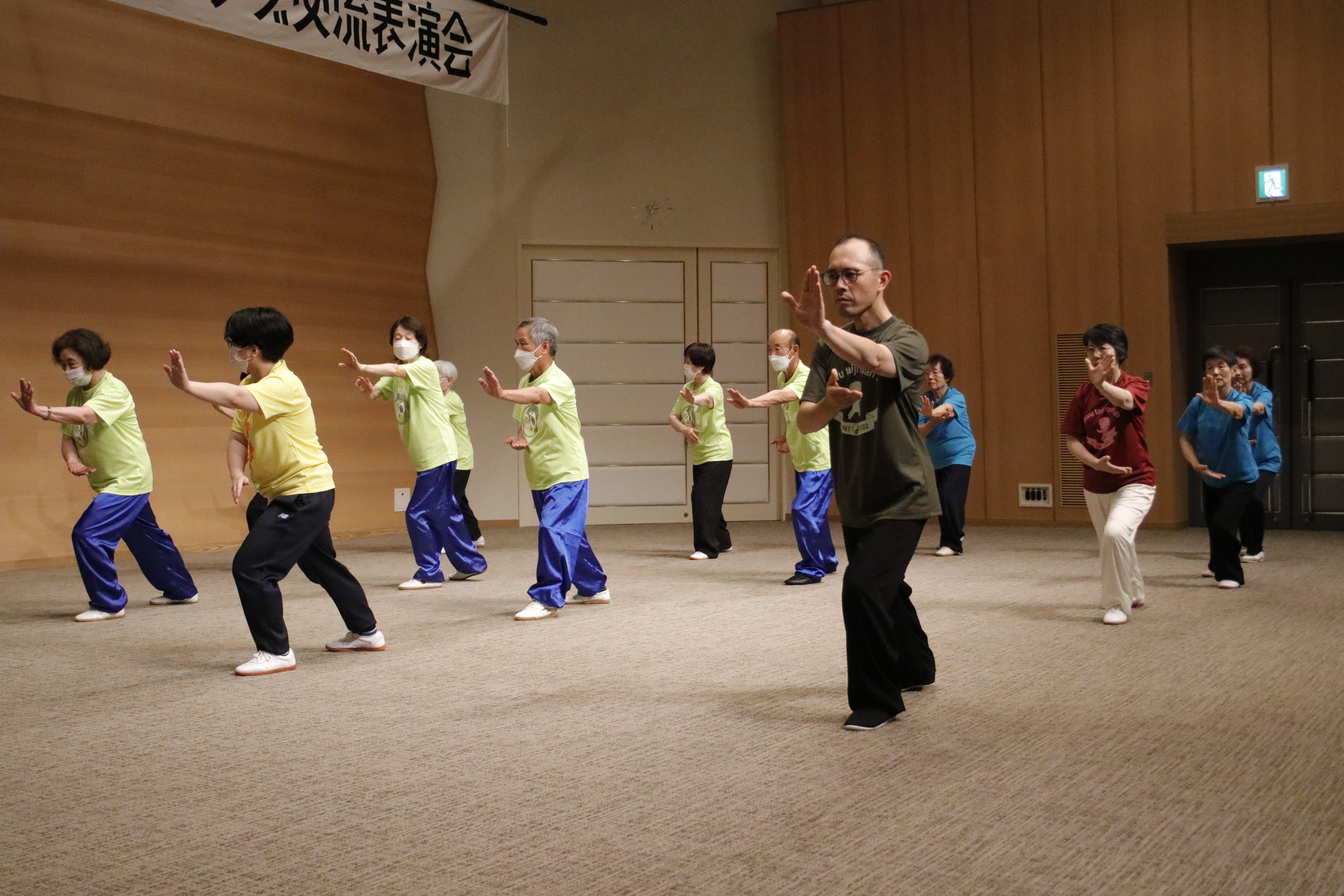参加者の皆さまは、ステージに立つとより一層集中し、普段より真剣な表情で素晴らしい演武を披露されました。今回の表演会では、舞台の広さに合わせて、8名以上の教室はA・B2つのグループに分かれて少人数で演武するよう工夫し、一人ひとりの動きが丁寧に見える演出にしました。