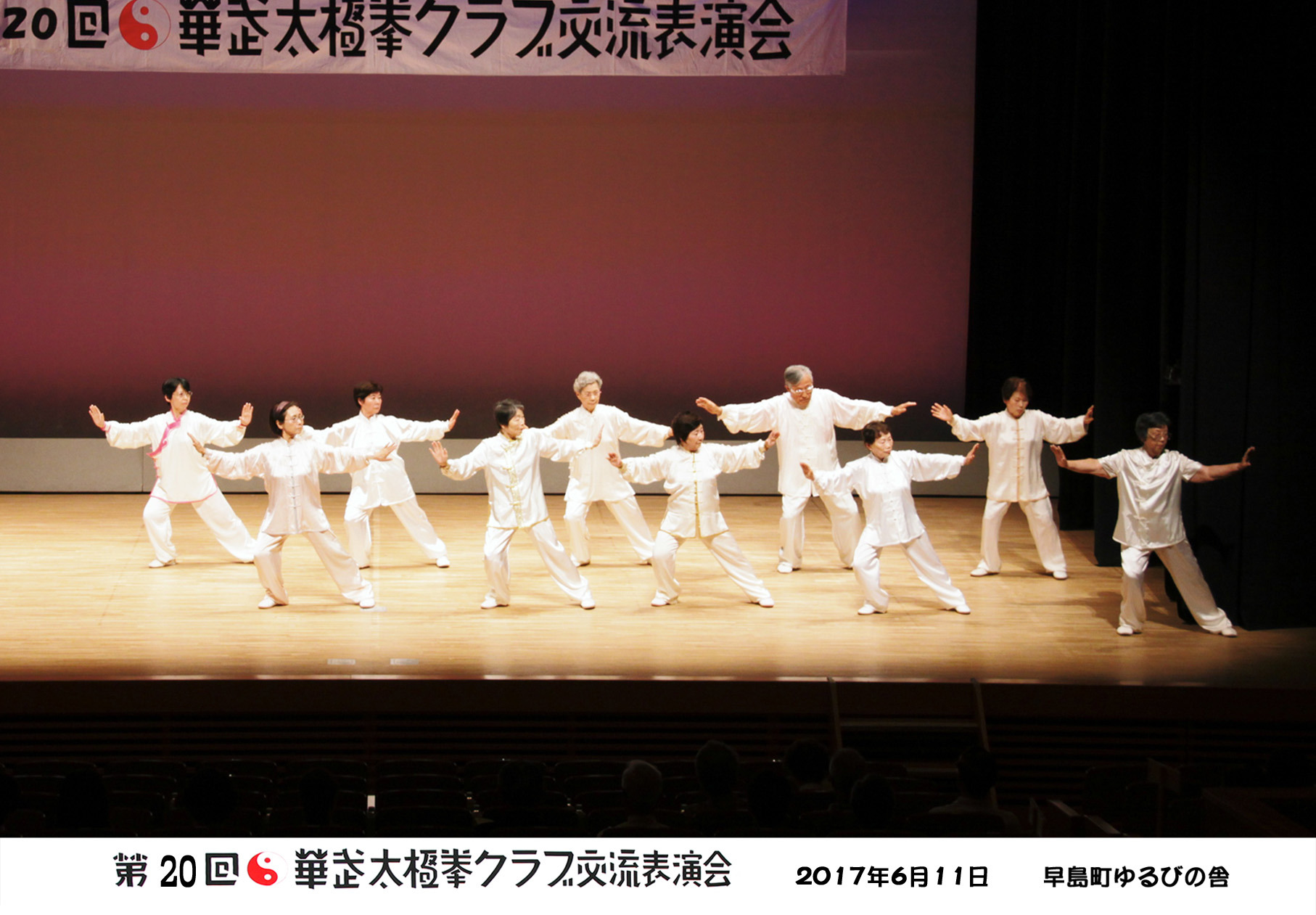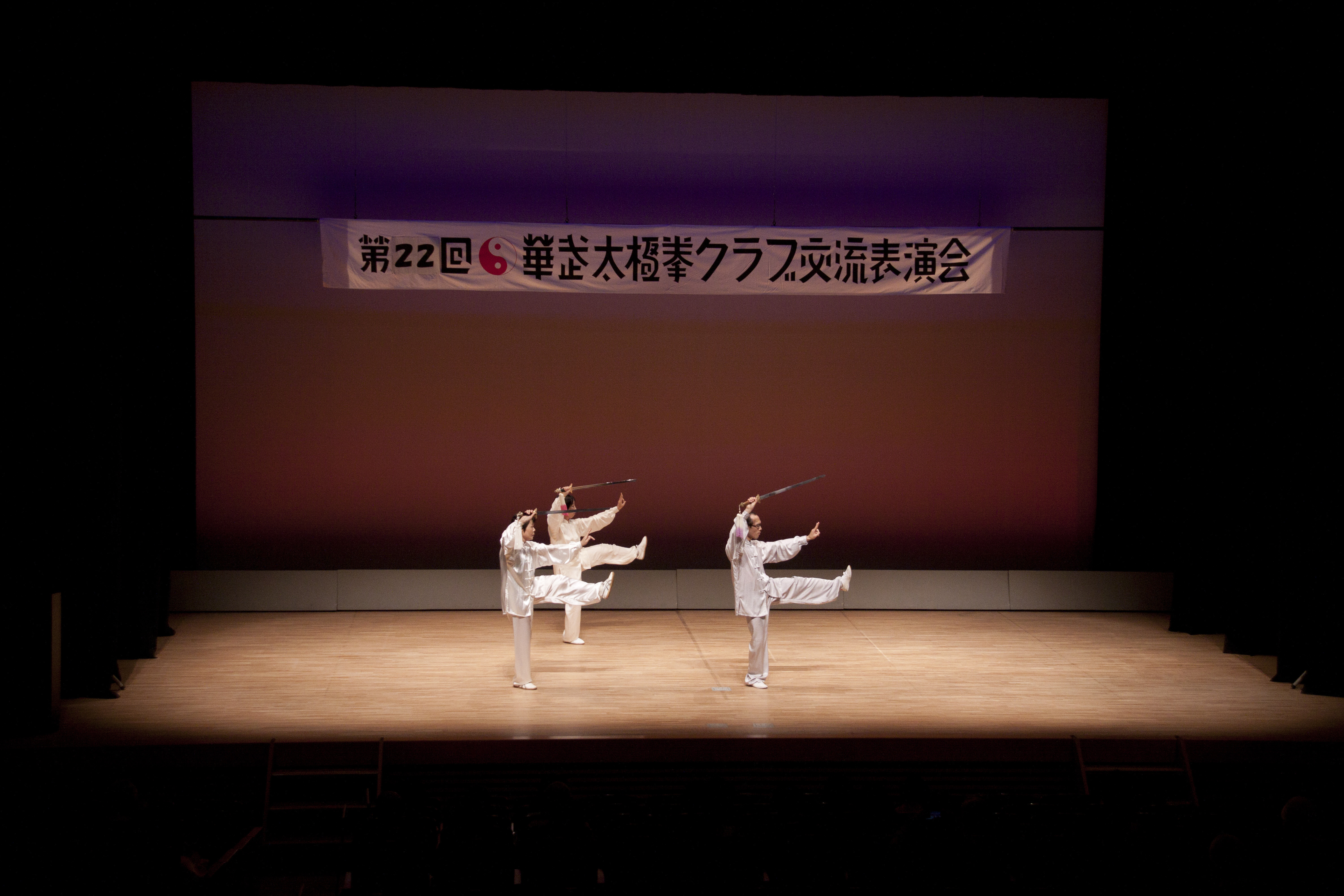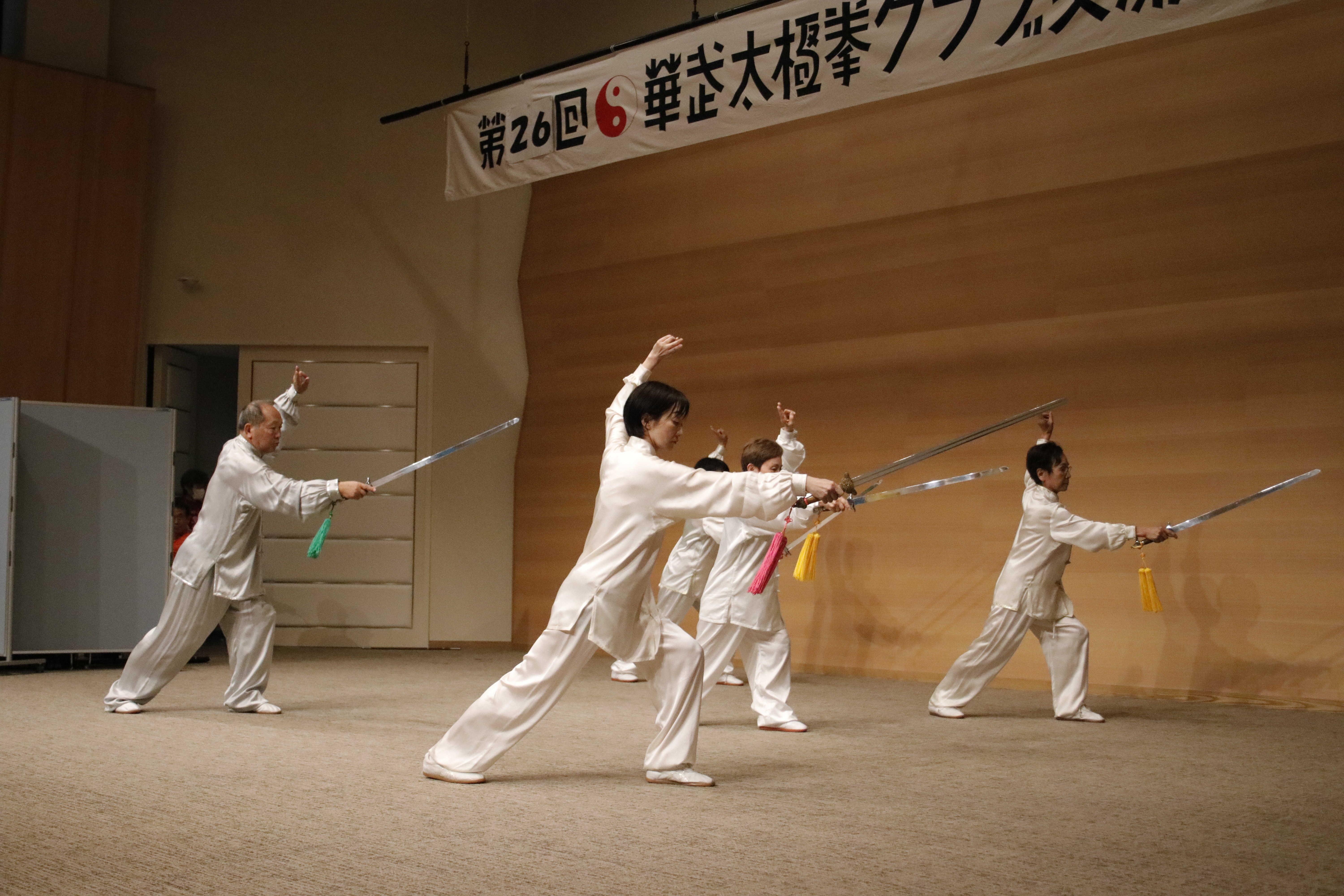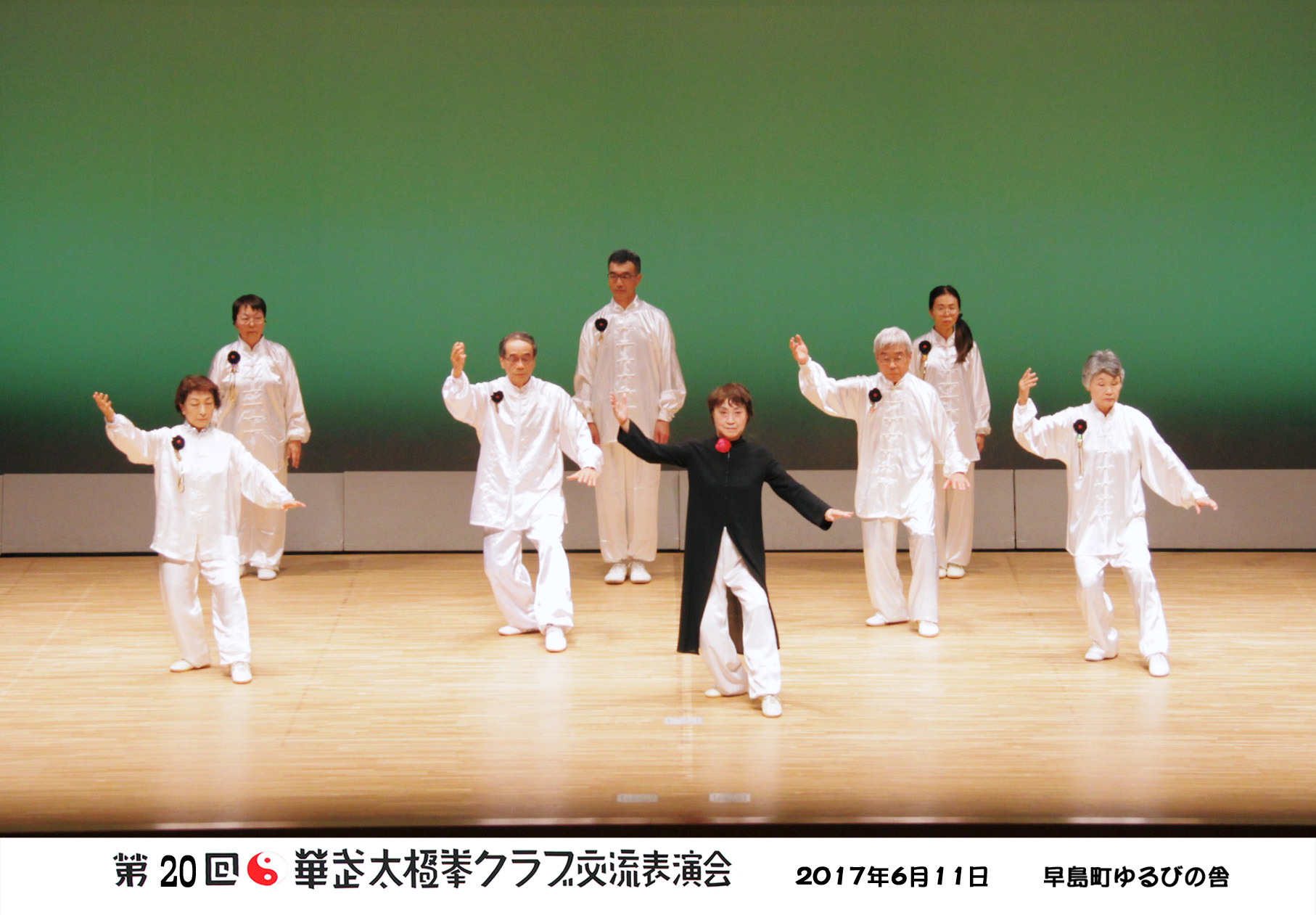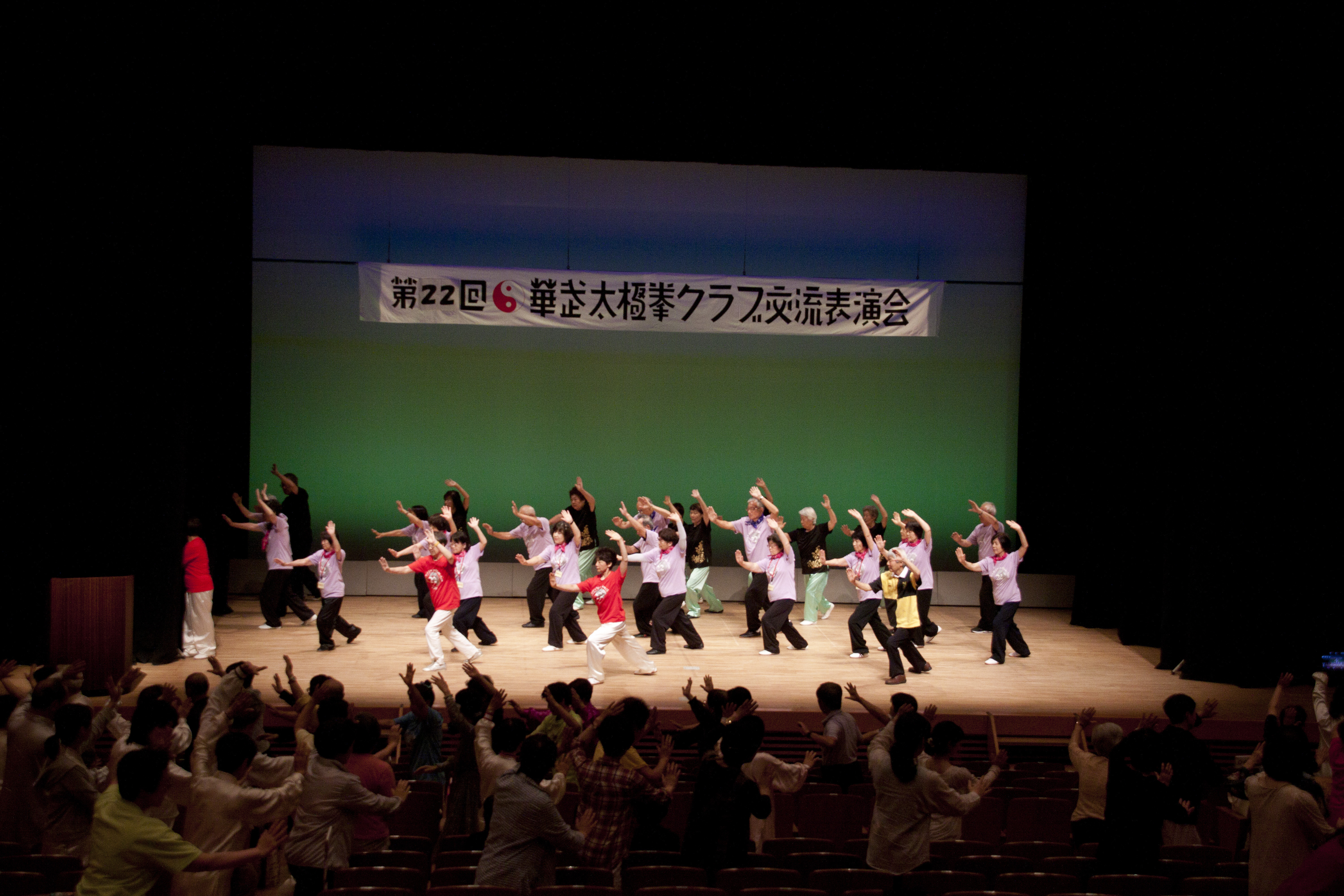 参加者の皆さまは、ステージに立つとより一層集中し、普段より真剣な表情で素晴らしい演武を披露されました。今回の表演会では、舞台の広さに合わせて、8名以上の教室はA・B2つのグループに分かれて少人数で演武するよう工夫し、一人ひとりの動きが丁寧に見える演出にしました。
