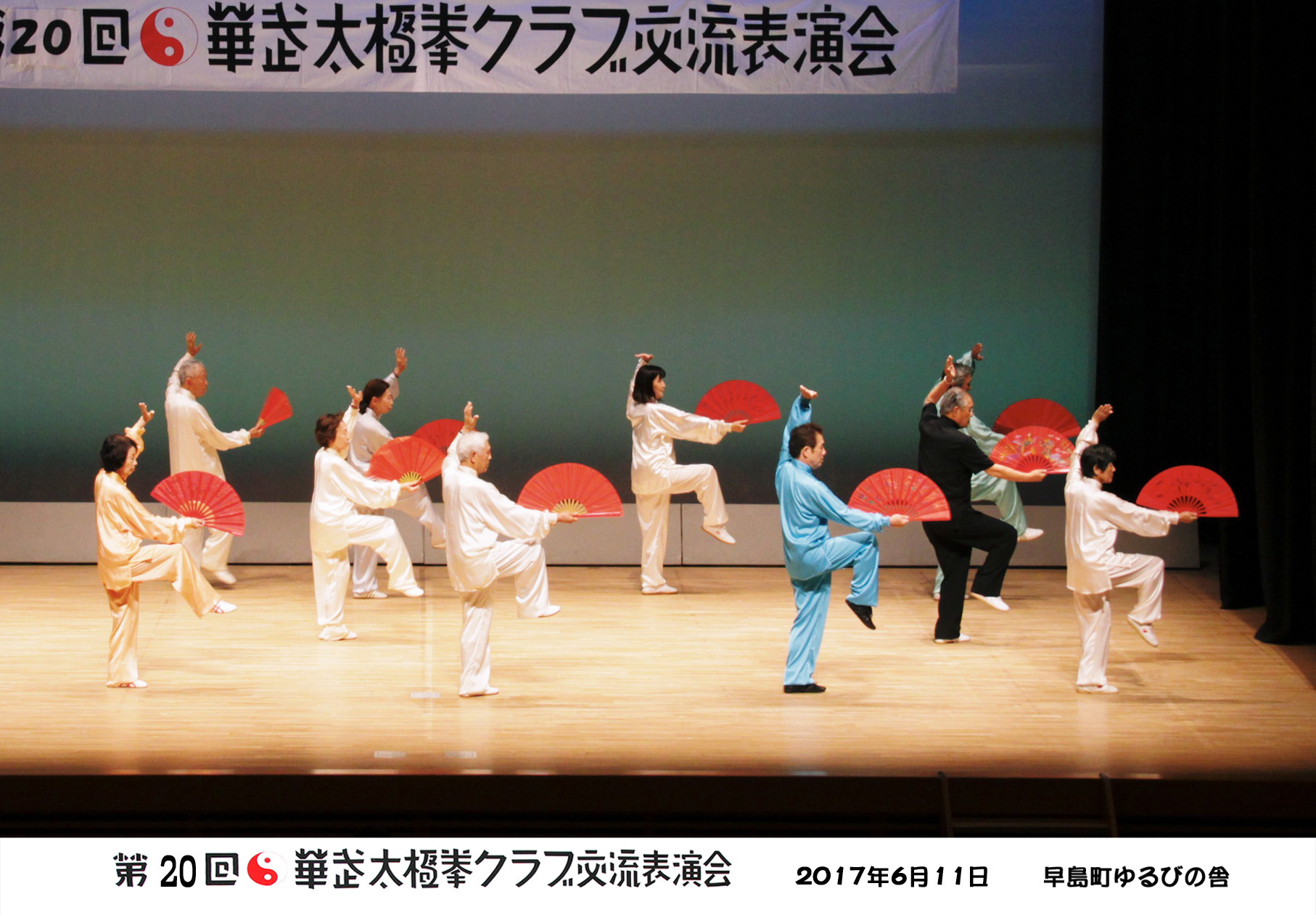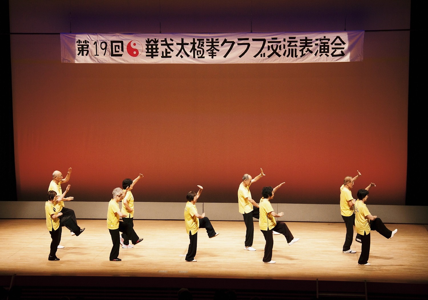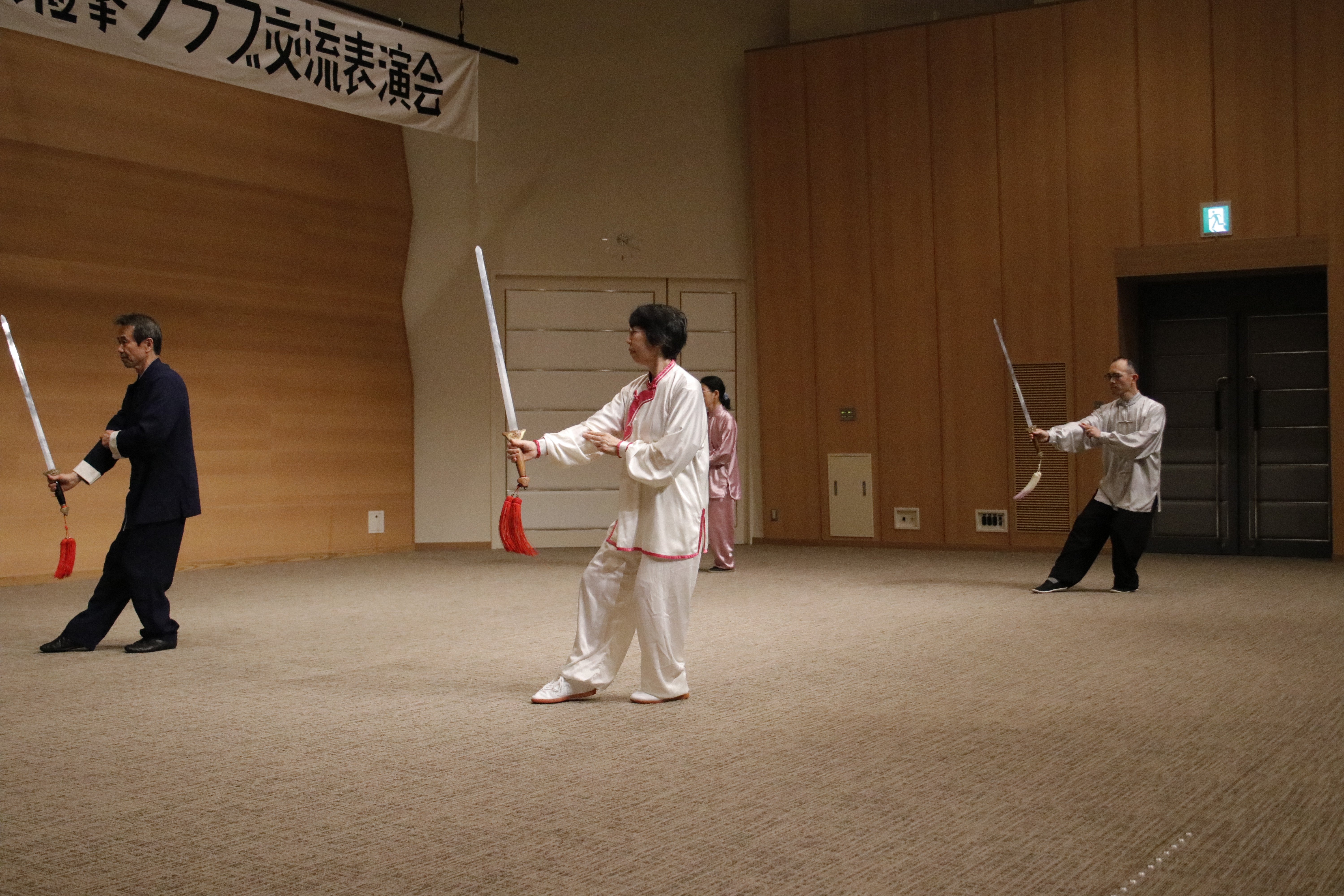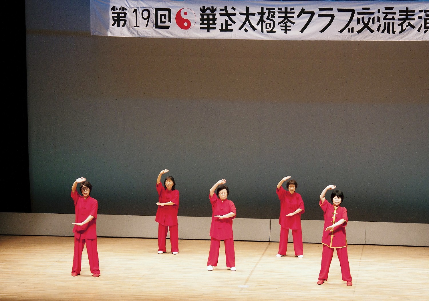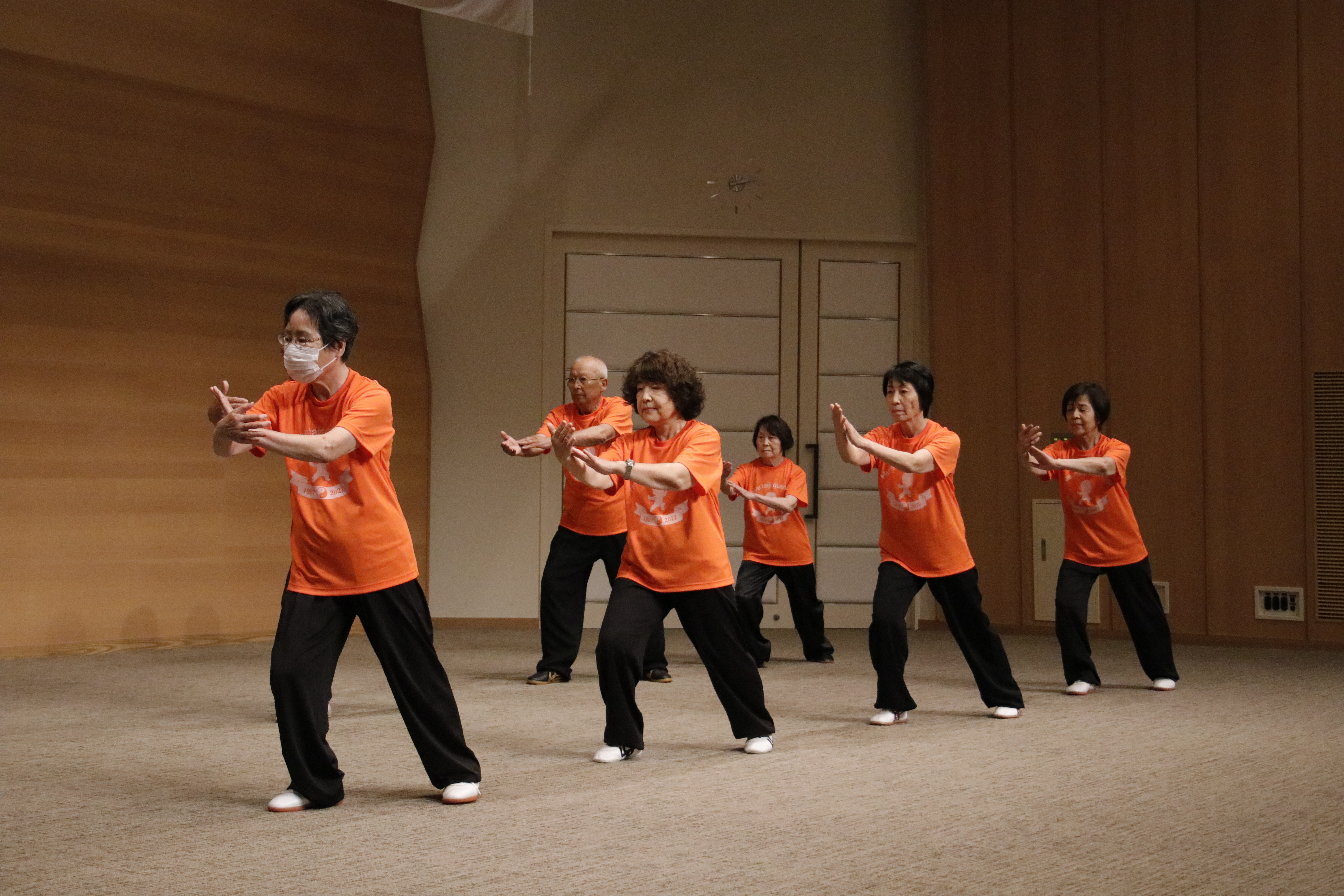 参加者の皆さまは、ステージに立つとより一層集中し、普段より真剣な表情で素晴らしい演武を披露されました。今回の表演会では、舞台の広さに合わせて、8名以上の教室はA・B2つのグループに分かれて少人数で演武するよう工夫し、一人ひとりの動きが丁寧に見える演出にしました。