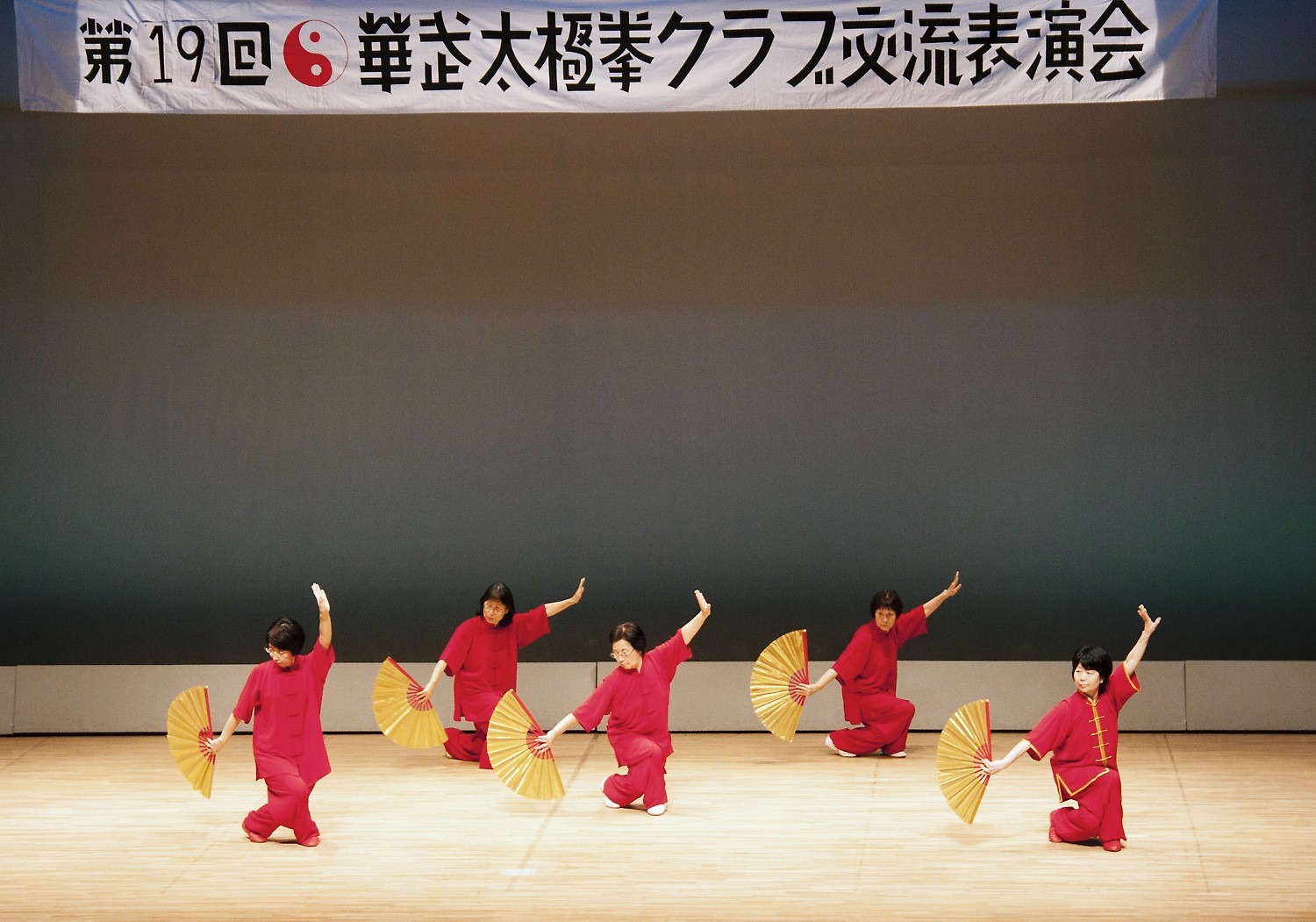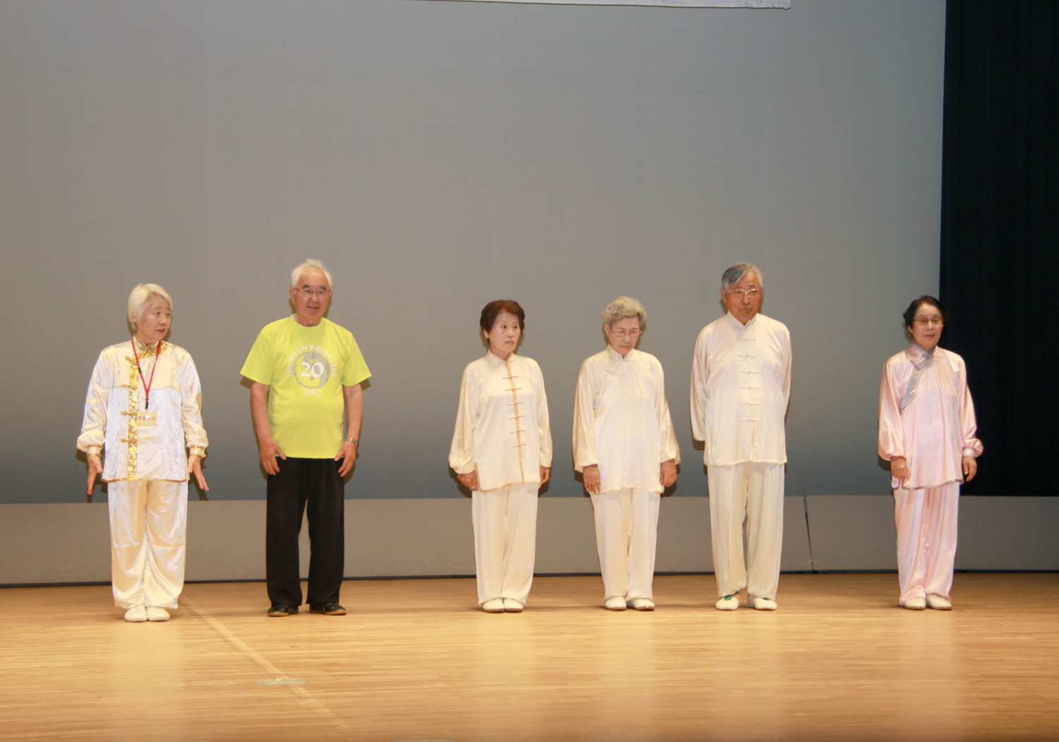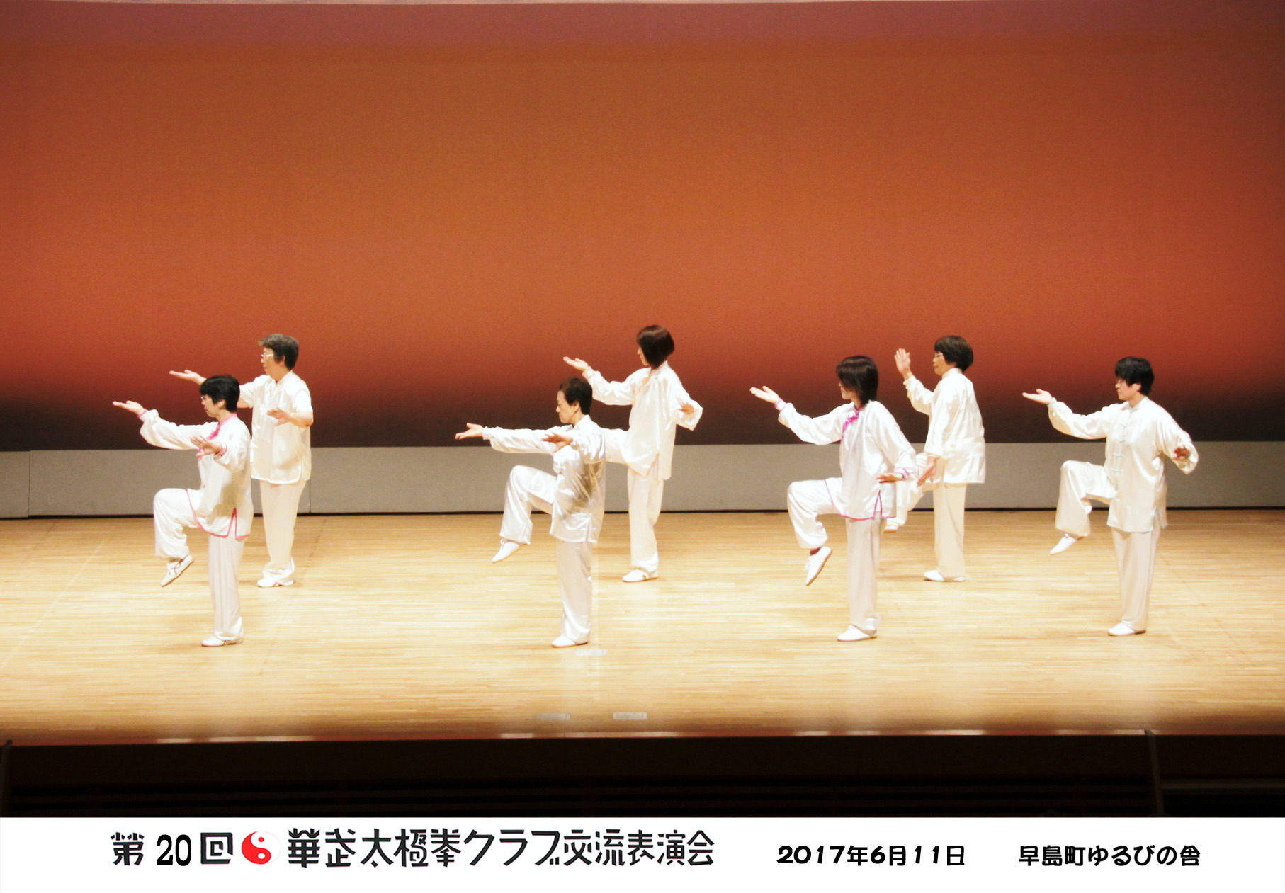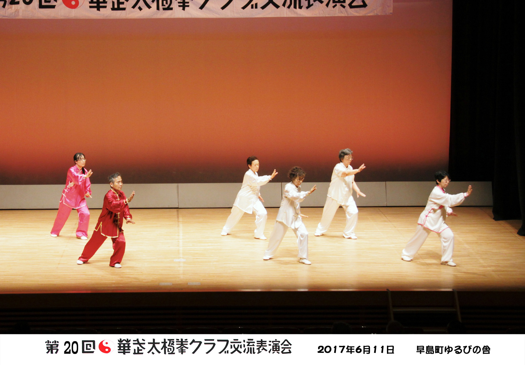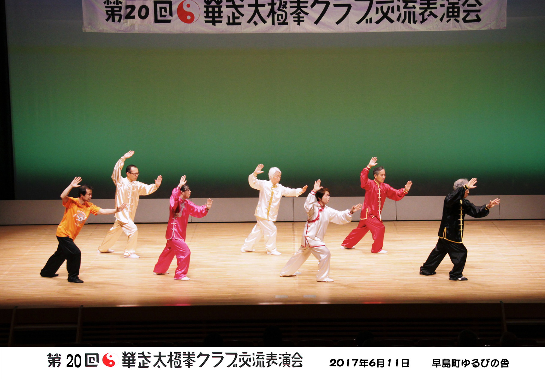 参加者の皆さまは、ステージに立つとより一層集中し、普段より真剣な表情で素晴らしい演武を披露されました。今回の表演会では、舞台の広さに合わせて、8名以上の教室はA・B2つのグループに分かれて少人数で演武するよう工夫し、一人ひとりの動きが丁寧に見える演出にしました。