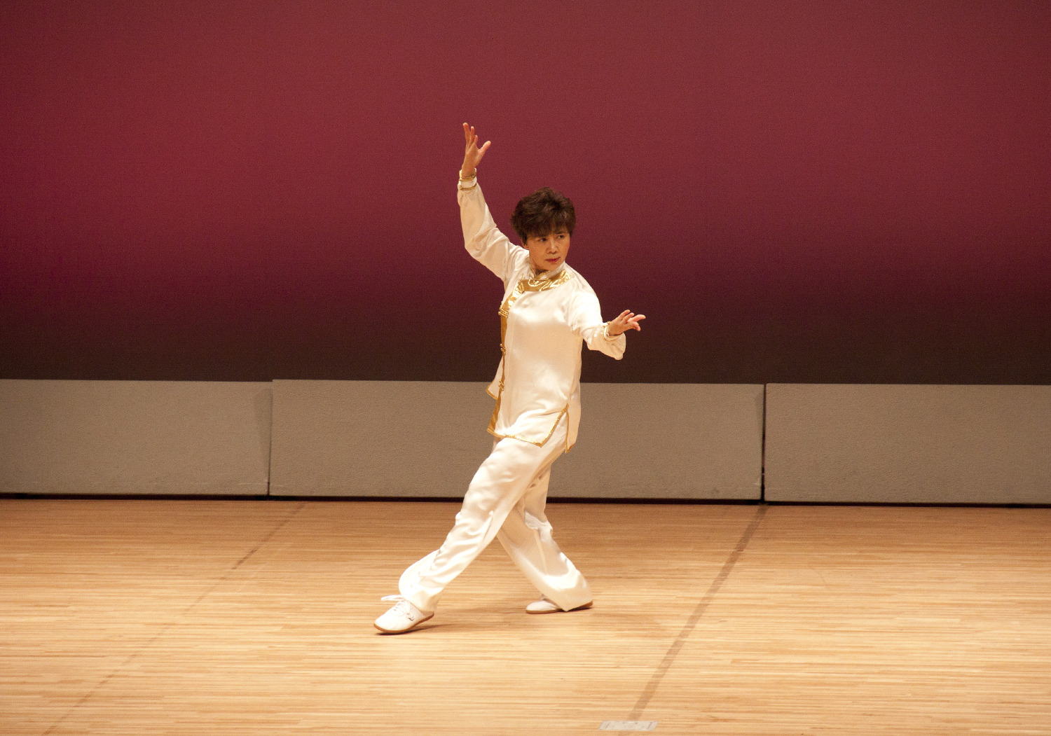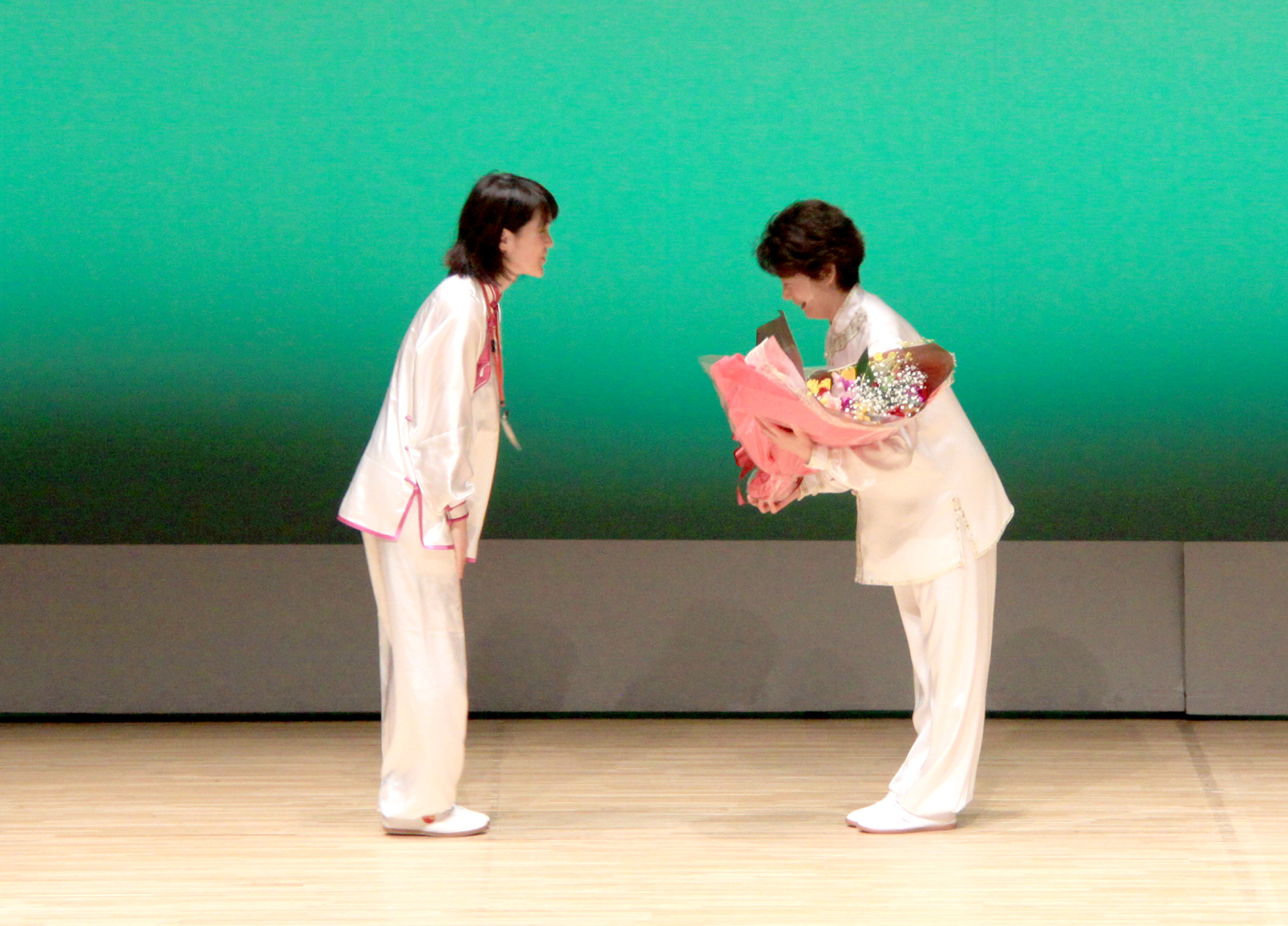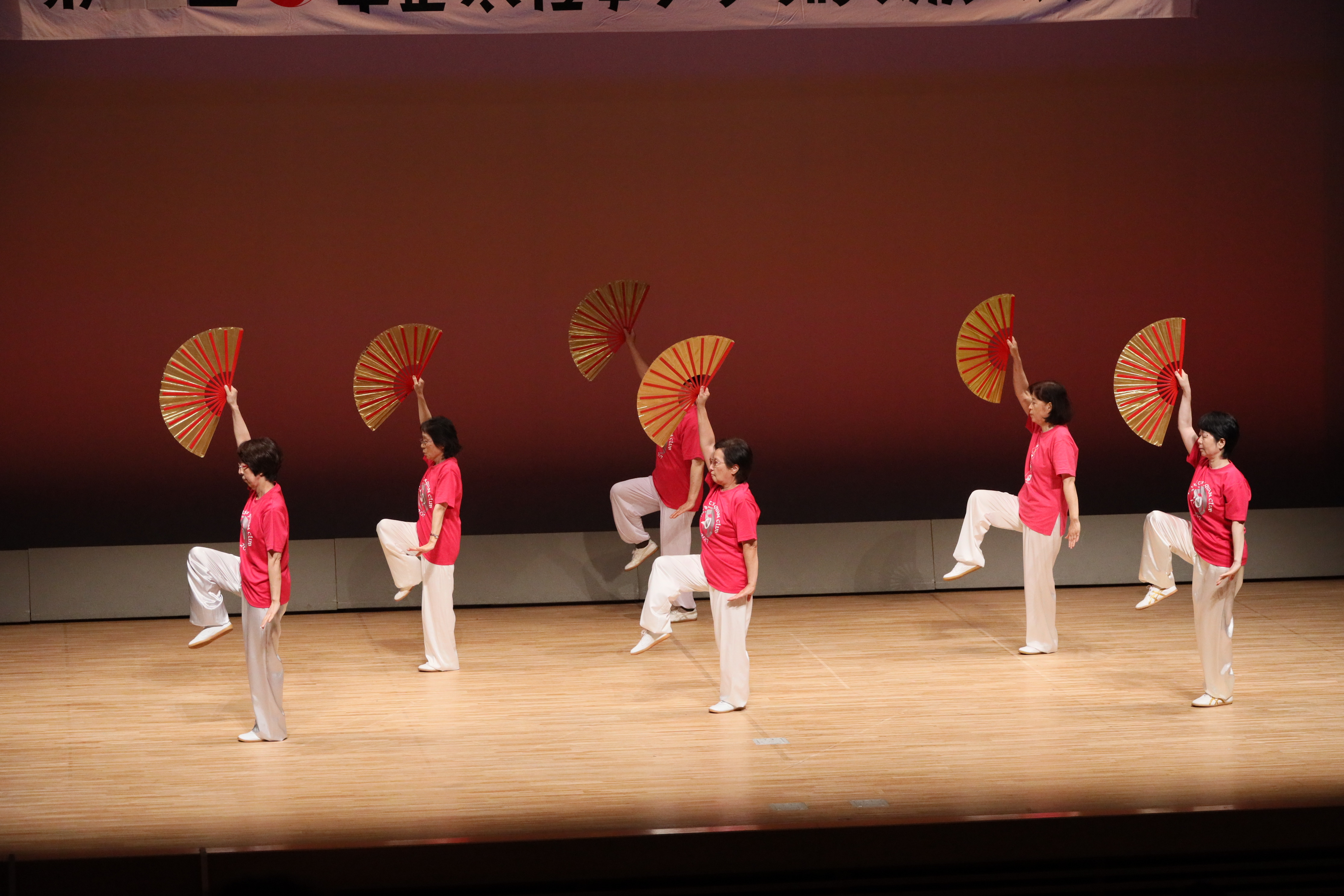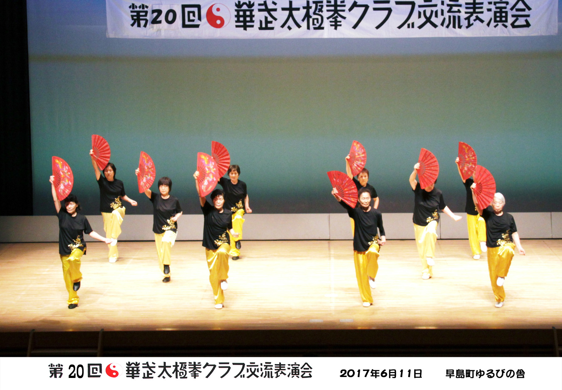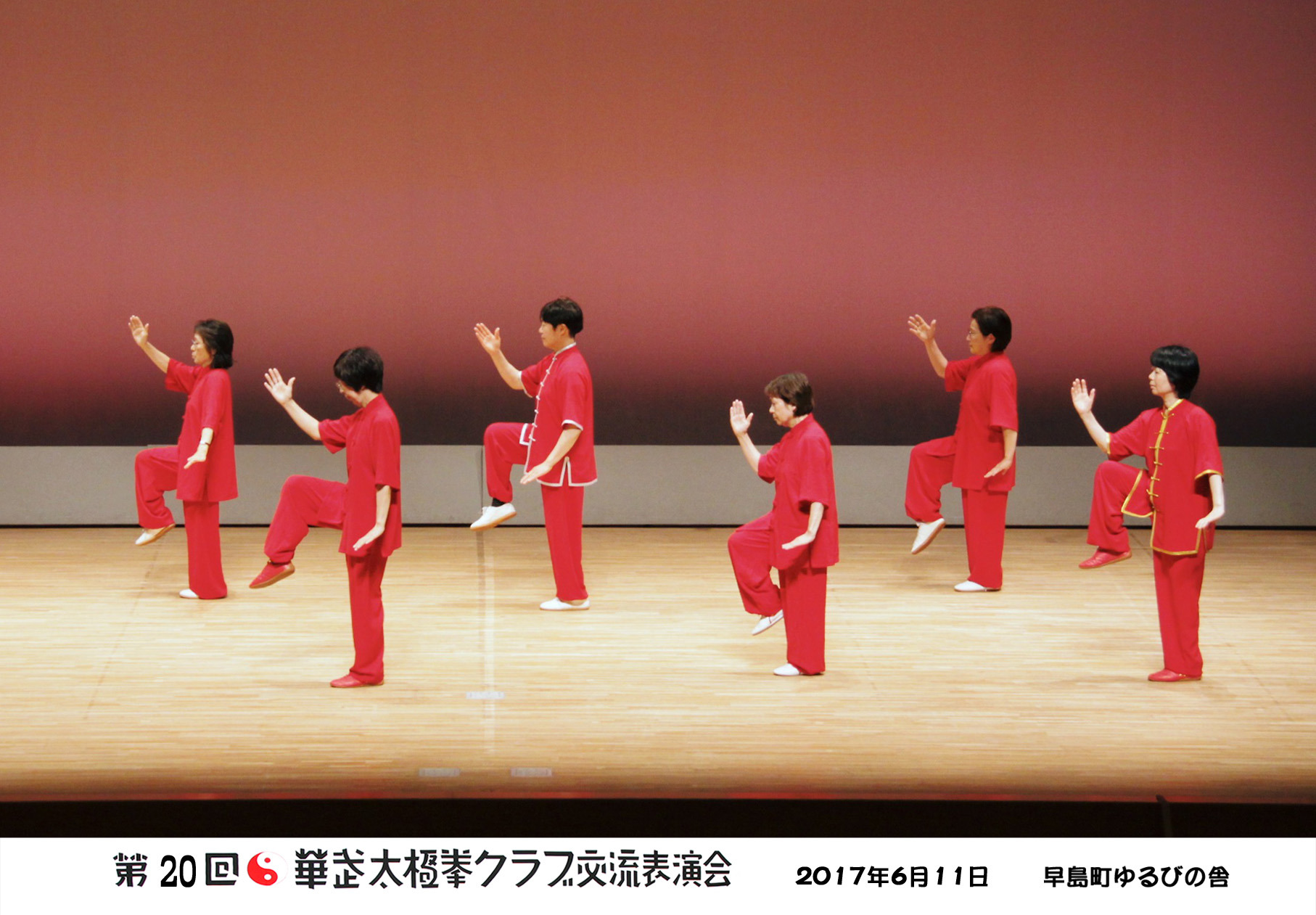 参加者の皆さまは、ステージに立つとより一層集中し、普段より真剣な表情で素晴らしい演武を披露されました。今回の表演会では、舞台の広さに合わせて、8名以上の教室はA・B2つのグループに分かれて少人数で演武するよう工夫し、一人ひとりの動きが丁寧に見える演出にしました。