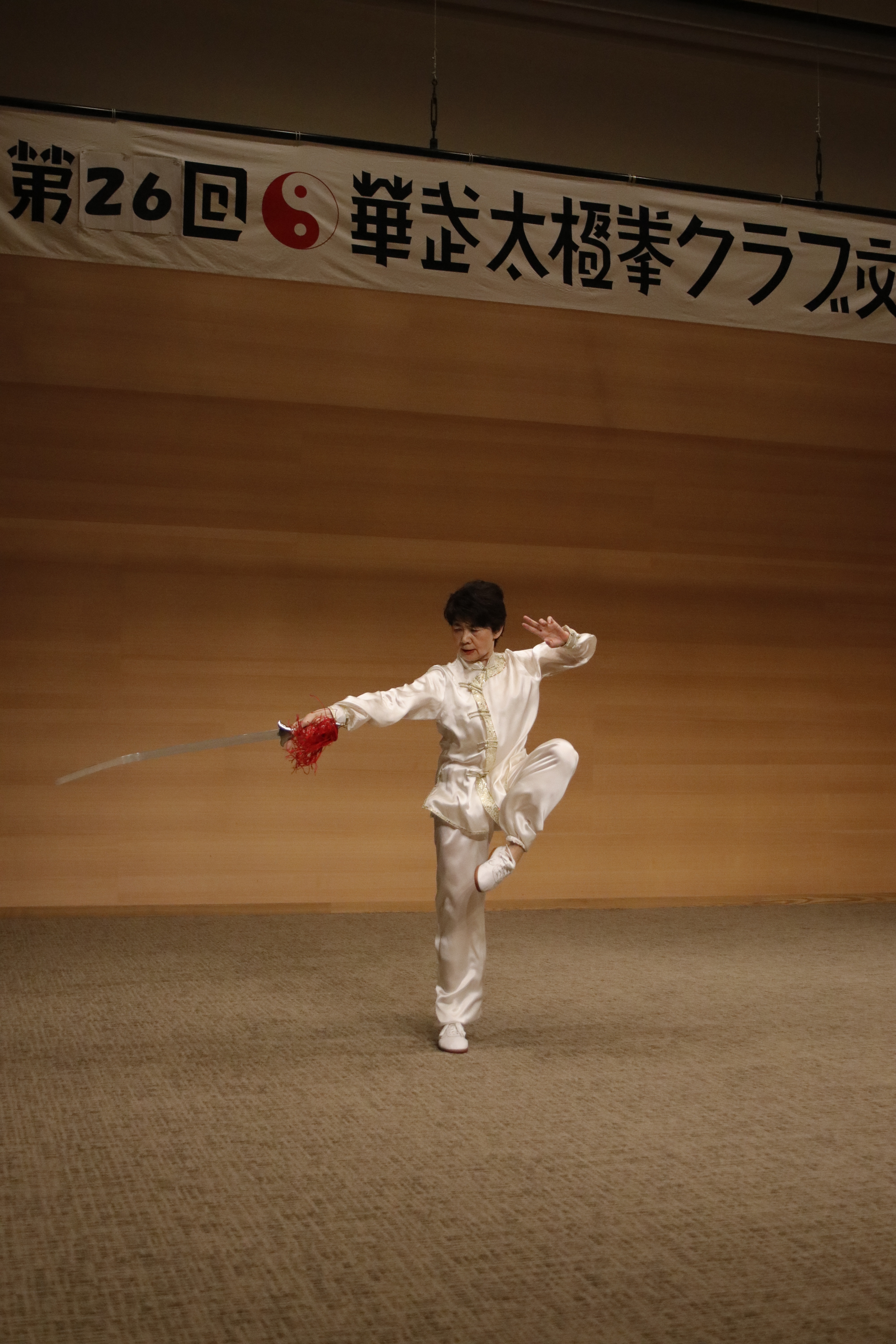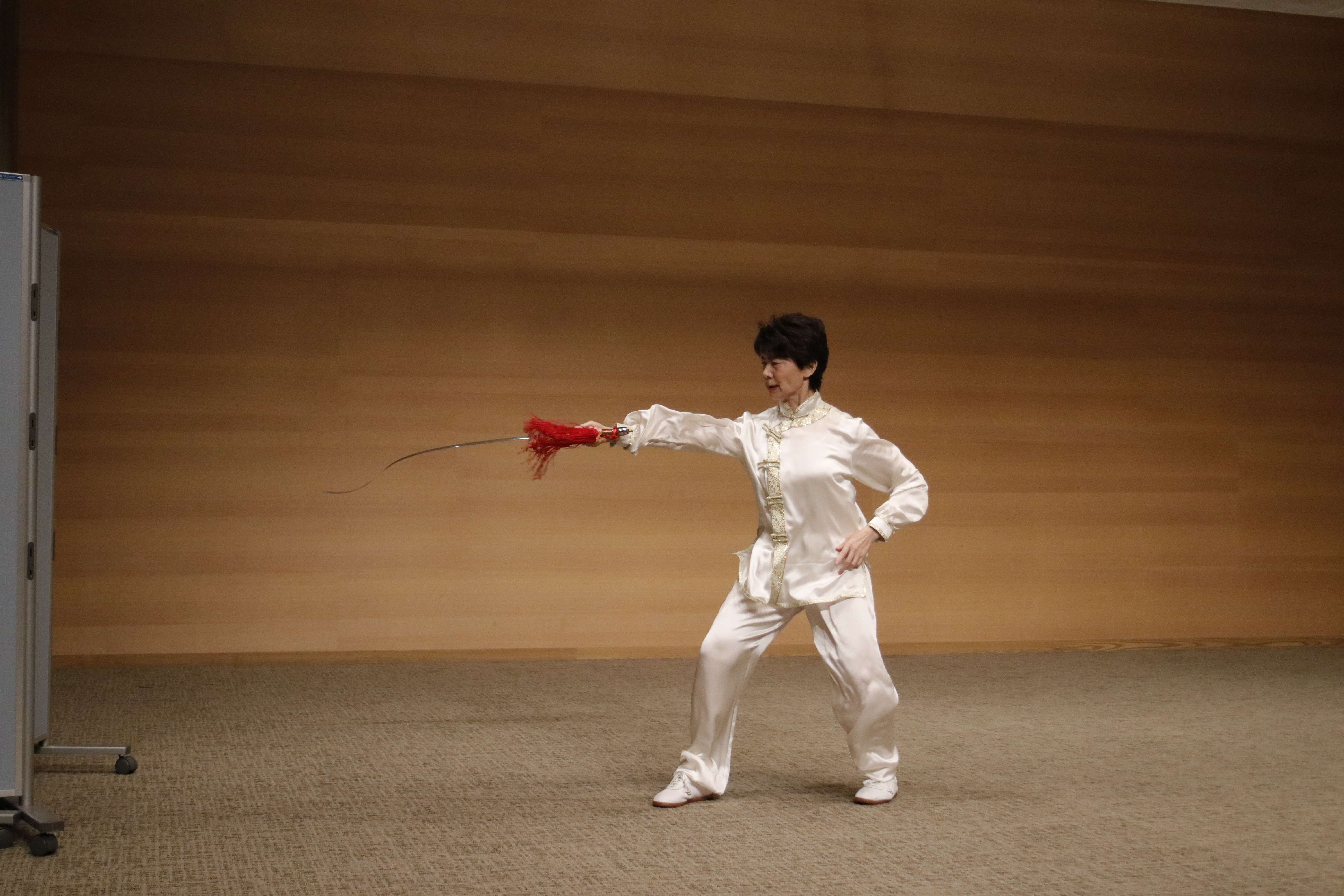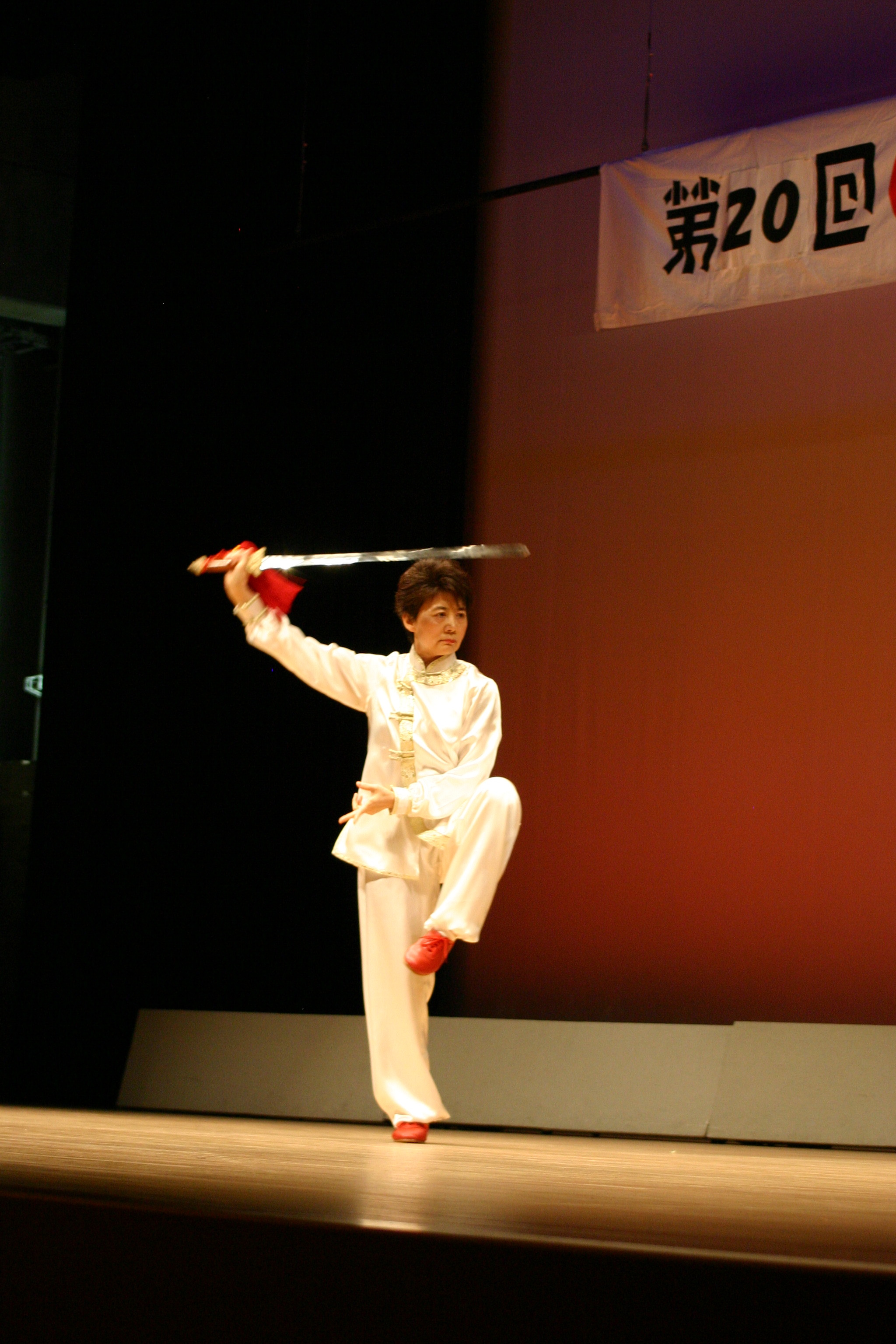 堂々とステージに立つと、多くの拍手が送られました。姿勢が良くて、下半身も安定して、年齢を感じさせない演武でした。